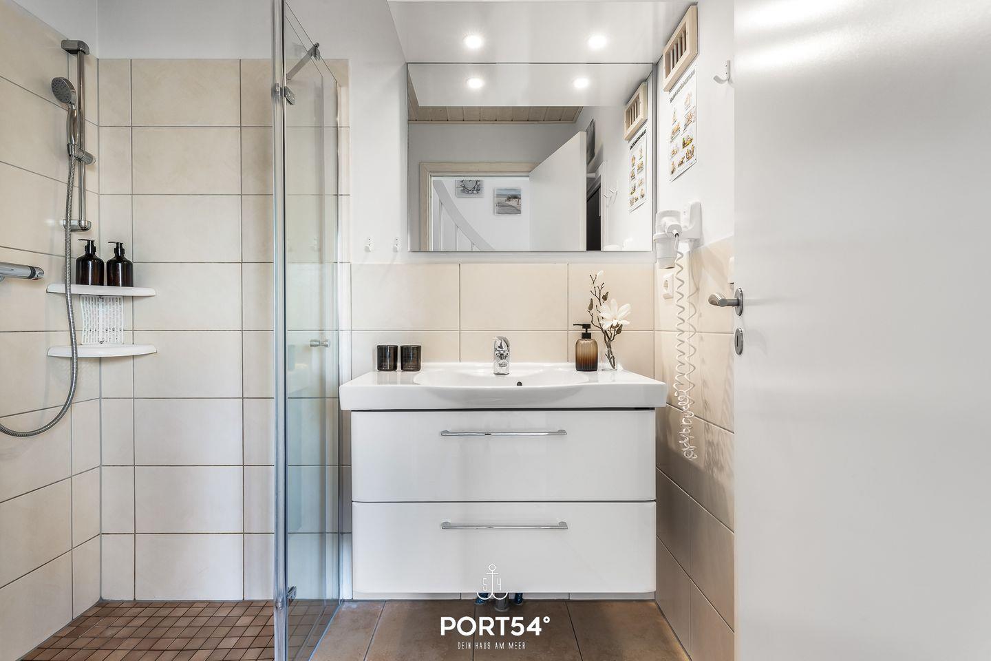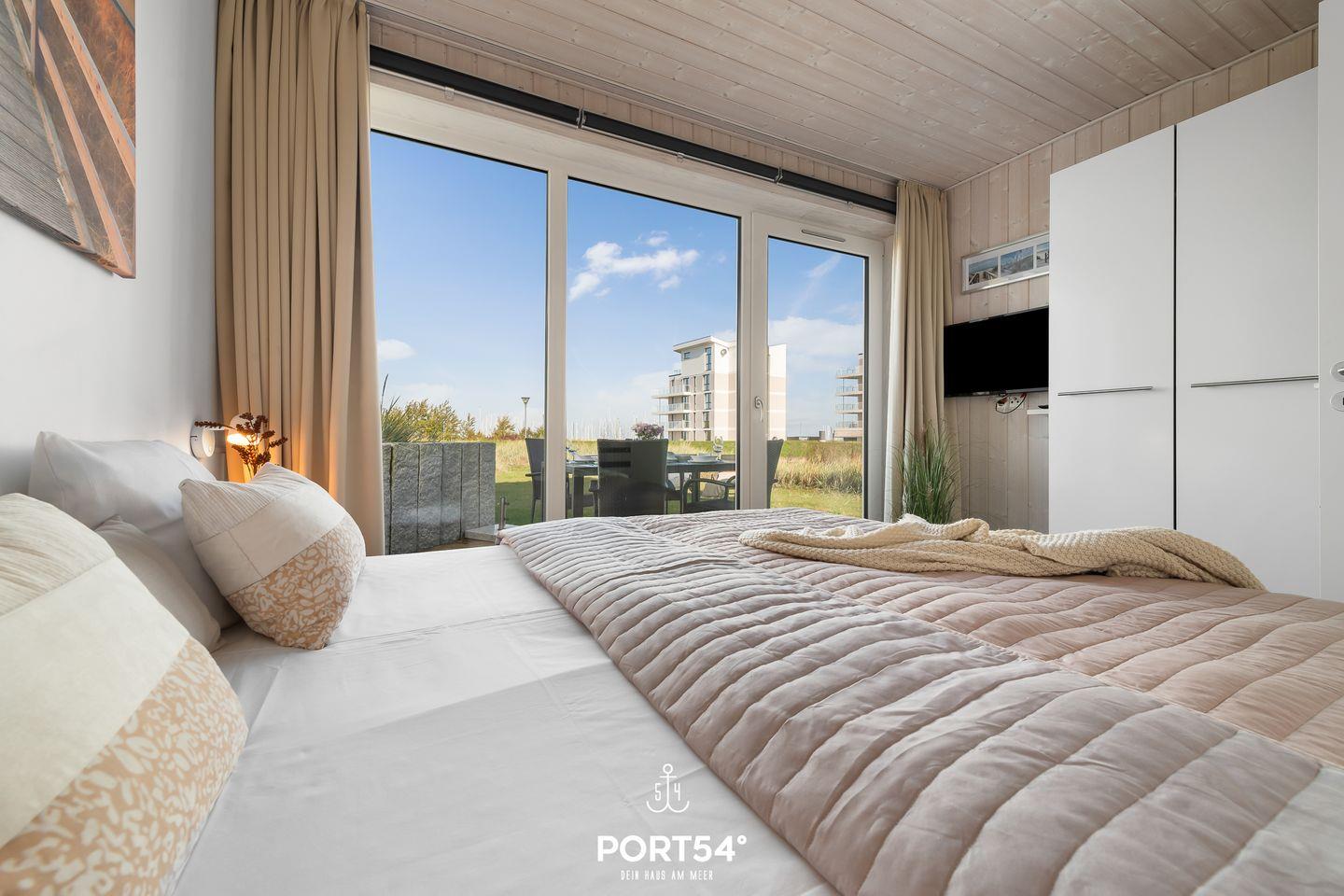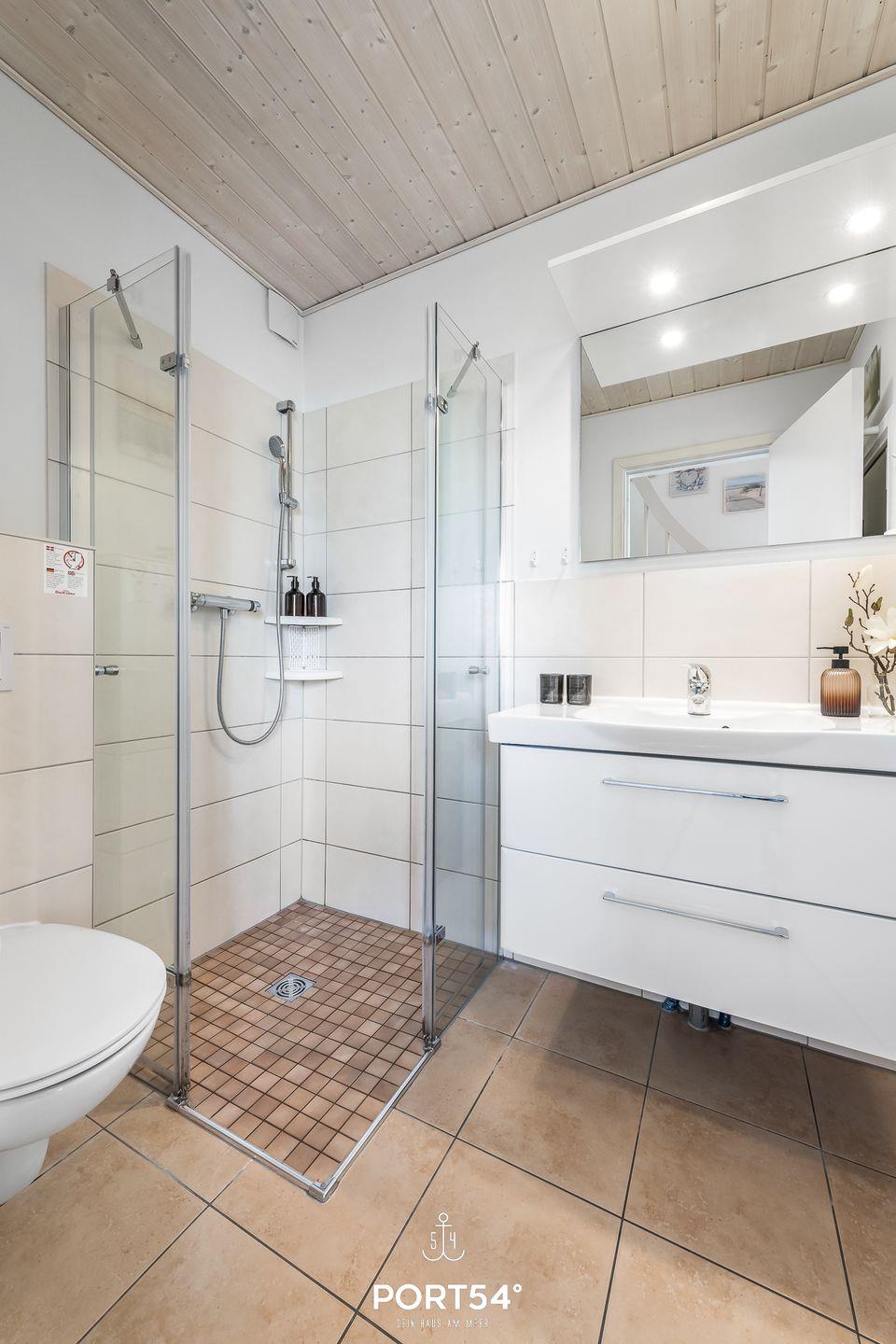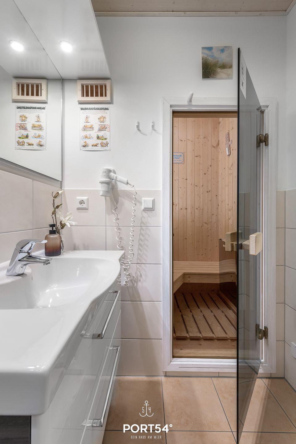 Im Erdgeschoss befinden sich zwei Schlafzimmer. Eines davon bietet ein neues und hochwertiges Doppelboxspringbett (180x200cm) und das andere zwei einzelne, neue und hochwertige Boxspringbetten (je 90x200cm). Eines der Schlafzimmer verfügt über einen TV sowie beide über verdunkelbare Fenster. Ebenfalls im Erdgeschoss gelegen findest du das Badezimmer mit Fußbodenheizung, ebenerdiger Dusche, WC, Waschbecken und Trockensauna.