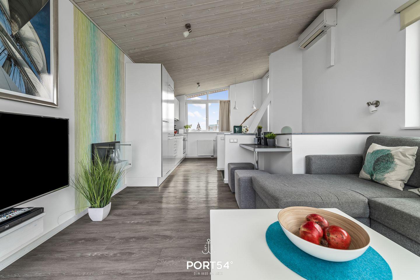 Im Obergeschoss erwartet Sie ein offener, lichtdurchfluteter Wohn- und Essbereich mit angrenzender vollausgestatteter Küche. Der gemütliche Wohnbereich bietet ausreichend Sitzgelegenheiten, einen 50-Zoll-SmartTV, einen Bioethanol-Kamin und den Zugang zum Balkon. Die vorhandene Klimaanlage verspricht ein angenehmes Innenraumklima zu jeder Zeit.