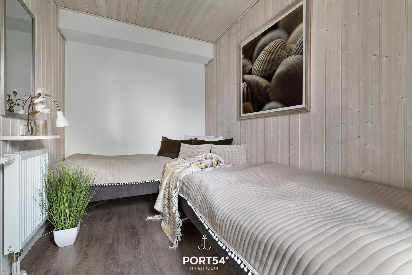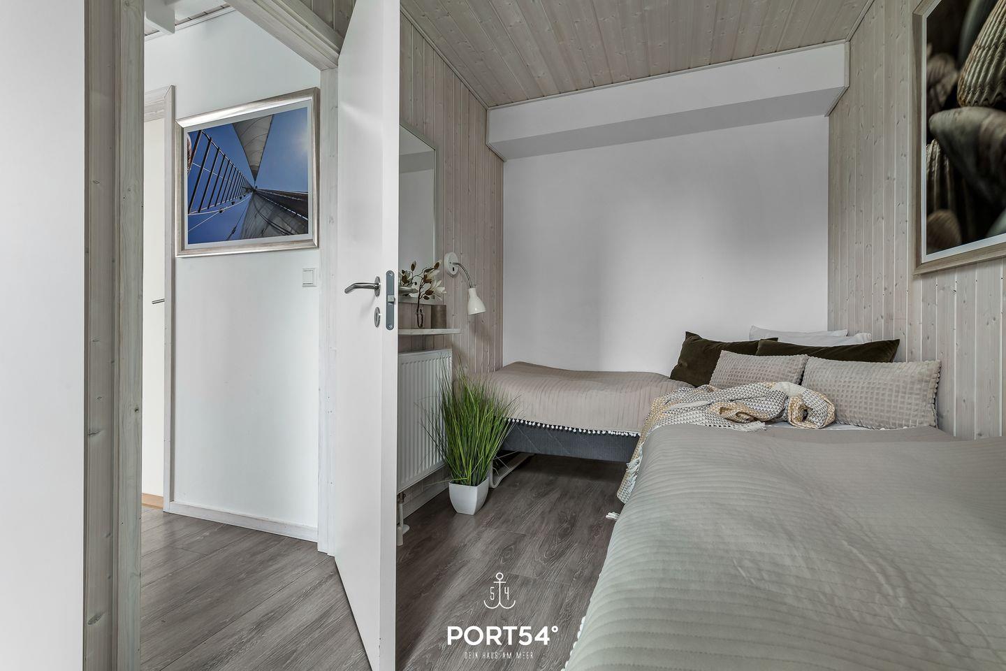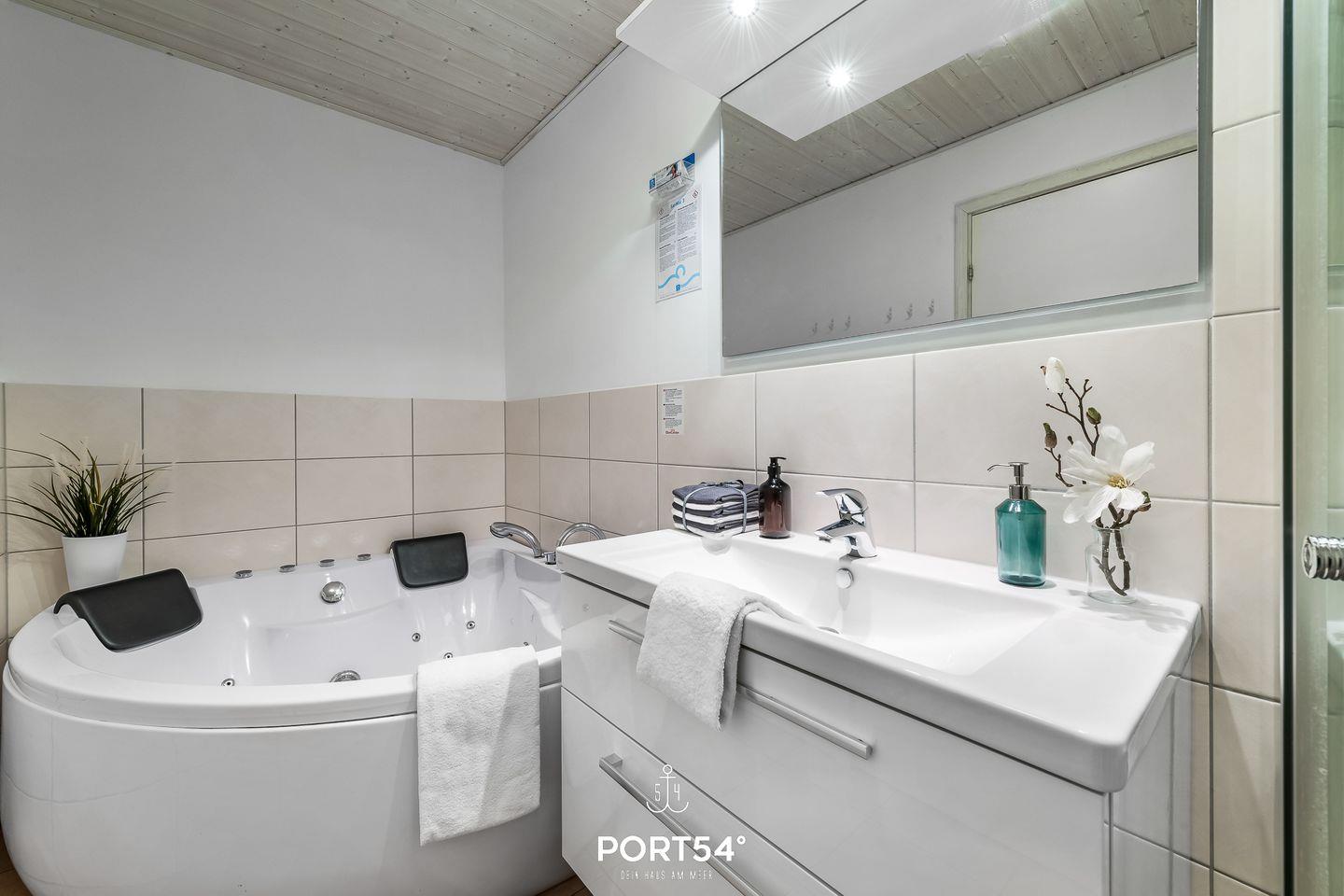 Im Erdgeschoss befinden sich zwei Schlafzimmer. Eines davon bietet zwei zusammengeschobene Einzelbetten (zusammen 180x200cm) und das andere zwei Einzelbetten (je 90x200cm). Eines der Schlafzimmer verfügt über einen TV, sowie beide über verdunkelbare Fenster. Ebenfalls im Erdgeschoss gelegen: das Badezimmer mit Fußbodenheizung, ebenerdiger Dusche, WC, Waschbecken und Whirlpool.