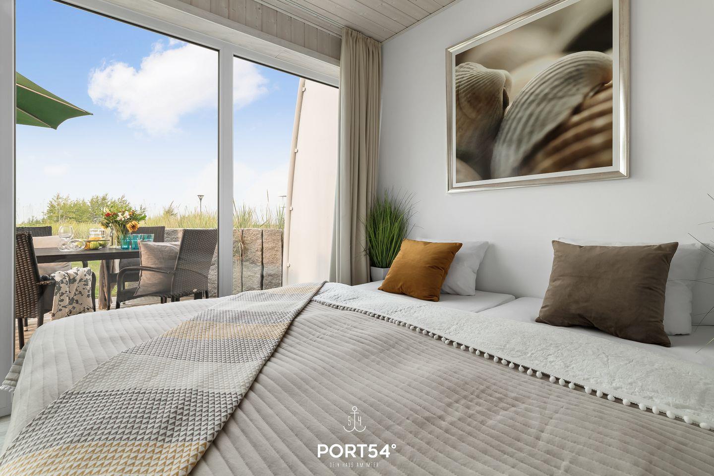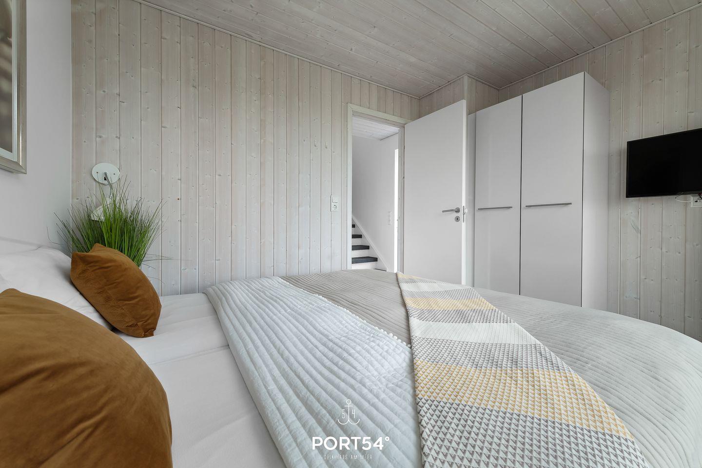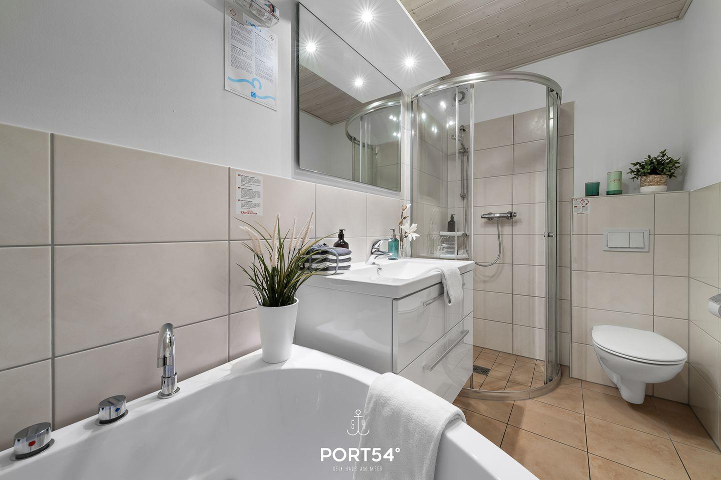 Im Erdgeschoss befinden sich zwei Schlafzimmer. Eines davon bietet zwei zusammengeschobene Einzelbetten (zusammen 180x200cm) und das andere zwei Einzelbetten (je 90x200cm). Eines der Schlafzimmer verfügt über einen TV, sowie beide über verdunkelbare Fenster. Ebenfalls im Erdgeschoss gelegen: das Badezimmer mit Fußbodenheizung, ebenerdiger Dusche, WC, Waschbecken und Whirlpool.