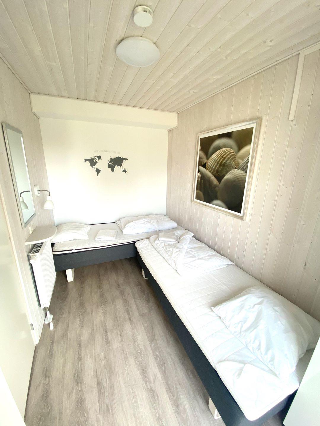 Im Erdgeschoss befinden sich zwei Schlafzimmer. Eines davon bietet zwei zusammengeschobene Einzelbetten (zusammen 180x200cm) und das andere zwei Einzelbetten (je 90x200cm). Eines der Schlafzimmer verfügt über einen TV, sowie beide über verdunkelbare Fenster. Ebenfalls im Erdgeschoss gelegen: das Badezimmer mit angenehmer Fußbodenheizung, ebenerdiger Dusche, WC, Waschbecken und Trockensauna.