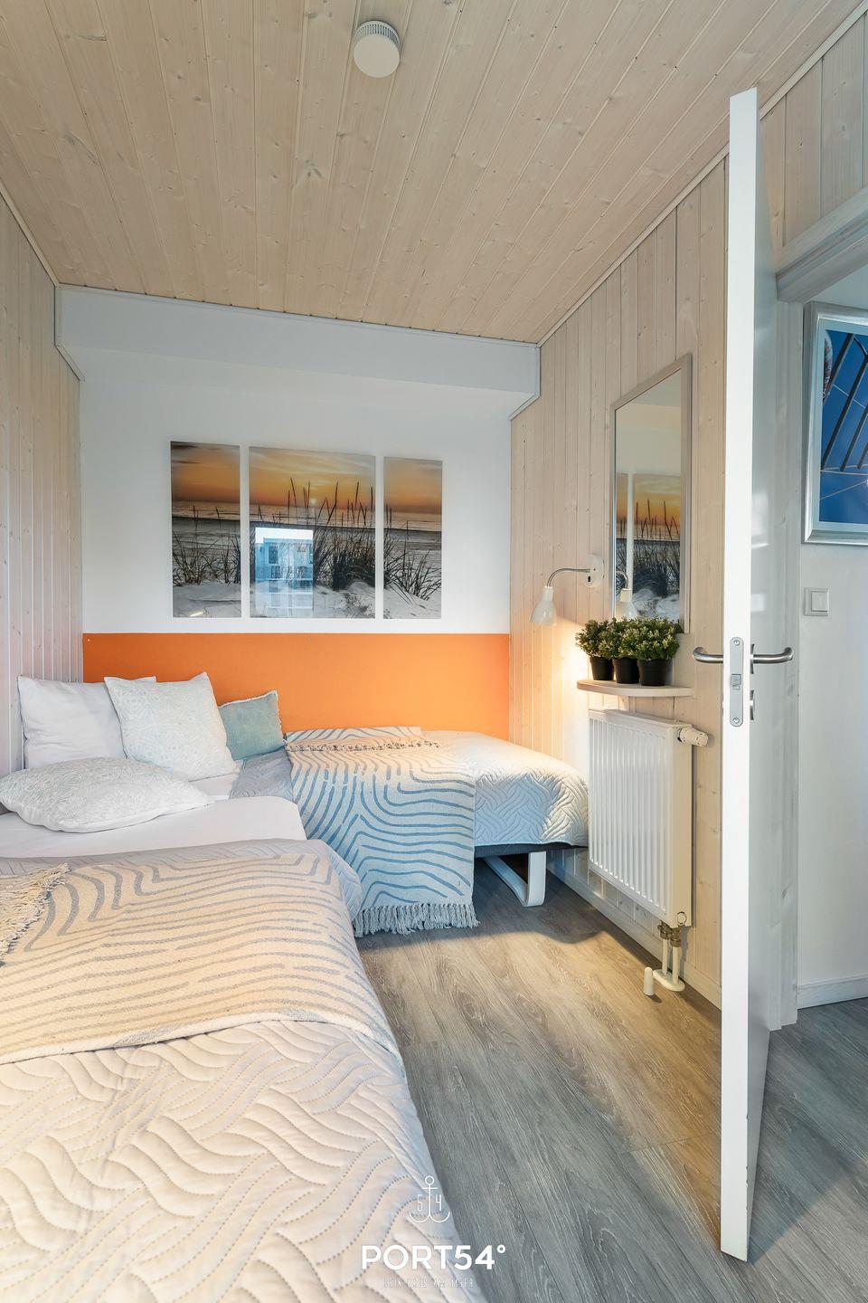 für einen ungestörten Schlaf. Das andere Schlafzimmer verfügt ebenfalls über zwei Einzel- Boxspringbetten (je 90x200cm), sie stehen über Eck. Ein Verdunkelungsrollo sorgt für erholsamen Schlaf. Dieses Zimmer hat eine große Tür, die nach draußen auf die Holzdielen führt. Im Außenbereich befinden sich mehrere Sitzmöglichkeiten mit und ohne Tisch, ein Sonnenschirm, Sonnenliegen sowie ein hochwertiger Holzkohlegrill. Auch ein Gartenschlauch für den Außenwasserhahn ist vorhanden.