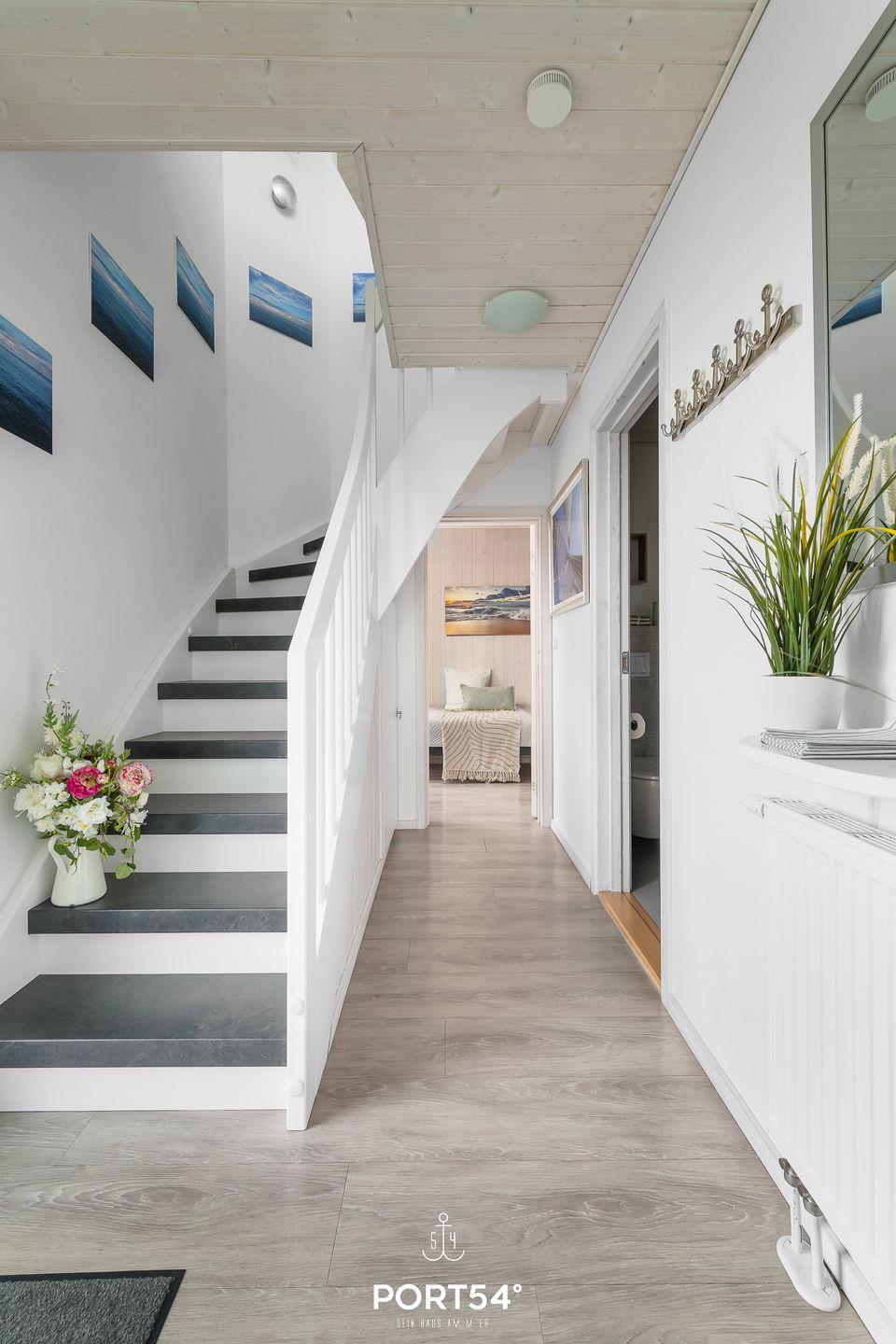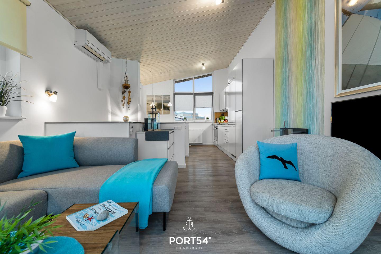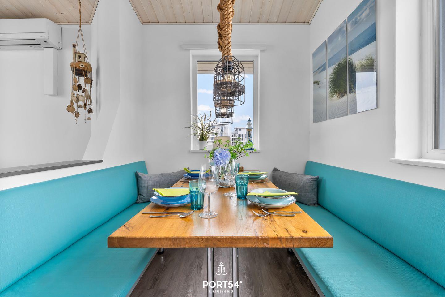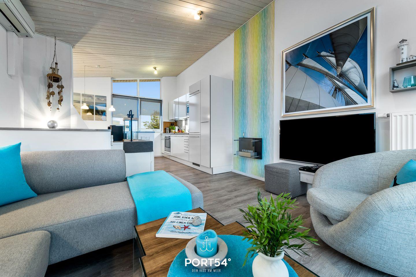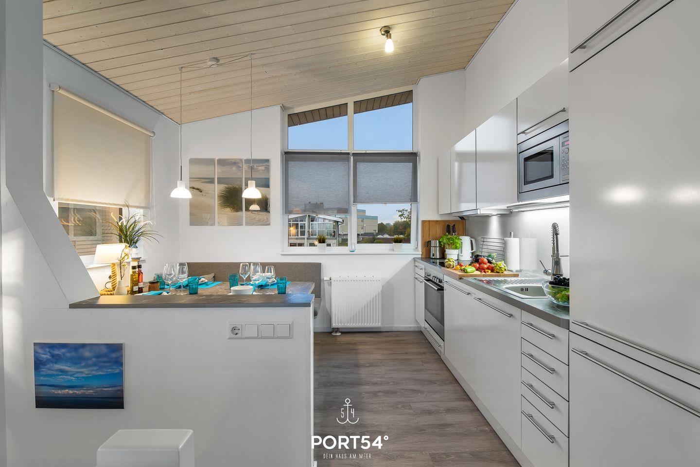 Freue dich auf einen einzigartigen Meerblick vom Sofa, Sessel oder dem gemütlich eingerichteten Balkon und beobachte die großen und kleinen Schiffe, die nach Kiel und in den Nord-Ostsee-Kanal ein- und auslaufen. Ein großer Spaß für große und kleine Urlauber. Im Obergeschoss erwartet dich durch bodentiefe Fenster ein offener, lichtdurchfluteter Wohn- und Essbereich mit geschmackvoller, maritimer Einrichtung. Der gemütliche Wohnbereich bietet ein komfortables Ecksofa, einen Drehsessel mit Fußhocker für entspannte Momente, einen großen 50-Zoll-SmartTV, einen Bioethanol-Kamin und den den Zugang zum Balkon. Auch von der Essecke aus genießt du den herrlichen Meerblick. Die hervorragend ausgestattete Küche mit Induktionskochfeld und umfangreichem Kücheninventar lädt zum Kochen ein. Für Kaffee- und Espressoliebhaber gibt es sowohl eine Kaffee- als auch eine Nespressomaschine und als kleines Highlight einen Milchaufschäumer für herrlichsten Cappuccino, mit dem selbstverständlich auch eine heiße Schokolade zubereitet werden kann. Die vorhandene Klimaanlage verspricht ein angenehmes Innenraumklima an heißen Sommertagen.