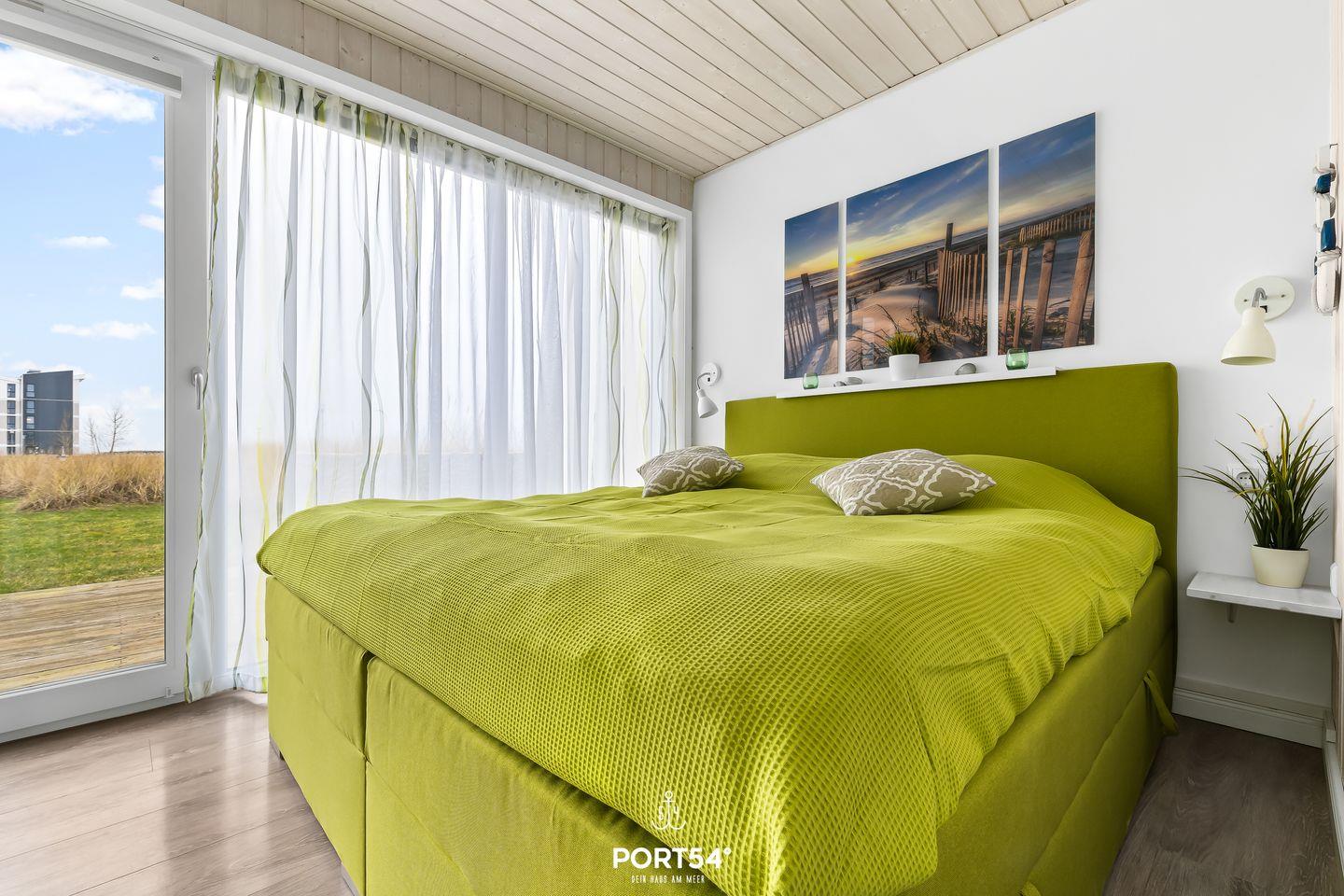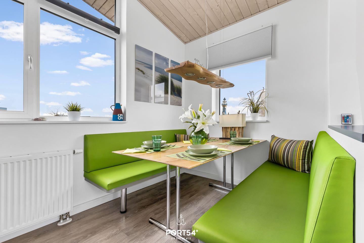 Freue dich auf einen einzigartigen Meerblick vom Sofa, Sessel oder dem gemütlich eingerichteten Balkon und beobachte die großen und kleinen Schiffe, die nach Kiel und in den Nord-Ostsee-Kanal ein- und auslaufen. Ein großer Spaß für große und kleine Urlauber. Im Obergeschoss erwartet dich durch bodentiefe Fenster ein offener, lichtdurchfluteter Wohn- und Essbereich mit geschmackvoller, maritimer Einrichtung. Der gemütliche Wohnbereich bietet ein komfortables Ecksofa, einen Drehsessel mit Fußhocker für entspannte