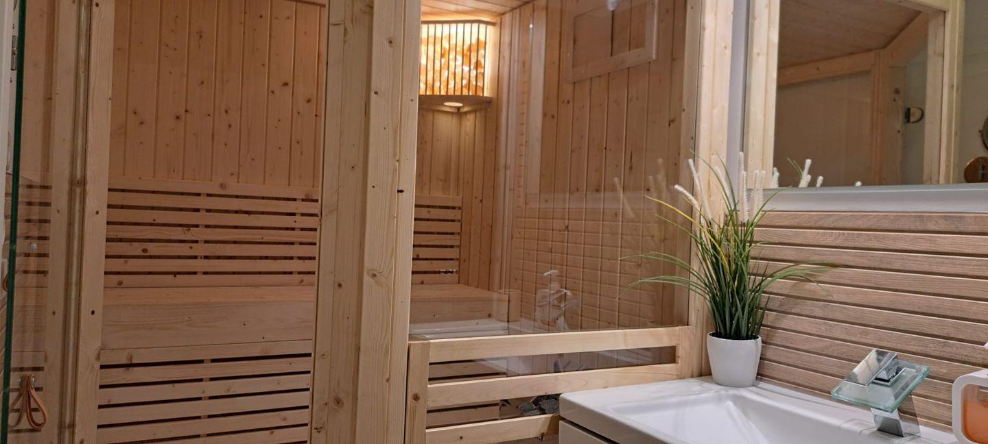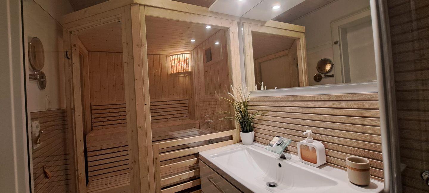 Über die Treppe erreichst du das Erdgeschoß. Das Herzstück im Erdgeschoß ist das kleine aber feine Wellness-Bad mit einer Trockensauna. Freu dich auf die bodentiefe Regendusche. Ein Badschrank mit Schubladen für Ihre Kosmetikartikel befindet sich unter dem Waschbecken. Ebenfalls im Erdgeschoss befinden sich zwei Schlafzimmer: Das Erste liegt zur Seeseite. Es verfügt über bodentiefe Fenster, einen wunderschönen Blick in den Strandgarten und eine geräumige Terrasse. Du schläfst in zwei nebeneinander stehenden, bequemen Einzel-Boxspringbetten (zusammen 180x200cm). Im diesem Schlafzimmer befindet sich ein Fernseher, die Fenster verfügen über Verdunkelungsvorhänge für einen ungestörten Schlaf. Das andere Schlafzimmer verfügt ebenfalls über zwei Einzel- Boxspringbetten (je 90x200cm), sie stehen über Eck. Ein Verdunkelungsrollo sorgt für erholsamen Schlaf. Dieses Zimmer hat eine große Tür, die nach draußen auf die Holzdielen führt. Im Außenbereich befinden sich mehrere Sitzmöglichkeiten mit und ohne Tisch, ein Sonnenschirm, Sonnenliegen sowie ein hochwertiger Holzkohlegrill.