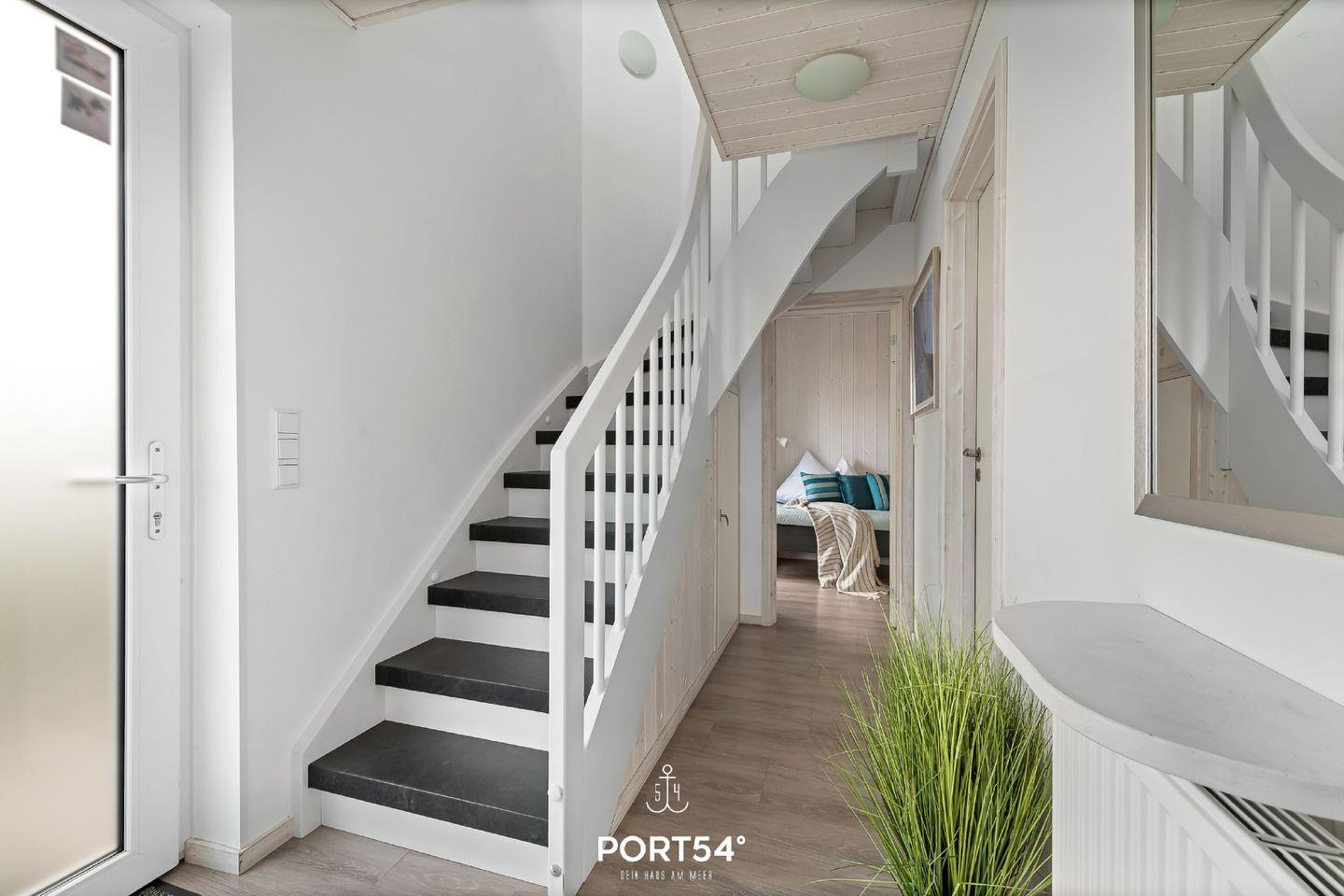 Im ersten Obergeschoss erwartet Sie ein offener, lichtdurchflutetet Wohn- und Essbereich mit angrenzender vollausgestatteter Küche. Der gemütliche Wohnbereich bietet ausreichend Sitzgelegenheiten, einen 50-Zoll-SmartTV, einen Bioethanol-Kamin und den Zugang zum Balkon. Die vorhandene Klimaanlage verspricht ein angenehmes Innenraumklima zu jeder Zeit. Im