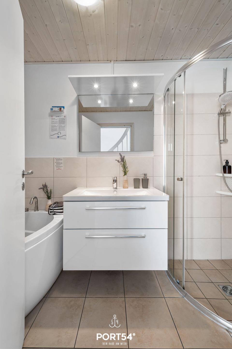 Im Erdgeschoss befinden sich zwei Schlafzimmer. Eines davon bietet zwei zusammengeschobene Einzelbetten (zusammen 180x200cm) und das andere zwei Einzelbetten (je 90x200cm). Eines der Schlafzimmer verfügt über einen TV, sowie beide über verdunkelbare Fenster. Ebenfalls im Erdgeschoss gelegen: das Badezimmer mit angenehmer Fußbodenheizung, ebenerdiger Dusche, WC, Waschbecken und Whirlpool.