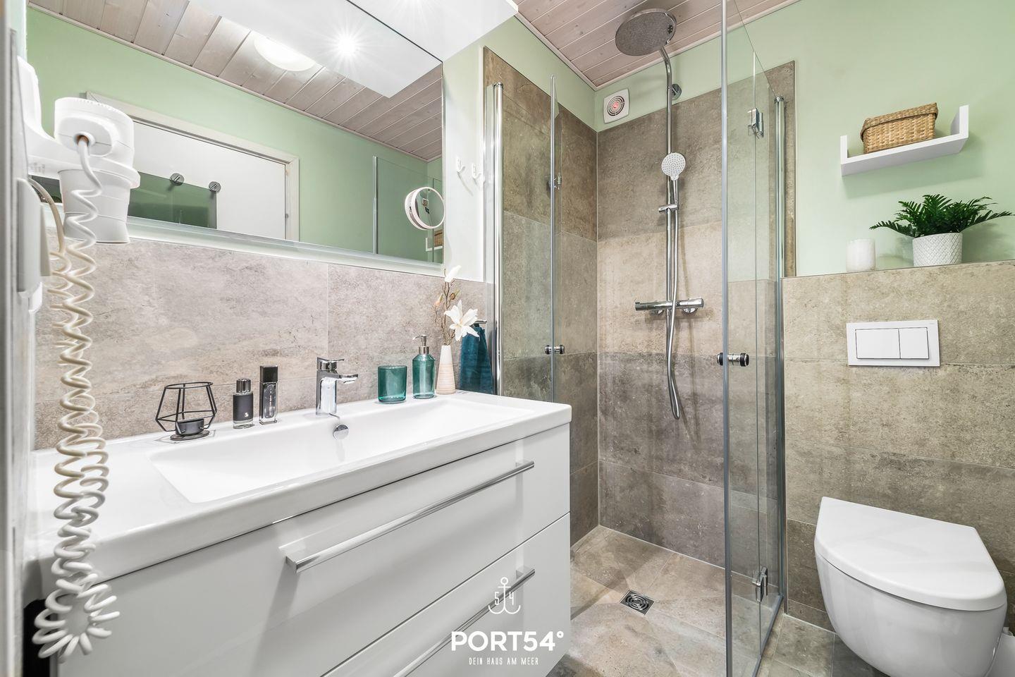 Das Badezimmer ist mit einer bodengleichen Dusche, Fußbodenheizung WC, Waschbecken, Haartrockner und modernen Armaturen ausgestattet. Ein separates Wellnesshighlight stellt die hauseigene Sauna zur alleinigen Nutzung dar – ideal für entspannte Stunden nach einem Tag am Meer. Für die Nutzung im Freien steht dir sowohl ein Balkon als auch eine möblierte Terrasse mit Sonnenschirm, Sonnenliegen, Kohlegrill und Zugang zum Garten bzw. Gartenhaus zur Verfügung. Die Nähe zur Marina, das Leben in einer ruhigen Bucht und die landschaftliche Vielfalt prägen das maritime Flair.
