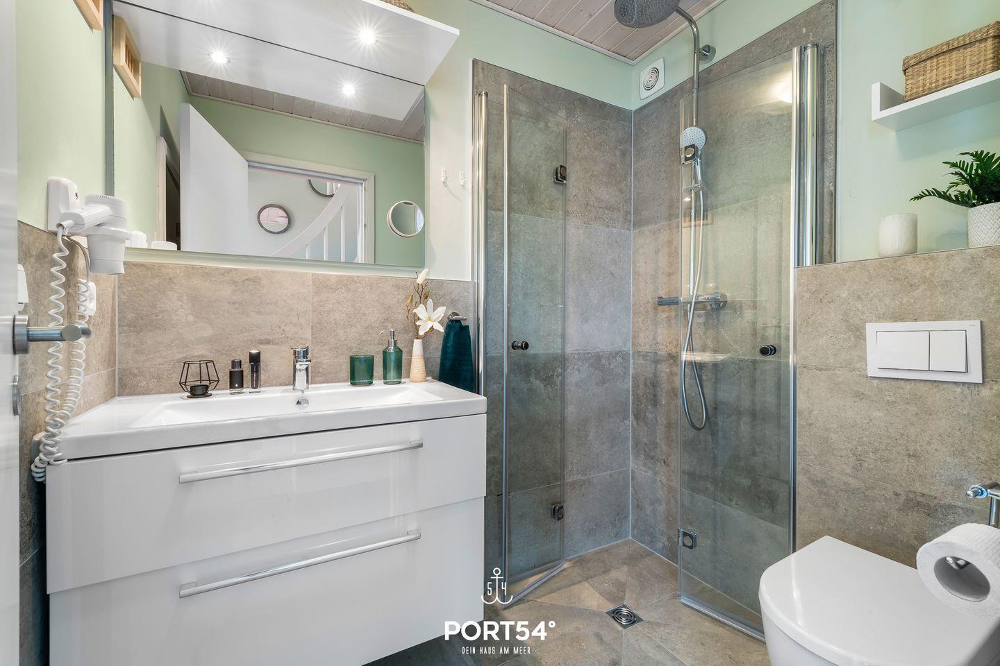 Das Badezimmer ist mit einer bodengleichen Dusche, Fußbodenheizung WC, Waschbecken, Haartrockner und modernen Armaturen ausgestattet. Ein separates Wellnesshighlight stellt die hauseigene Sauna zur alleinigen Nutzung dar – ideal für entspannte Stunden nach einem Tag am Meer. Für die Nutzung im Freien stehen Ihnen sowohl ein Balkon als auch eine möblierte Terrasse mit Sonnenschirm, Sonnenliegen, Kohlegrill und Zugang zum Garten bzw. Gartenhaus zur Verfügung. Die Nähe zur Marina, das Leben in einer ruhigen Bucht und die landschaftliche Vielfalt prägen das maritime Flair.