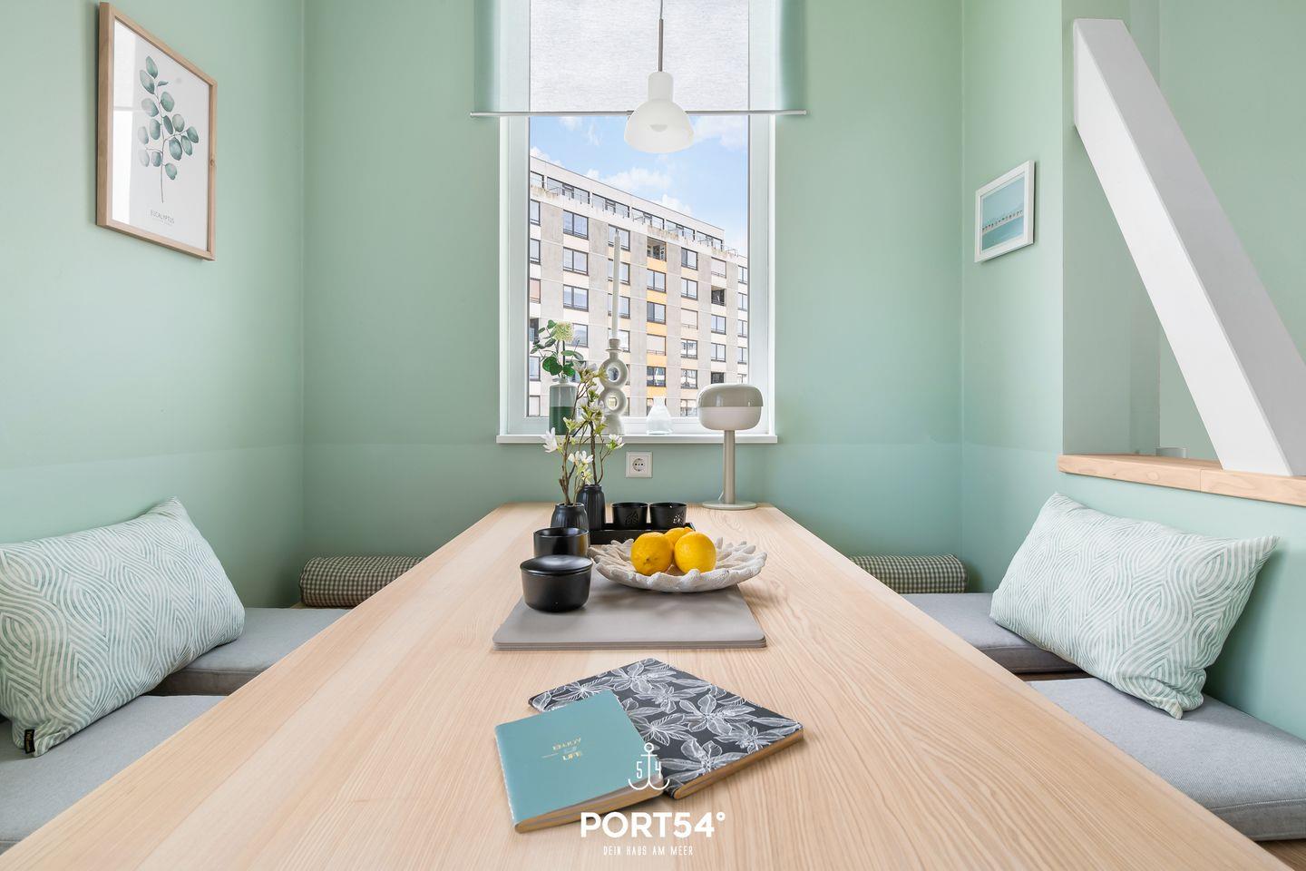 Das lichtdurchflutete Wohnzimmer bildet das Herzstück des Hauses und ist offen mit der bestens ausgestatteten Küche verbunden. Hier findest du moderne Geräte wie Ceranherd, Backofen, Mikrowelle, Kühlschrank mit extra Gefrierschrank, Spülmaschine, Wasserkocher, Toaster sowie eine Nespresso-Maschine und einen Mixer. Die Küchenutensilien und Geschirrhandtücher sind ebenfalls vorhanden und gewährleisten dir einen angenehmen Selbstversorger-Aufenthalt. Der gemütliche Essbereich schließt sich direkt an und lädt zu entspannten gemeinsamen Mahlzeiten ein.