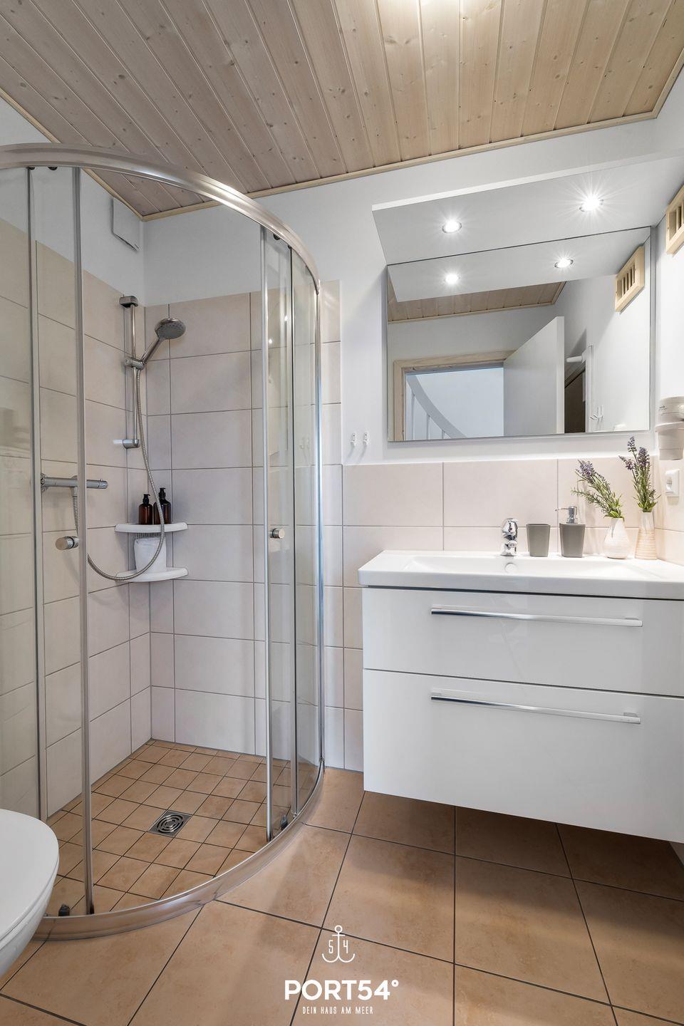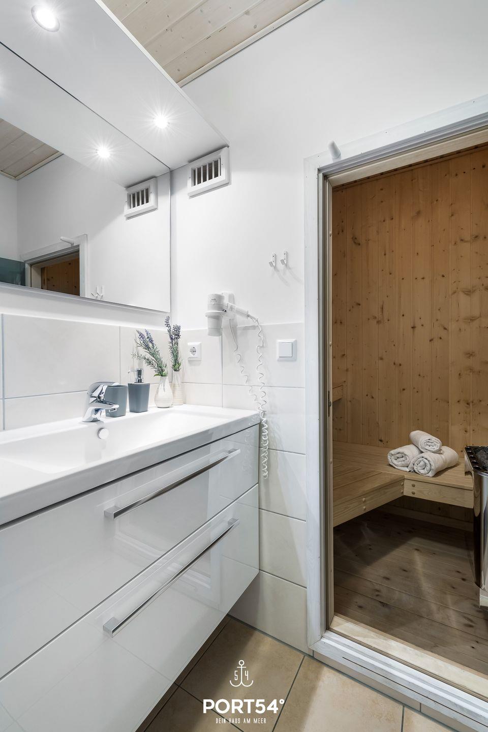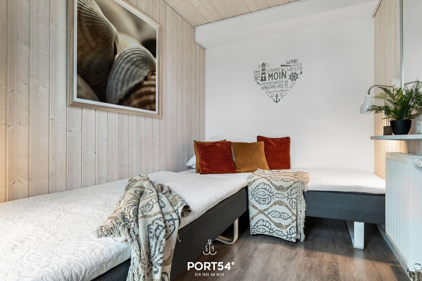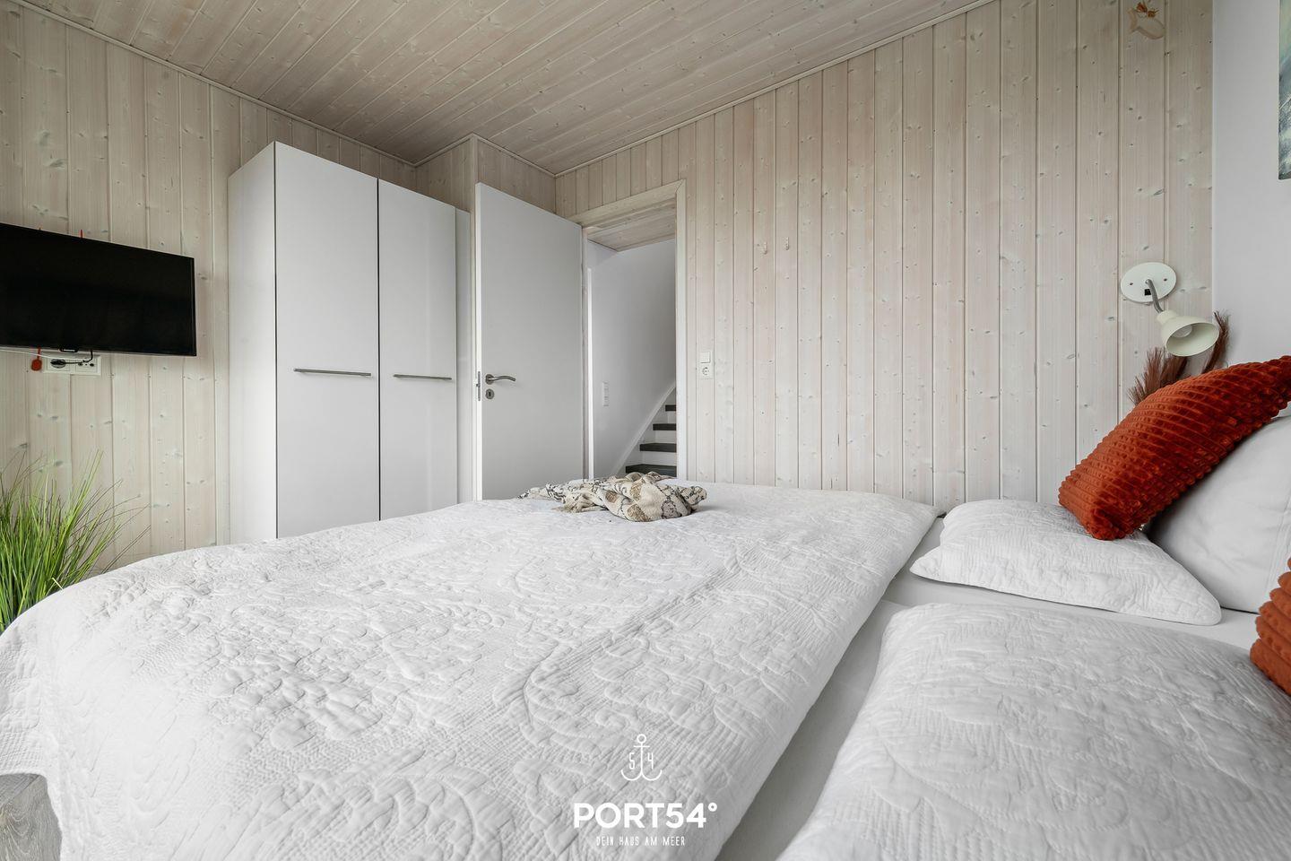 Im Erdgeschoss befinden sich zwei Schlafzimmer. Eines davon bietet zwei zusammengeschobene Einzelbetten (zusammen 180x200cm) und das andere zwei Einzelbetten (je 90x200cm). Eines der Schlafzimmer verfügt über einen TV, sowie beide über verdunkelbare Fenster. Ebenfalls im Erdgeschoss gelegen: das Badezimmer mit angenehmer Fußbodenheizung, ebenerdiger Dusche, WC, Waschbecken und Trockensauna.