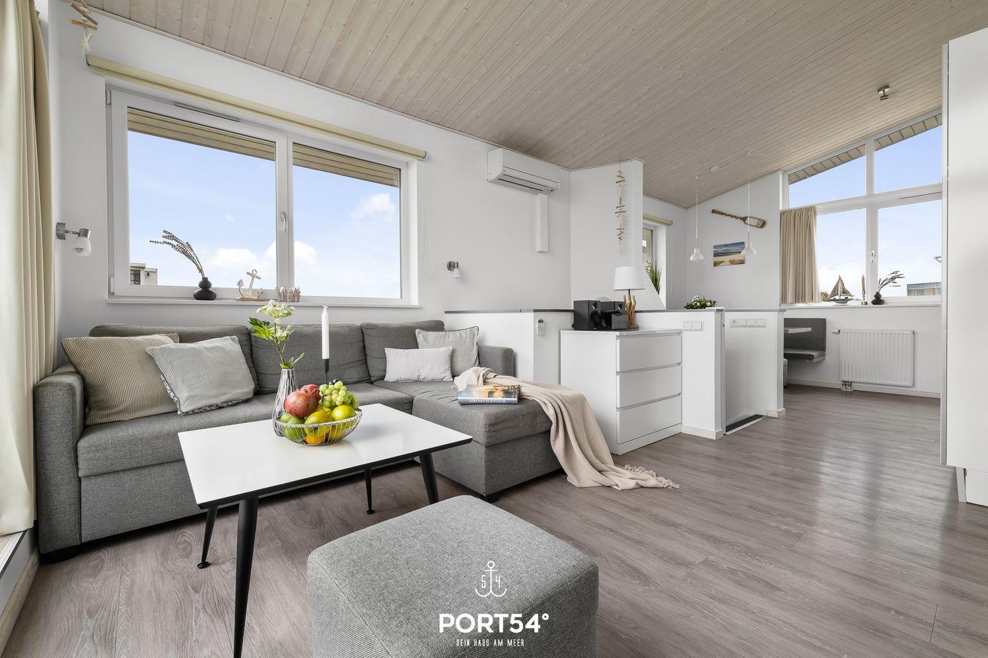 Im Obergeschoss erwartet Sie ein offener, lichtdurchfluteter Wohn- und Essbereich mit Schlafcouch für 2 Kinder und angrenzender vollausgestatteter Küche. Der gemütliche Wohnbereich bietet ausreichend Sitzgelegenheiten, einen 50-Zoll-SmartTV, einen Bioethanol-Kamin und den Zugang zum Balkon. Die vorhandene Klimaanlage verspricht ein angenehmes Innenraumklima zu jeder Zeit. Das Obergeschoss ist mit einem variablen Treppenschutzgitter ausgestattet.