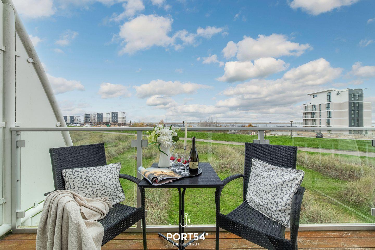 Im Außenbereich befinden sich Sitzmöglichkeiten, ein Sonnenschirm, Sonnenliegen sowie ein Holzkohlegrill. Ebenfalls befindet sich am Haus ein kostenfreier PKW Stellplatz und ein abschließbarer Fahrradschuppen. Vom Balkon aus genießen Sie den Blick auf die Ostsee und den Yachthafen.