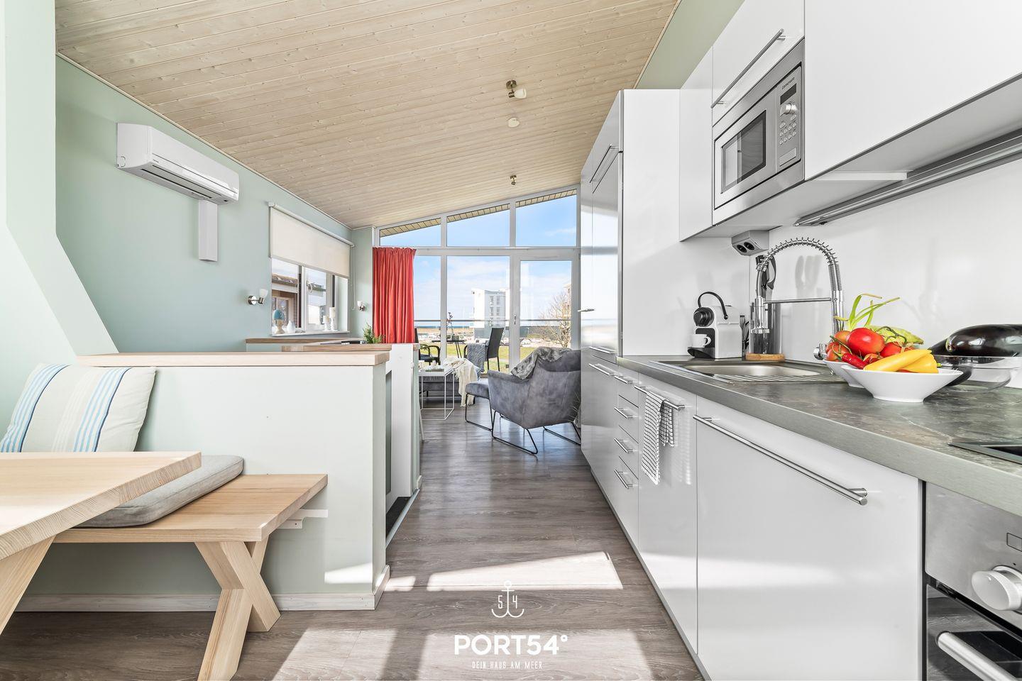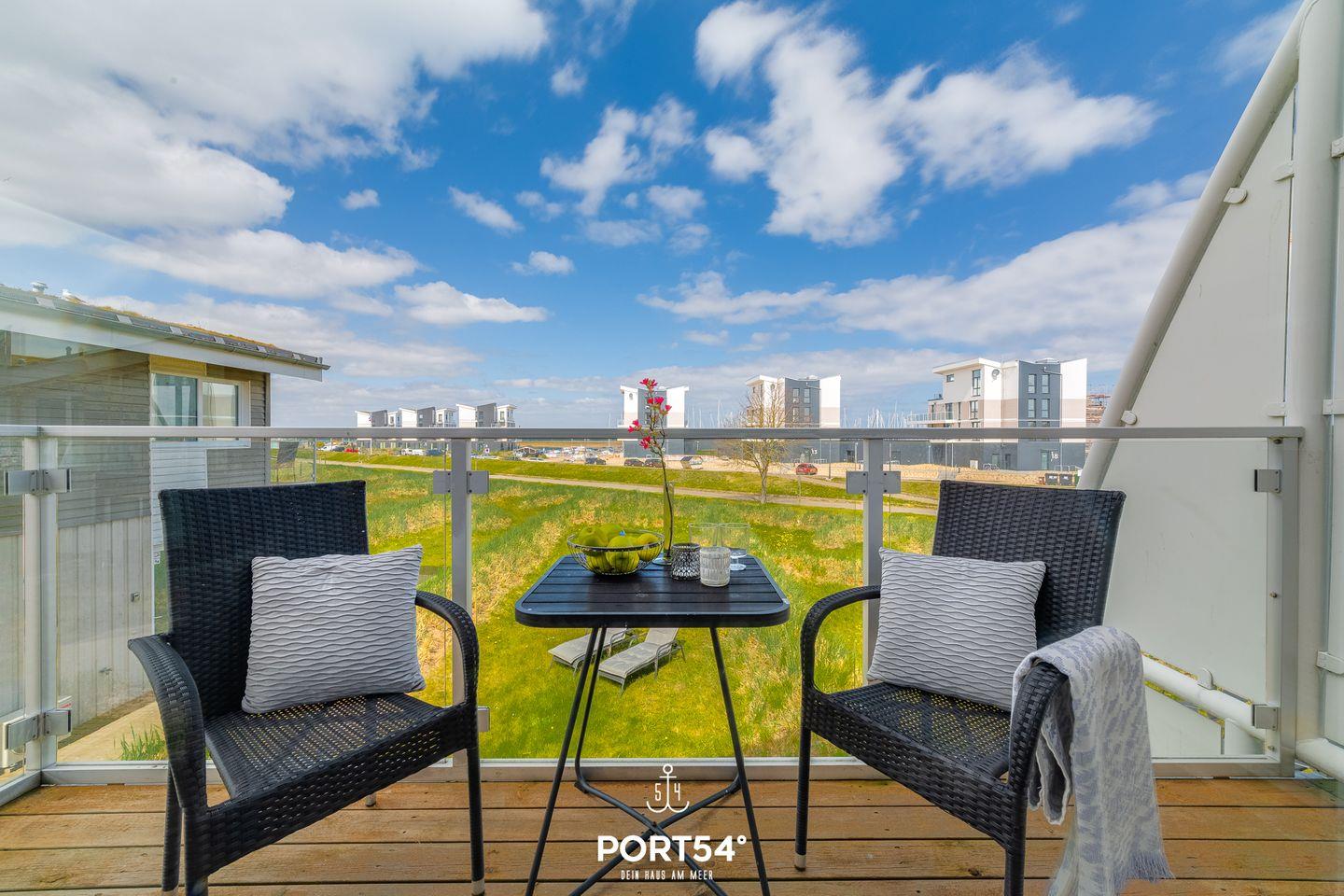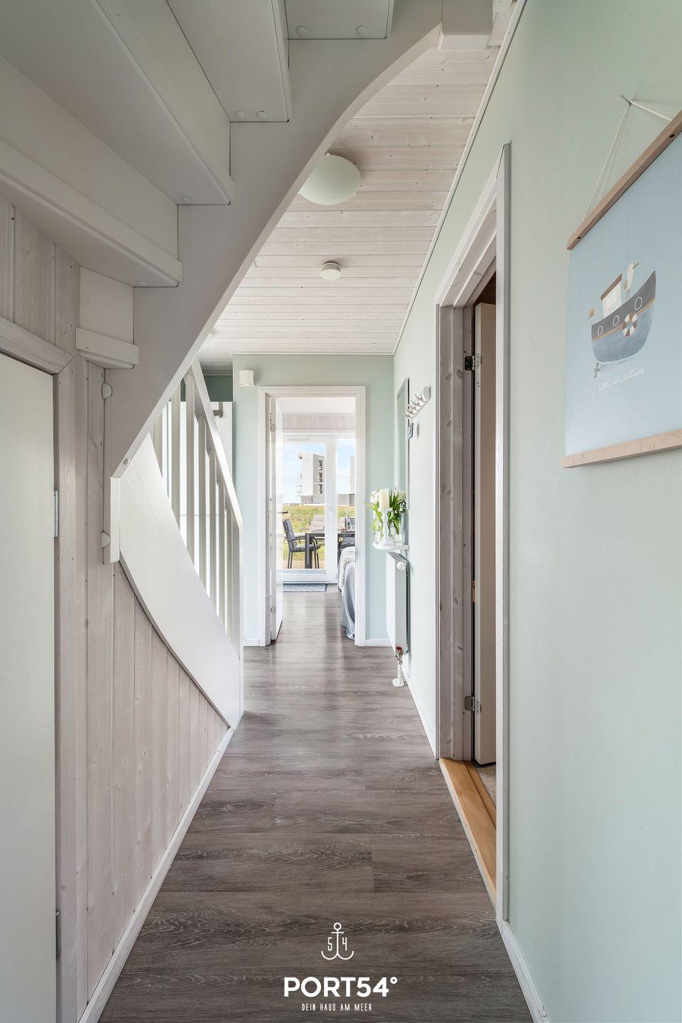 Im Außenbereich laden Sitzmöglichkeiten und Sonnenliegen auf dem Balkon und der Terrasse zum Entspannen ein. Ein Sonnenschirm sowie ein Holzkohlegrill runden die Ausstattung ab. Ebenfalls befindet sich am Haus ein kostenfreier PKW Stellplatz und ein abschließbarer Fahrradschuppen. Ob heiße Sommertage, laue Sommerabende, stürmische Herbstnachmittage oder kühle Wintertage: diese Doppelhaushälfte besticht mit seiner hochwertigen Ausstattung sowie einer naturnahen Umgebung zu jeder Jahreszeit. Vom Balkon aus genießt du den Blick Richtung Meer.
