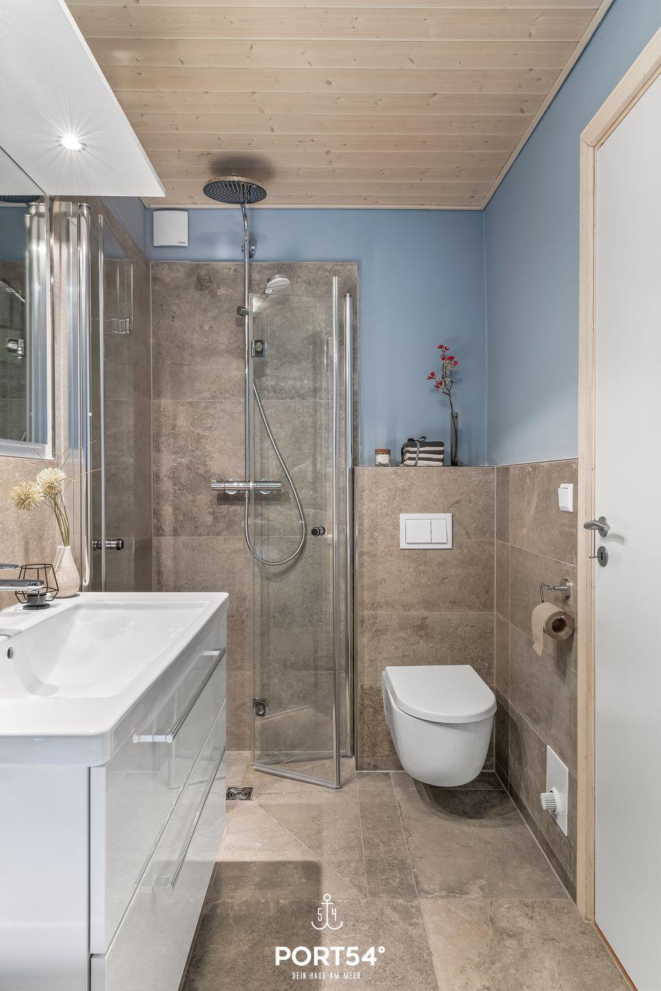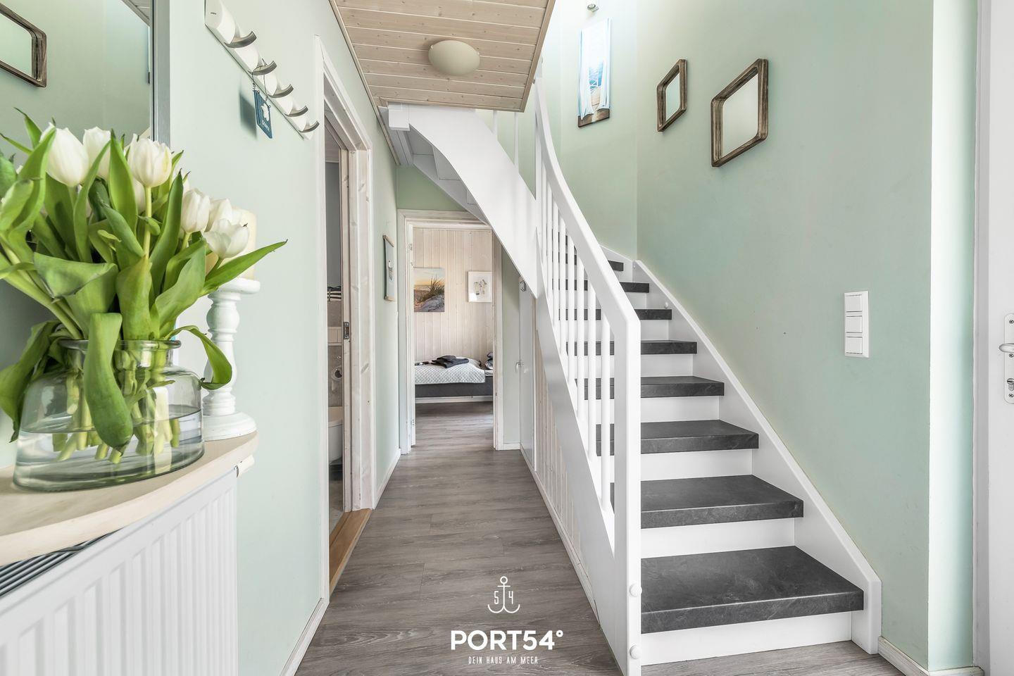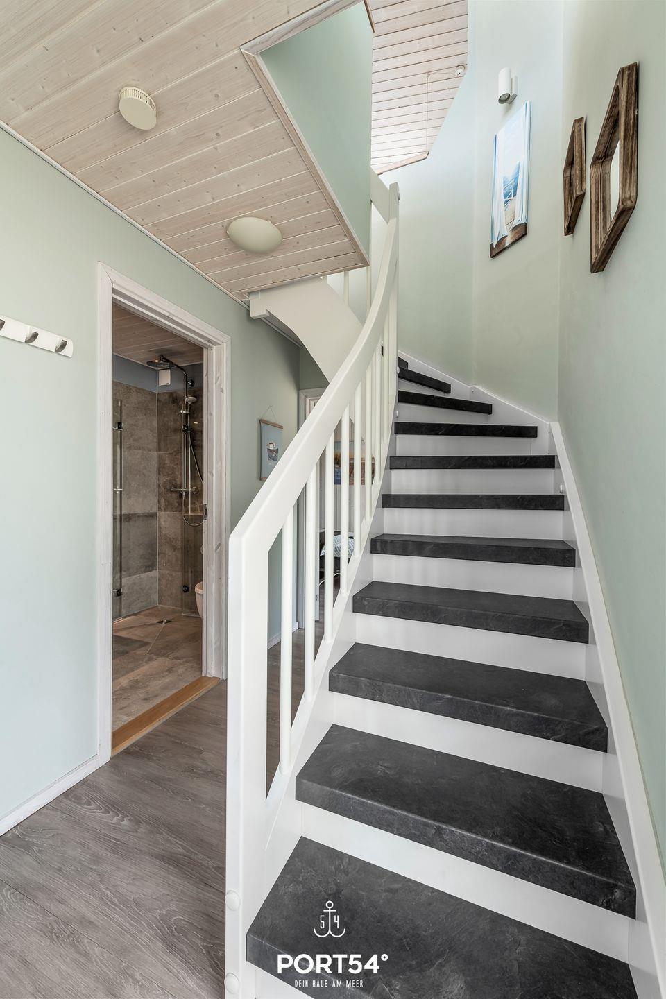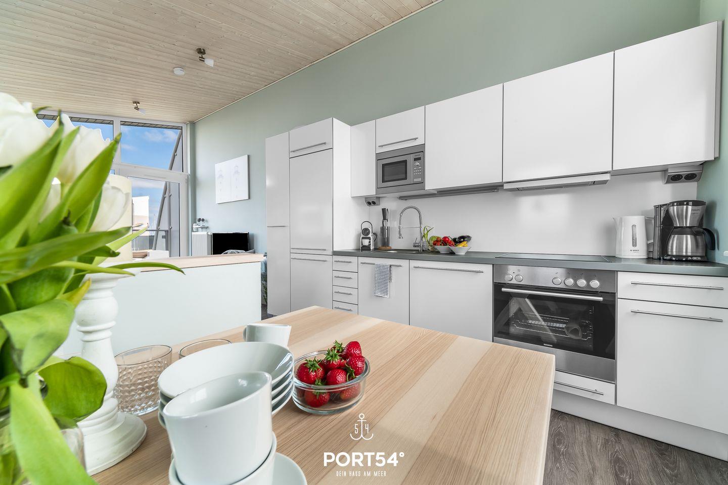 Im Außenbereich laden Sitzmöglichkeiten und Sonnenliegen auf dem Balkon und der Terrasse zum Entspannen ein. Ein Sonnenschirm sowie ein Holzkohlegrill runden die Ausstattung ab. Ebenfalls befindet sich am Haus ein kostenfreier PKW Stellplatz und ein abschließbarer Fahrradschuppen. Ob heiße Sommertage, laue Sommerabende, stürmische Herbstnachmittage oder kühle Wintertage: diese Doppelhaushälfte besticht mit seiner hochwertigen Ausstattung sowie einer naturnahen Umgebung zu jeder Jahreszeit. Vom Balkon aus genießt du den Blick Richtung Meer.