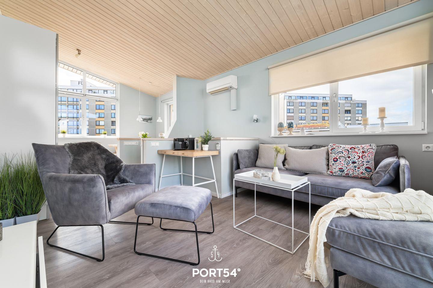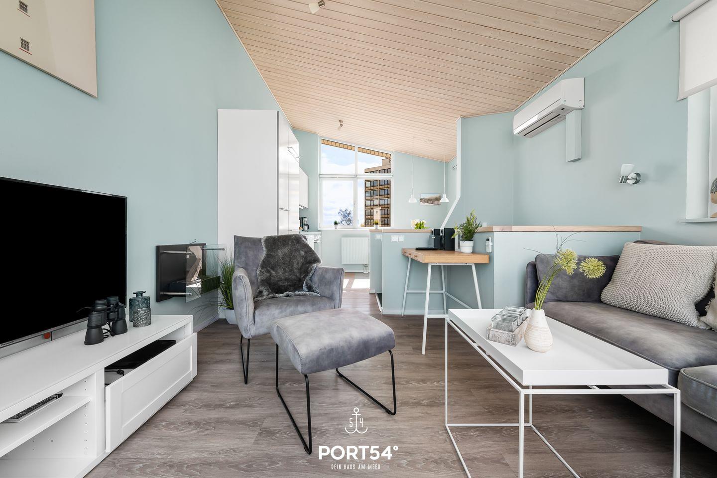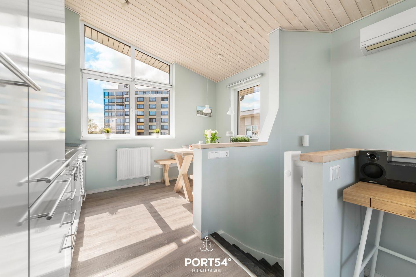 Im ersten Obergeschoss erwartet dich ein offener, lichtdurchfluteter Wohn- und Essbereich mit angrenzender vollausgestatteter Küche. Der gemütliche Wohnbereich bietet ausreichend Sitzgelegenheiten, einen 50-Zoll-TV, einen Bioethanol-Kamin und den Zugang zum Balkon. Die vorhandene Klimaanlage verspricht ein angenehmes Innenraumklima zu jeder Zeit.