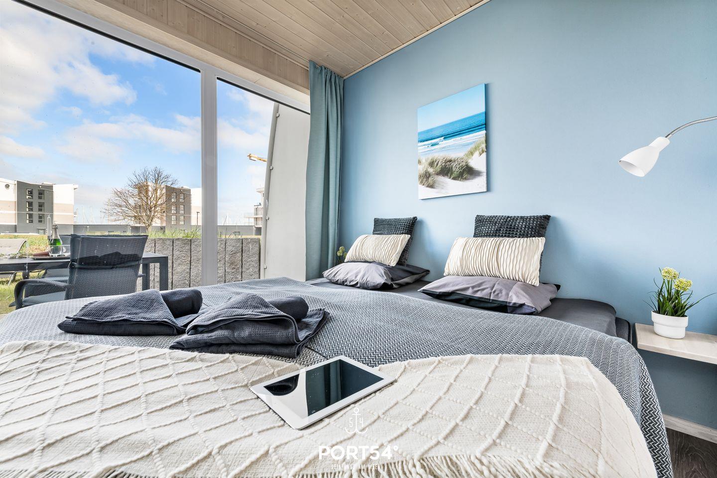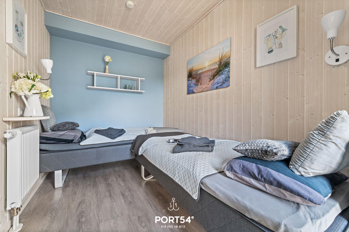 Im Erdgeschoss befinden sich zwei Schlafzimmer, wovon eins mit zusammengeschobenen Einzelbetten (zusammen 180x200cm) und das andere mit zwei Einzelbetten (je 90x200cm) ausgestattet ist. Eines der Schlafzimmer verfügt über einen TV, sowie beide über verdunkelbare Fenster. Ebenfalls im Erdgeschoss gelegen: das neu renovierte und moderne Badezimmer mit angenehmer Fußbodenheizung, ebenerdiger Dusche, WC und Waschbecken und Whirlpool.