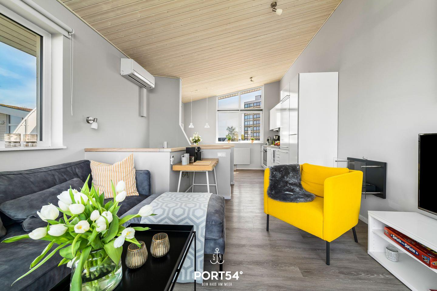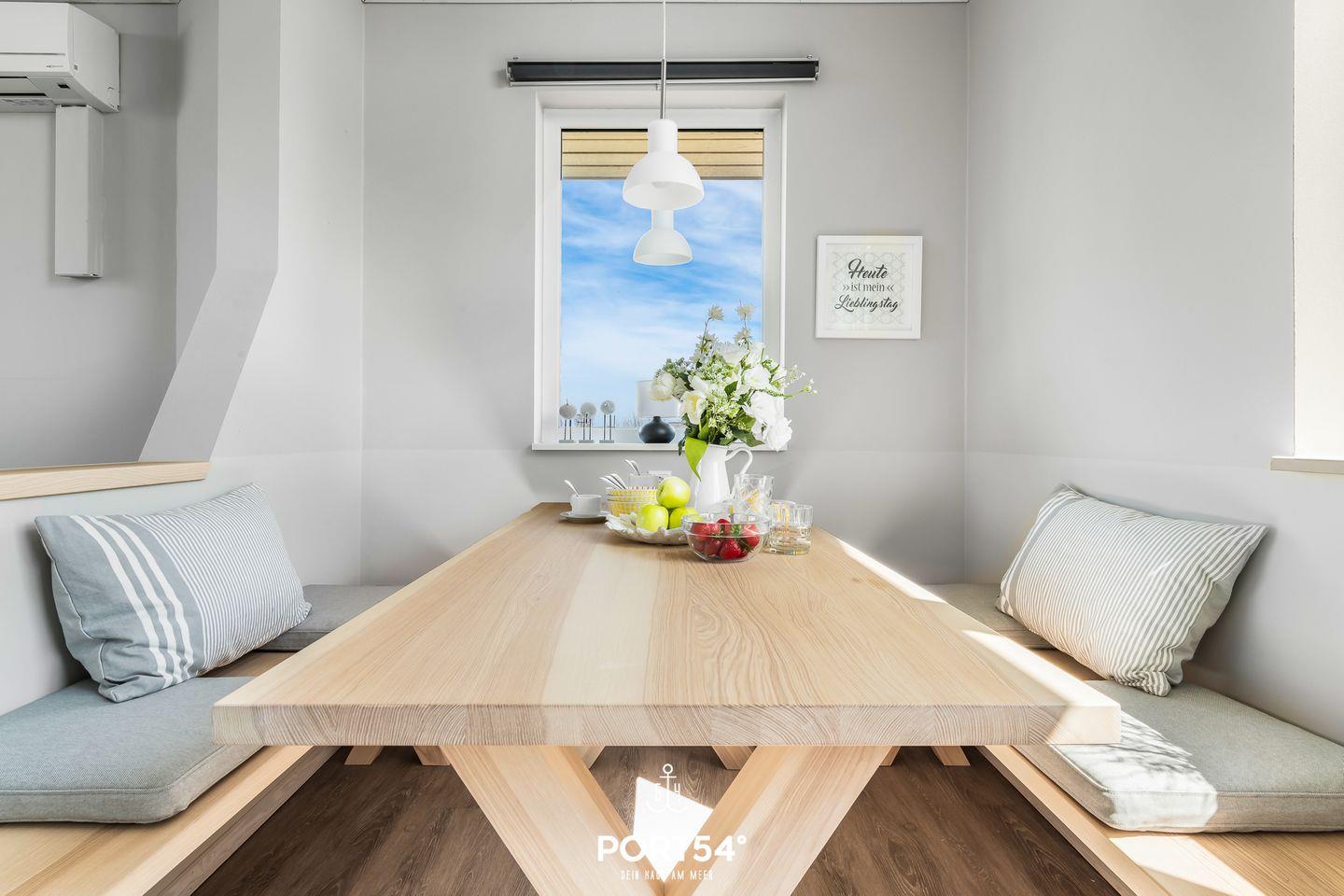 Im ersten Obergeschoss erwartet Sie ein offener, lichtdurchfluteter Wohn- und Essbereich mit angrenzender vollausgestatteter Küche. Der gemütliche Wohnbereich bietet ausreichend Sitzgelegenheiten, einen 50-Zoll-SmartTV, einen Bioethanol-Kamin und den Zugang zum Balkon. Die vorhandene Klimaanlage verspricht ein angenehmes Innenraumklima zu jeder Zeit.