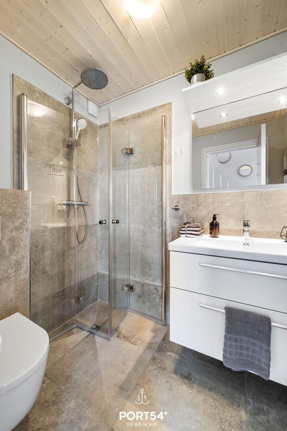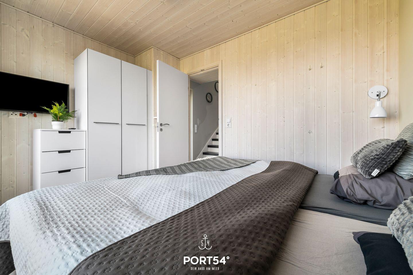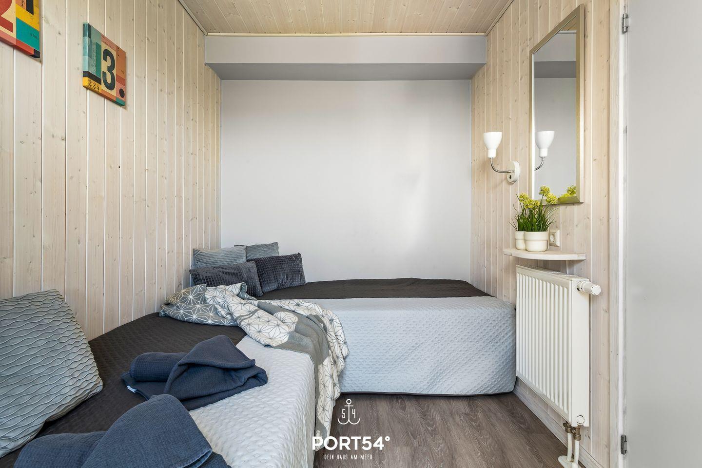 Im Erdgeschoss befinden sich zwei Schlafzimmer, wovon eins mit zusammengeschobenen Einzelbetten (zusammen 180x200cm) und das andere mit zwei Einzelbetten (je 90x200cm) ausgestattet ist. Eines der Schlafzimmer verfügt über einen TV, sowie beide über verdunkelbare Fenster. Ebenfalls im Erdgeschoss gelegen: das Badezimmer mit ebenerdiger Dusche, WC, Waschbecken und finnischer Sauna.