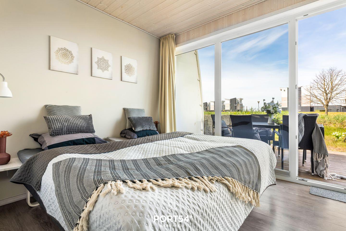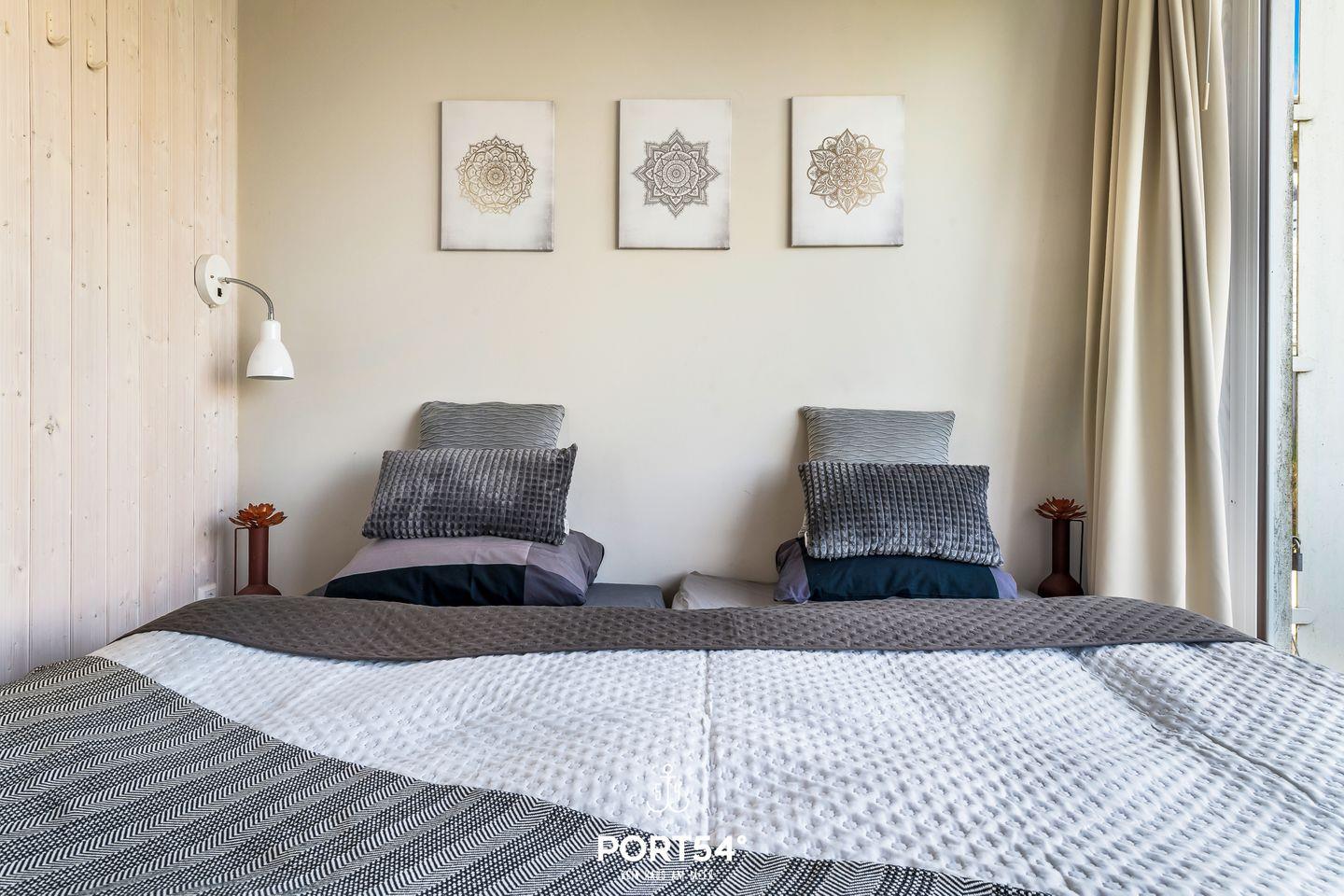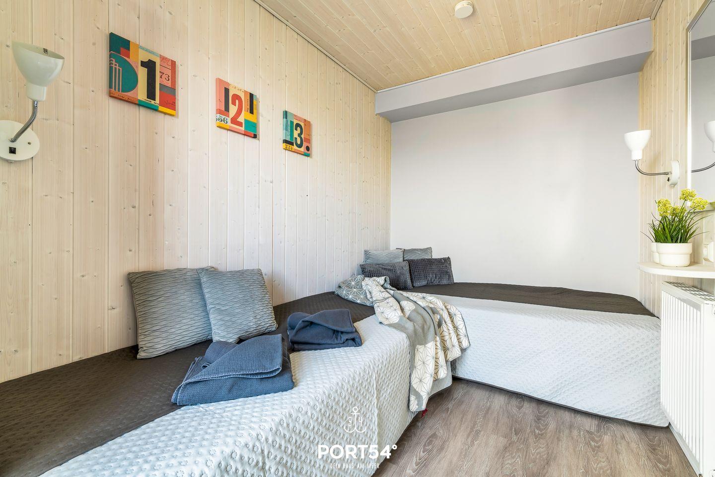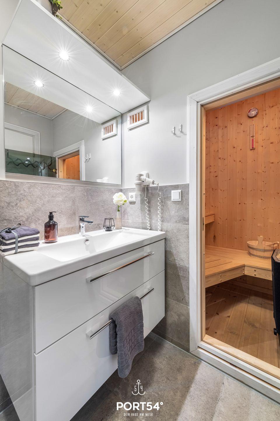 Im Erdgeschoss befinden sich zwei Schlafzimmer, wovon eins mit zusammengeschobenen Einzelbetten (zusammen 180x200cm) und das andere mit zwei Einzelbetten (je 90x200cm) ausgestattet ist. Eines der Schlafzimmer verfügt über einen TV, sowie beide über verdunkelbare Fenster. Ebenfalls im Erdgeschoss gelegen: das Badezimmer mit ebenerdiger Dusche, WC, Waschbecken und finnischer Sauna.