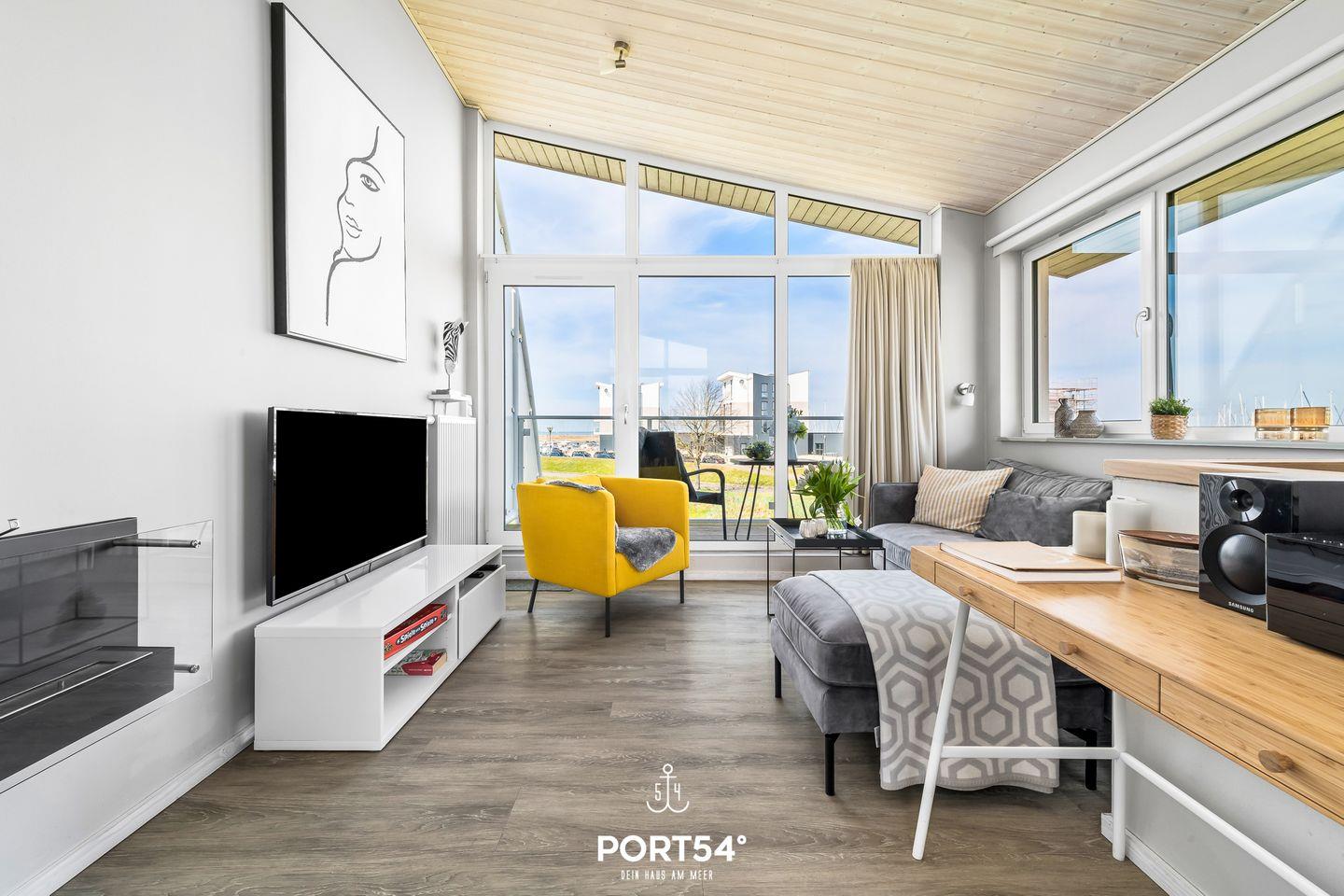 Im ersten Obergeschoss erwartet dich ein offener, lichtdurchfluteter Wohn- und Essbereich mit angrenzender vollausgestatteter Küche. Der gemütliche Wohnbereich bietet ausreichend Sitzgelegenheiten, einen 50-Zoll-SmartTV, einen Bioethanol-Kamin und den Zugang zum Balkon. Die vorhandene Klimaanlage verspricht ein angenehmes Innenraumklima zu jeder Zeit.