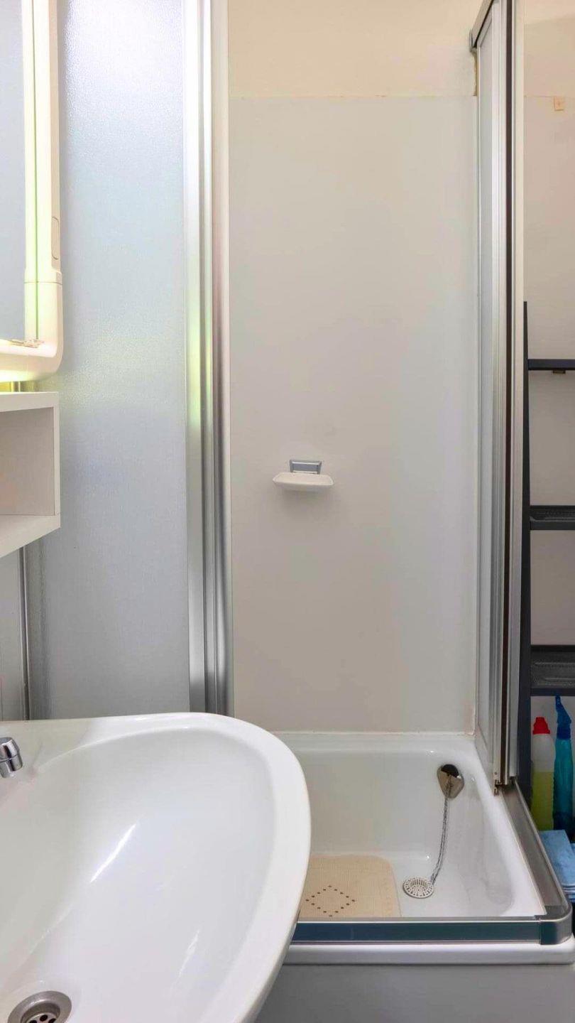 Ein kleiner Flur mit Garderobe sorgt dafür, dass du alles ordentlich verstauen kannst, während das Badezimmer mit Dusche und WC ausreichenden Komfort bietet.