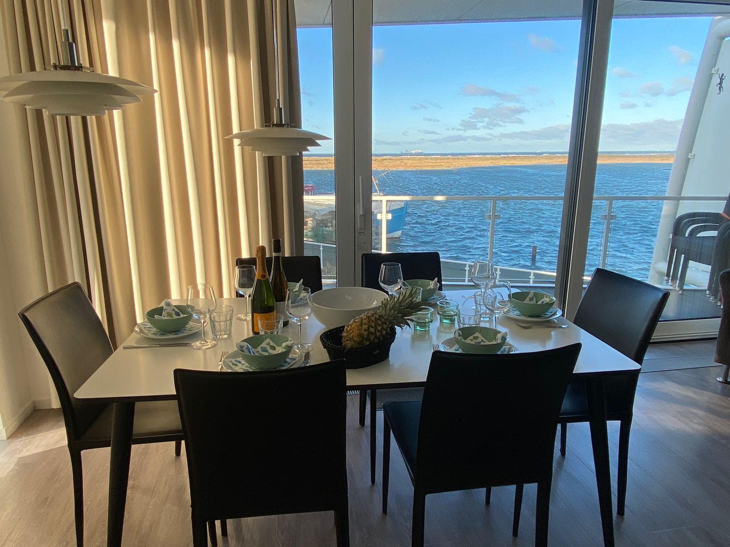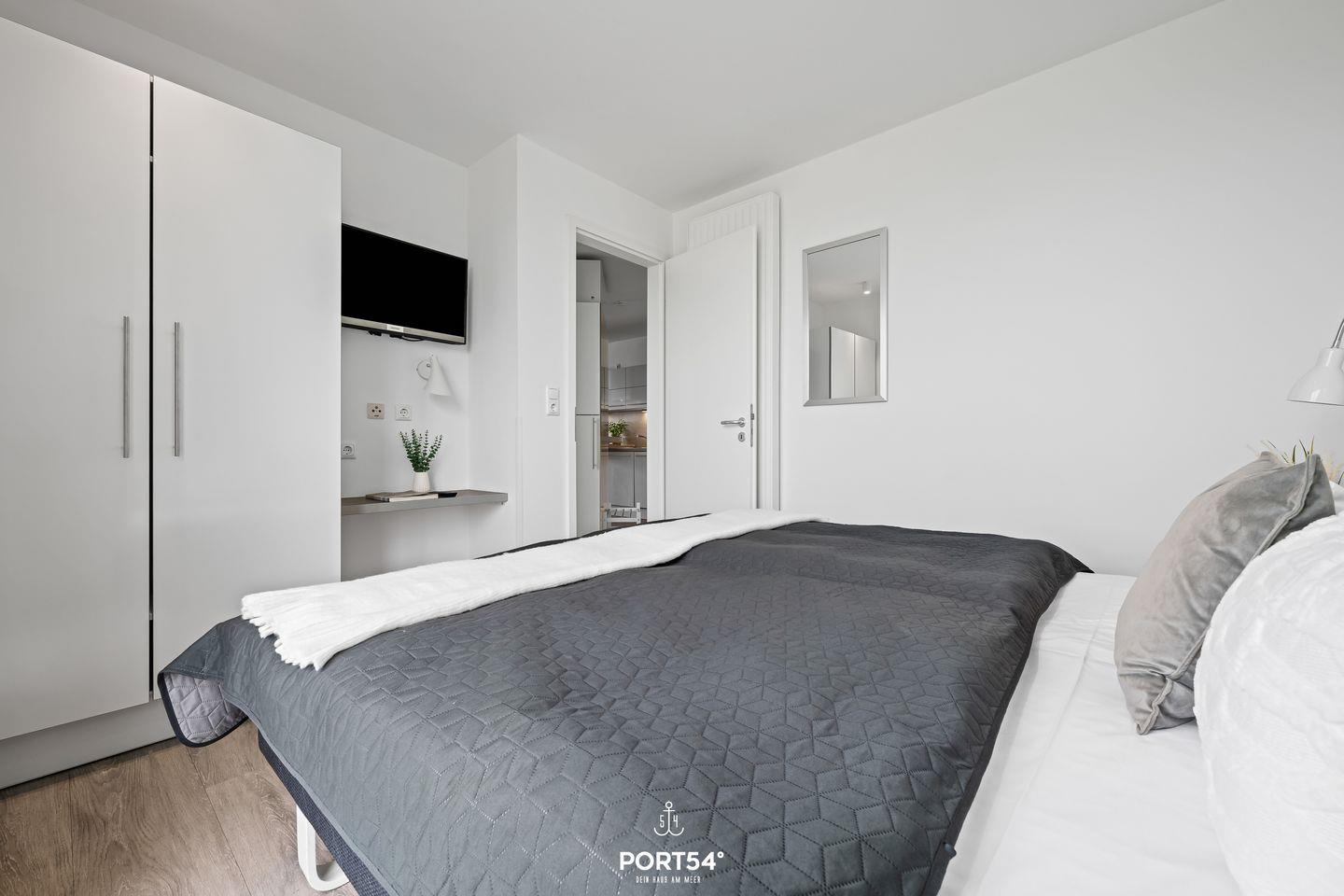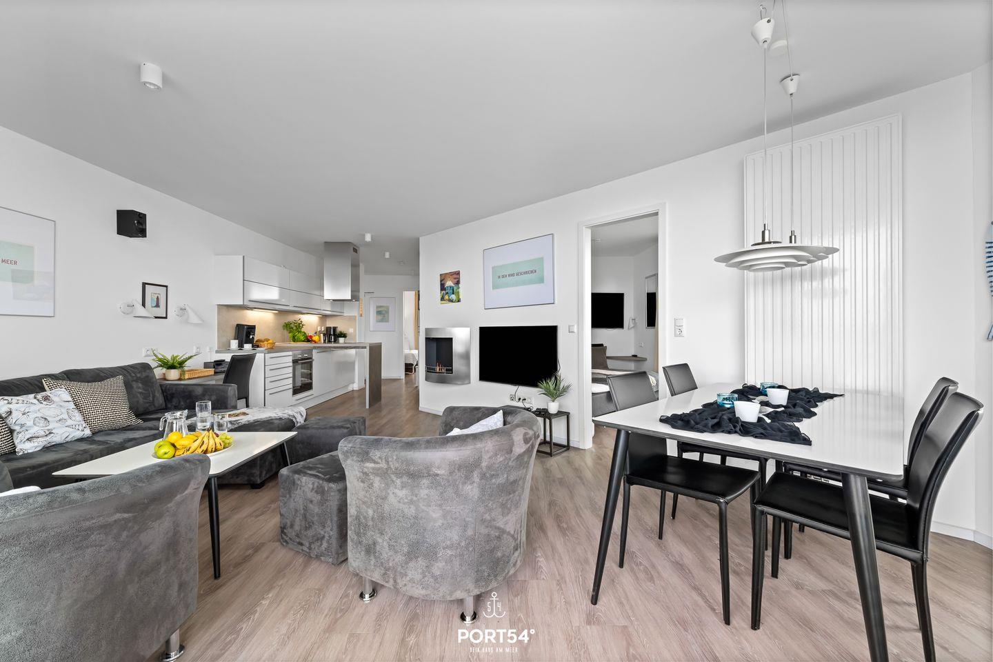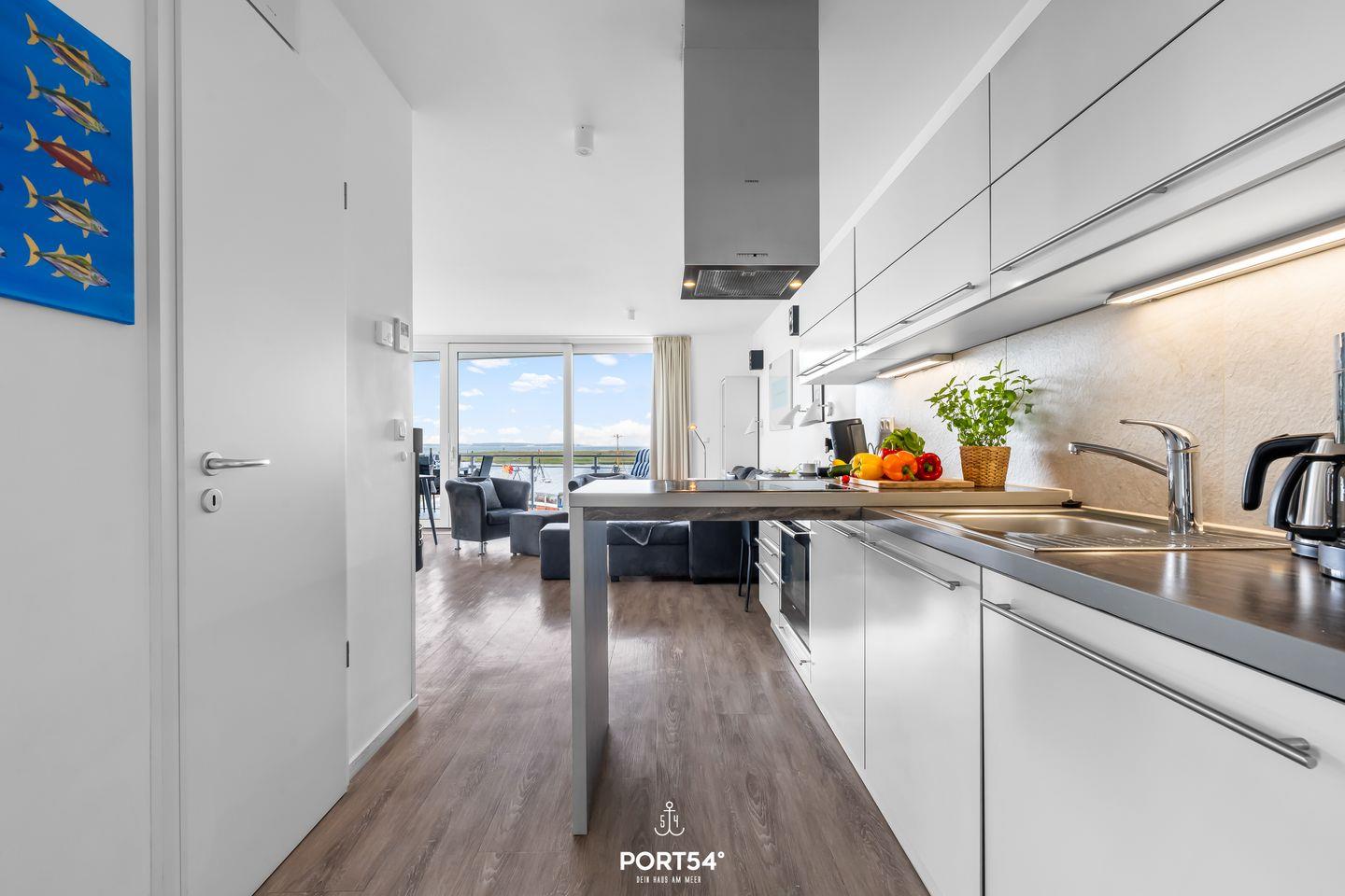 Das Herzstück der Wohnung bildet der offene Wohnbereich, der vom Wohn- und Esszimmer bis zur modernen Küche reicht. Hier kannst du gemeinsame Mahlzeiten zubereiten, während du die wunderschöne Aussicht auf das Meer durch die großen Fenster genießt. Ein besonderes Highlight stellt zudem die Terrasse dar, die mit 24 qm Größe umlaufend um die Wohnung verläuft und dir viele Möglichkeiten bietet, die frische Meeresluft im Freien zu genießen. Die voll ausgestattete Küche lässt keine Wünsche offen und bietet dir alles, was du für deinen Aufenthalt benötigst: von der Spülmaschine bis hin zur Espressomaschine, um deinen Morgen mit einer köstlichen Tasse Kaffee zu beginnen.
