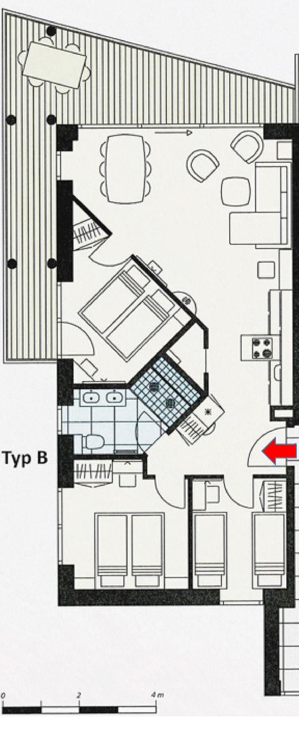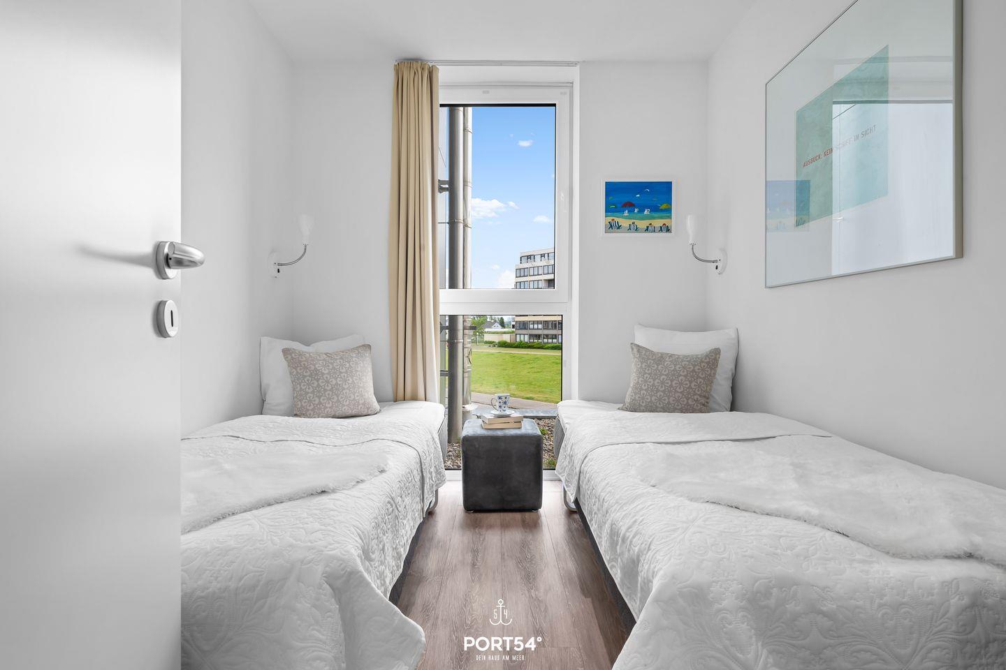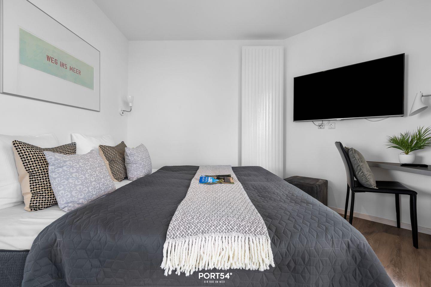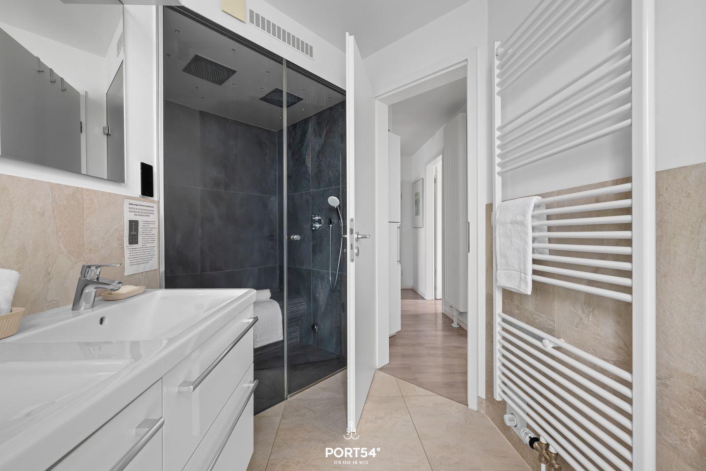 Das Herzstück der Wohnung bildet der offene Wohnbereich, der vom Wohn- und Esszimmer bis zur modernen Küche reicht. Hier kannst du gemeinsame Mahlzeiten zubereiten, während du die wunderschöne Aussicht auf das Meer durch die großen Fenster genießt. Ein besonderes Highlight stellt zudem die Terrasse dar, die mit 24 qm Größe umlaufend um die Wohnung verläuft und dir viele Möglichkeiten bietet, die frische Meeresluft im Freien zu genießen. Die voll ausgestattete Küche lässt keine Wünsche offen und bietet dir alles, was du für deinen Aufenthalt benötigst: von der Spülmaschine bis hin zur Espressomaschine, um deinen Morgen mit einer köstlichen Tasse Kaffee zu beginnen.
