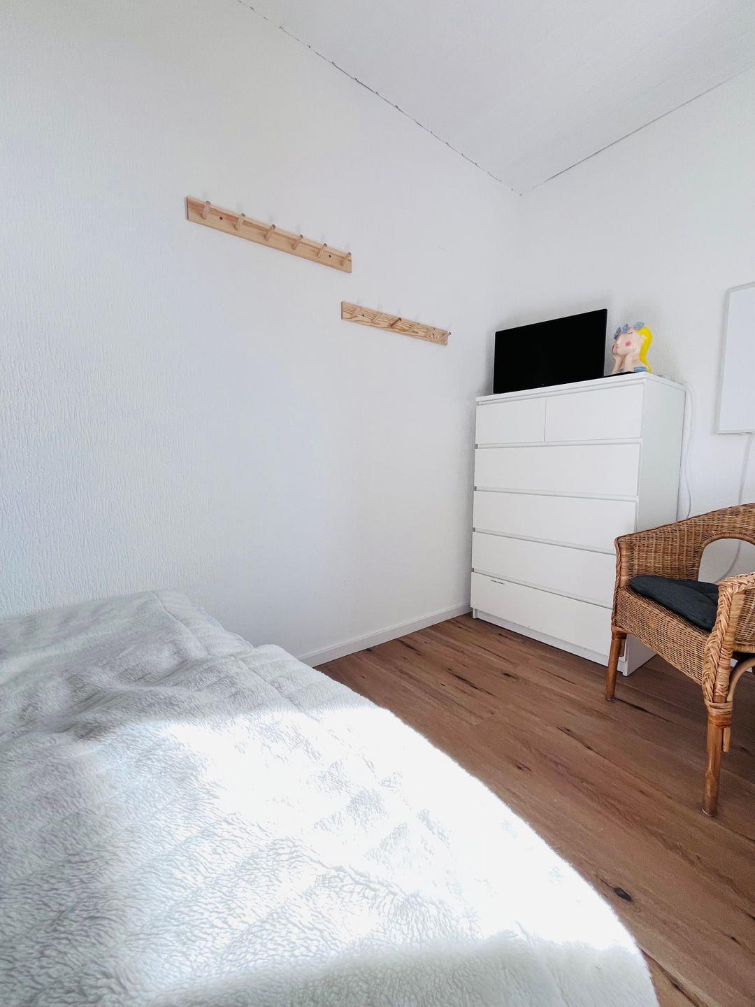 Das Schlafzimmer ist mit einem Doppelbett (140 × 200 cm), einer Kommode und einem TV ausgestattet. Zwei weitere Personen können auf der komfortablen Schlafcouch im Wohnzimmer übernachten.