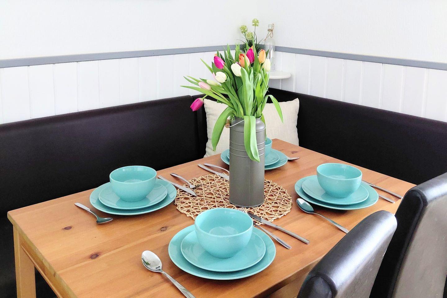 Beim Betreten empfängt dich eine moderne, gepflegte und lichtdurchflutete Einrichtung. Das Wohnzimmer bietet eine gemütliche Sofaecke und einen Essbereich, an dem du deine Mahlzeiten gemeinsam genießen kannst. Für Unterhaltung stehen ein Kabel-TV, Radio und CD-Spieler bereit.