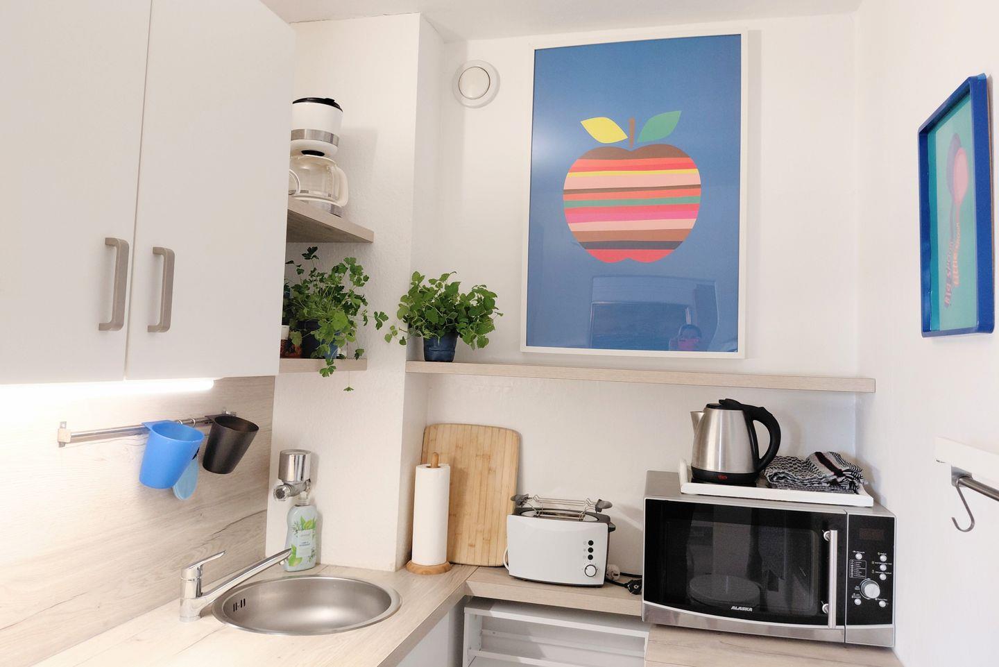 Eine voll ausgestattete Küchenzeile, ideal für ein Frühstück mit Blick ins Grüne, sowie ein Esstisch für 4 Personen
