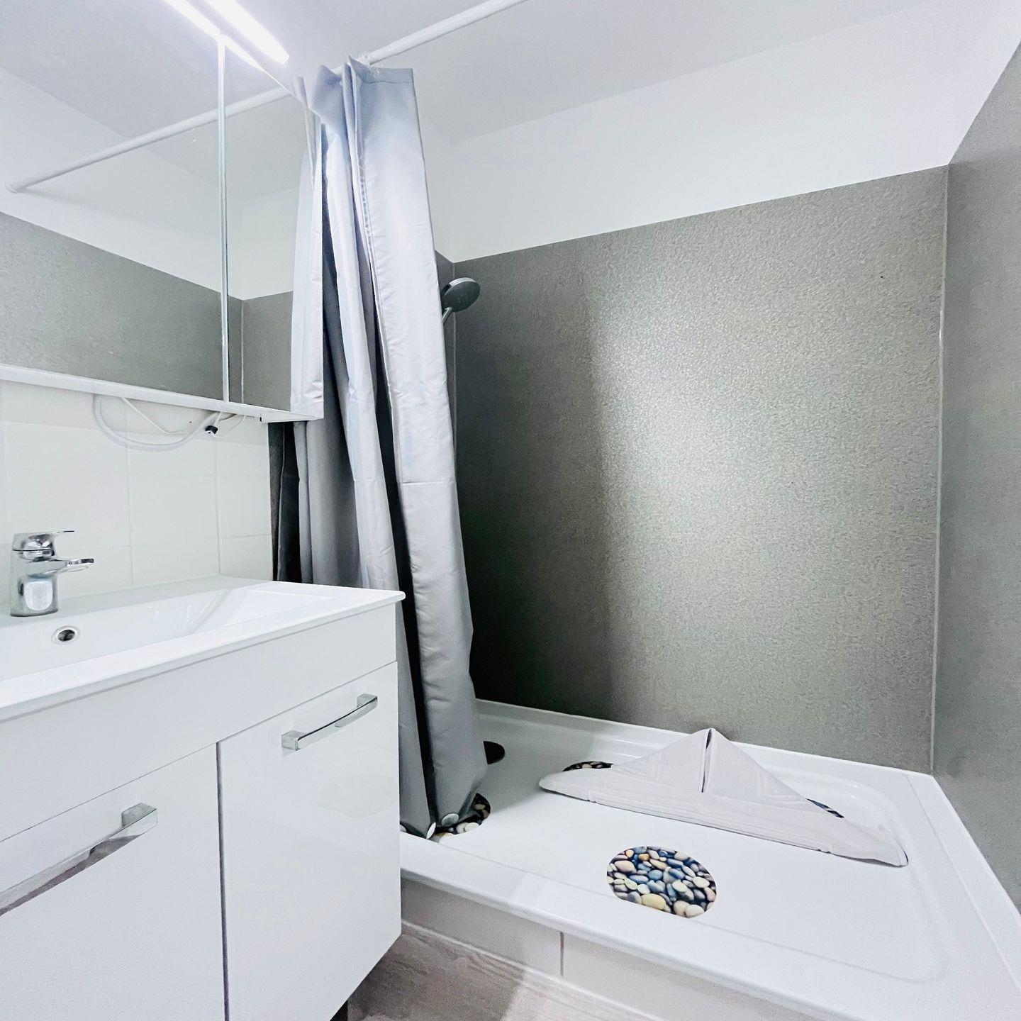 Ein modernes Badezimmer mit Dusche, Waschbecken, Handtuchwärmer und WC