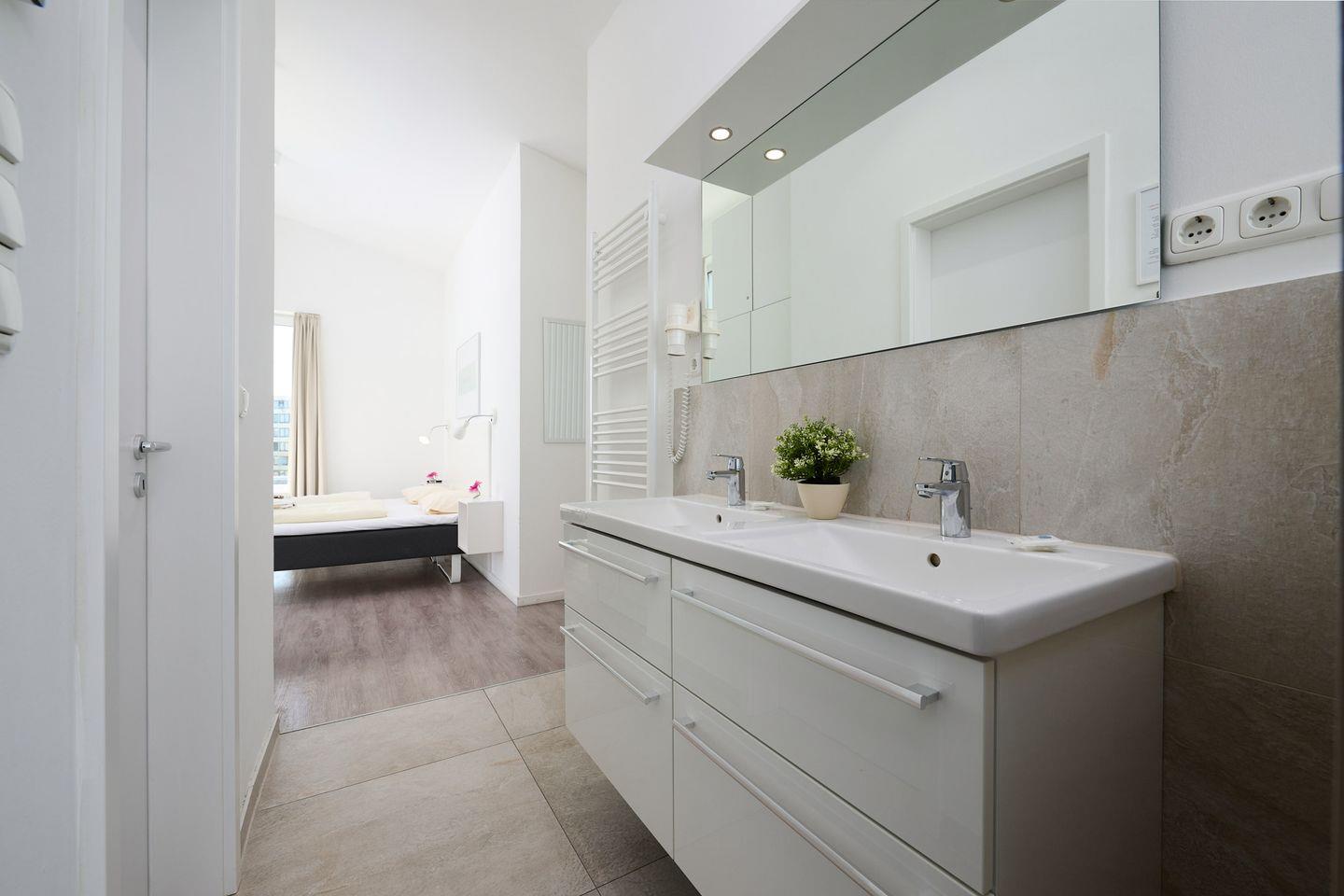 Schlafzimmer 1: Doppelbett (2x 90x200 cm), Kleiderschrank, TV, Bad, Verdunkelung: Vorhänge, Bad mit Dampfsauna und Whirlpool