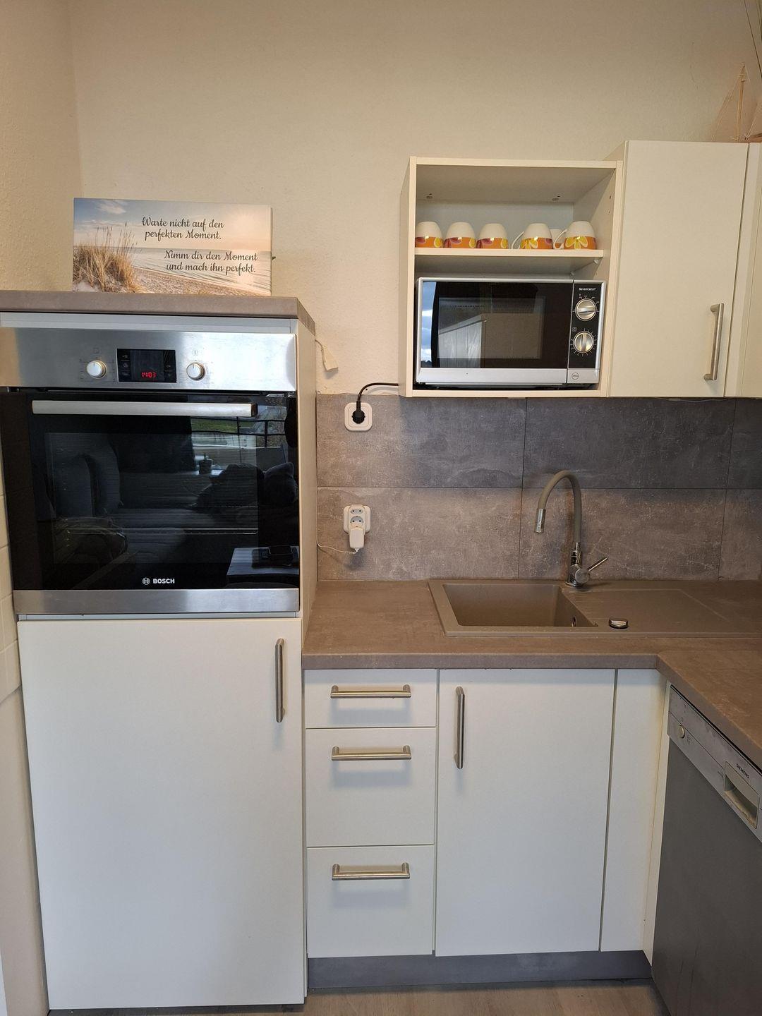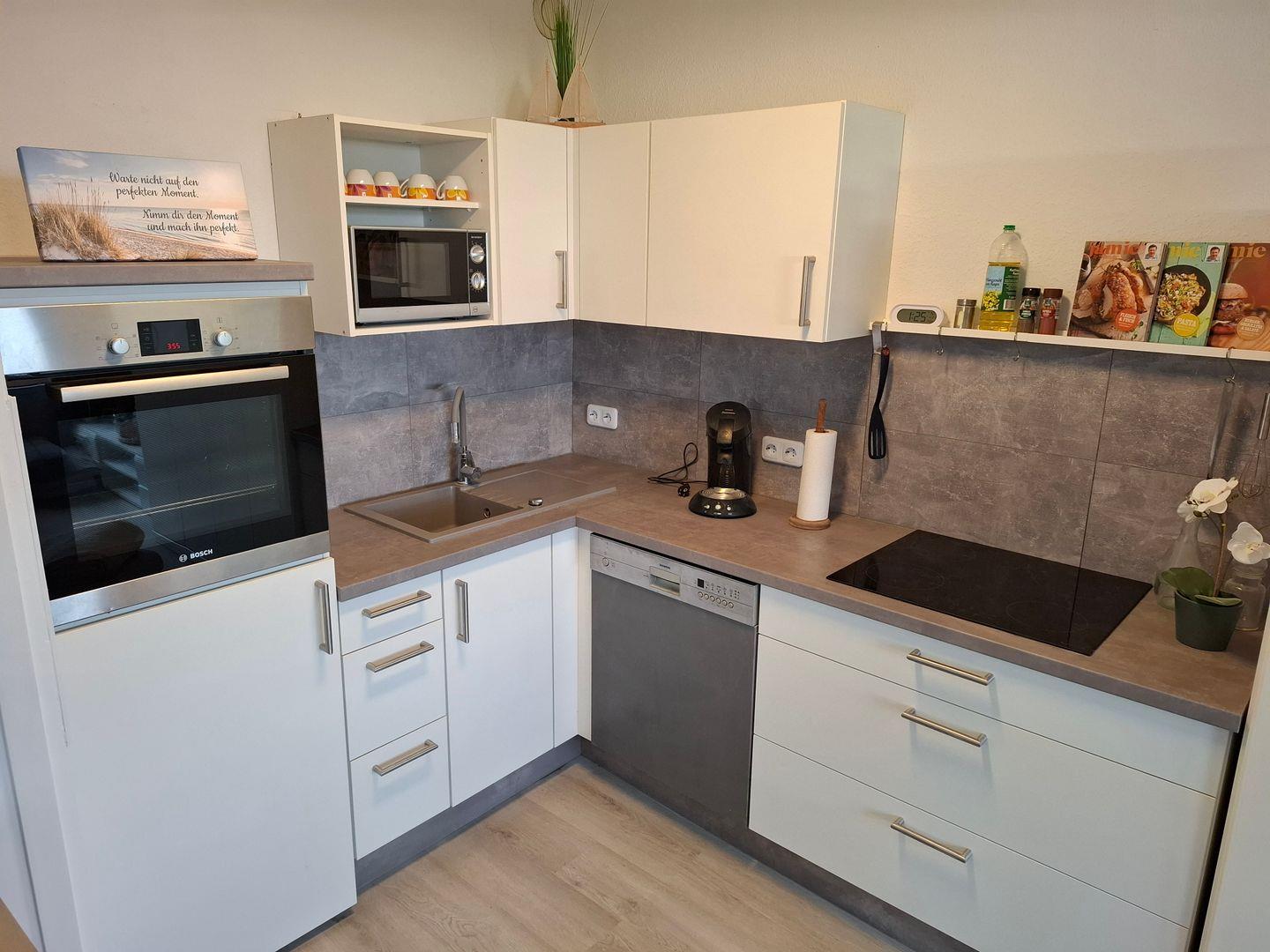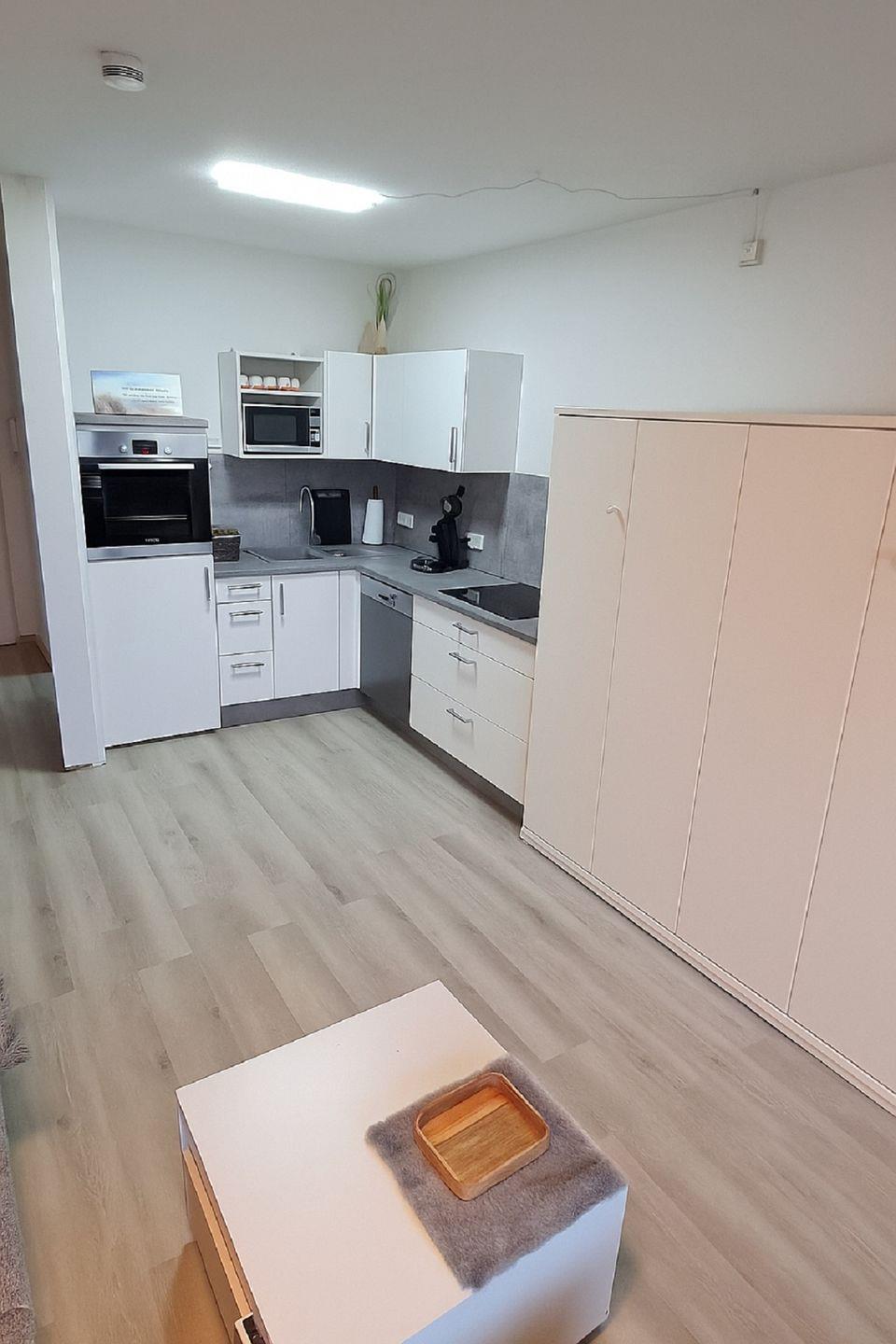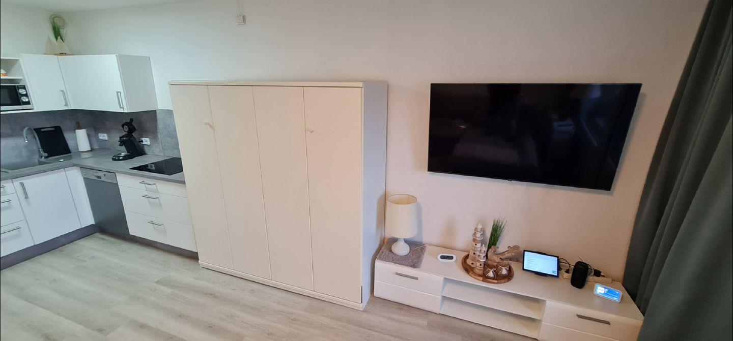 Die helle, offen gestaltete Ein-Raum-Ferienwohnung verfügt über ein großes Schlafsofa, ein Murphy-Schrankbett, einen Essbereich und eine moderne Küchenzeile. Diese ist offen zum Wohnraum und mit zahlreichen Annehmlichkeiten ausgestattet: Neben einem Induktionsherd, Backofen, Kühlschrank mit Gefrierfach, Mikrowelle und Spülmaschine sind auch eine Senseo-Espressomaschine, Toaster, Wasserkocher sowie Geschirr und Küchenutensilien vorhanden. Ein Esstisch bietet den perfekten Ort für gemeinsame Mahlzeiten.