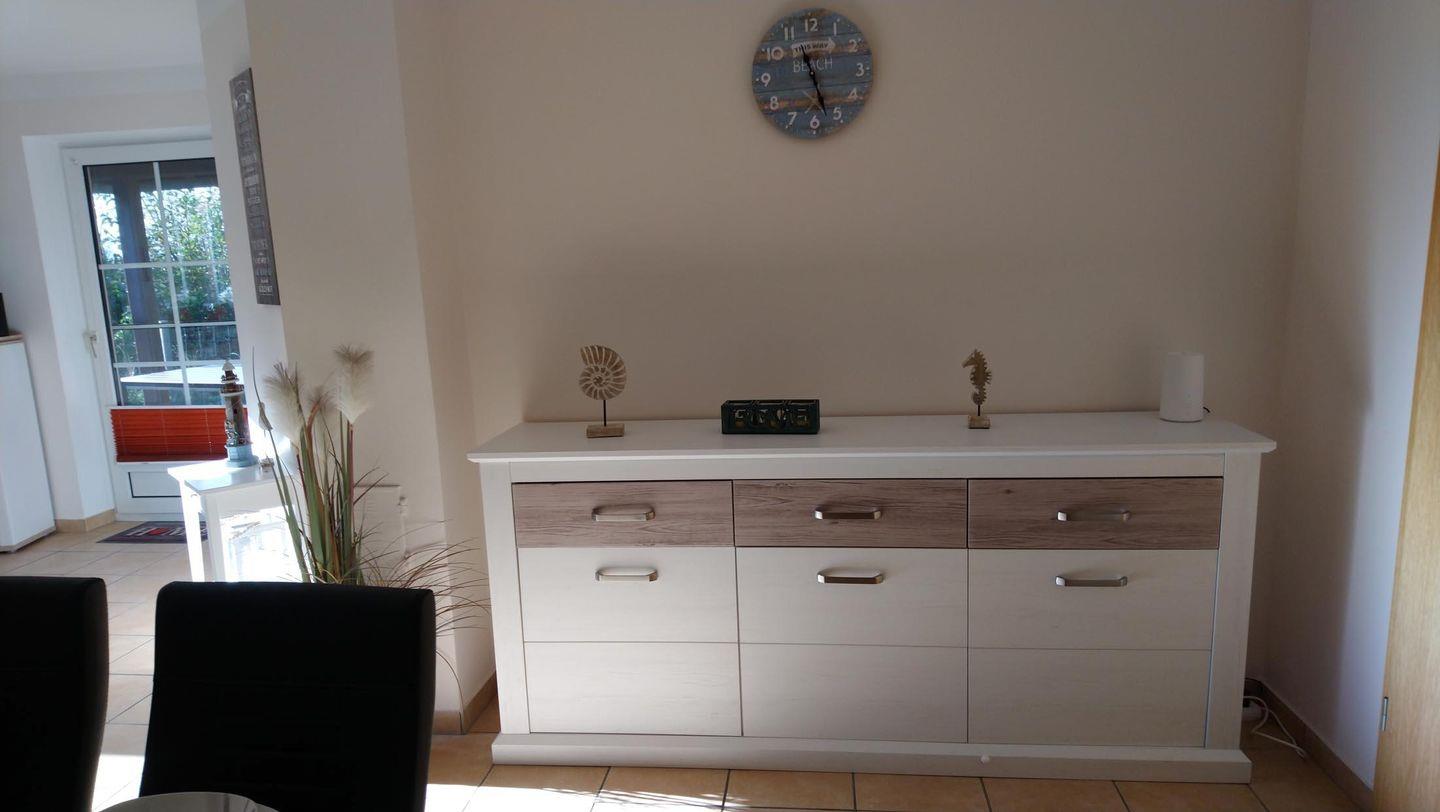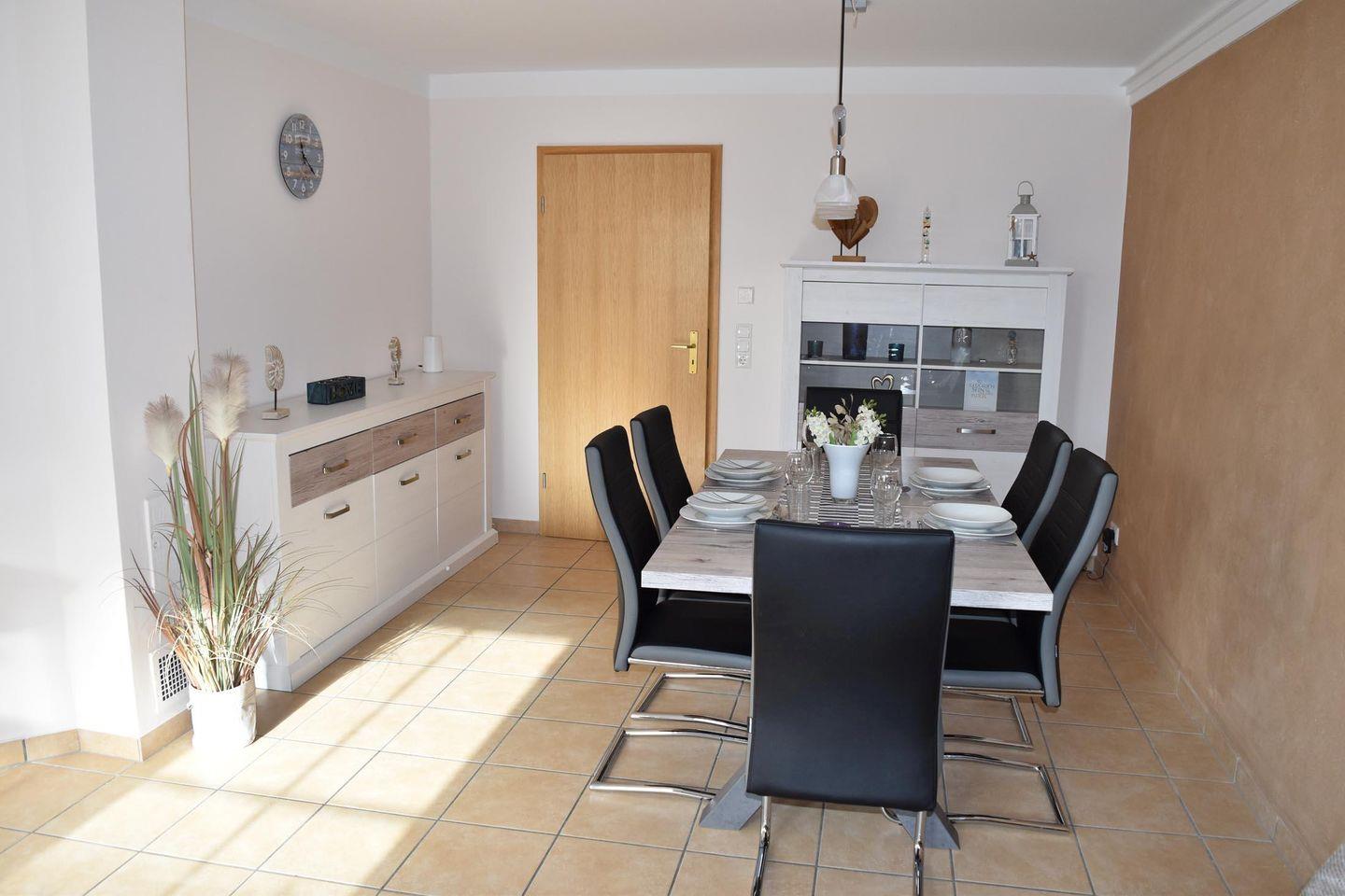 Essbereich: großer Tisch mit sechs Stühlen, Sideboard mit Spielen , Highboard.