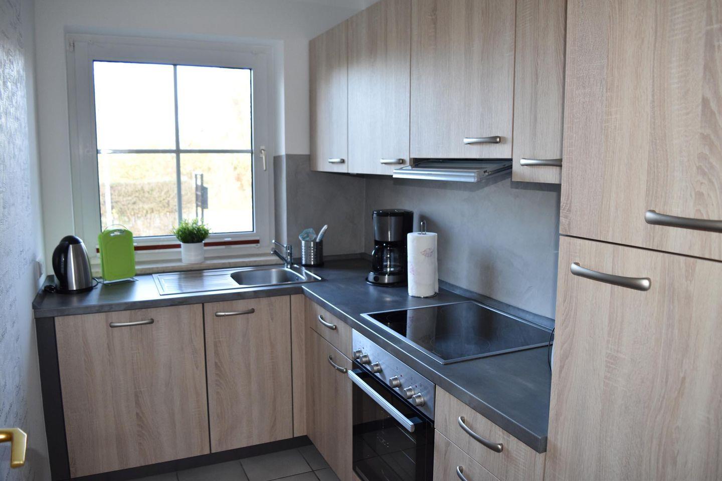 Komplett ausgestattet mit 4-Platten-Ceranfeld und Backofen (mit Heißluft), Dunstabzugshaube, Geschirrspüler, Mikrowelle, Kühlschrank mit Gefrierfach, Kaffeemaschine, Toaster, Wasserkocher, Mixer, Kochtöpfe, Geschirr und vielen weiteren nützlichen Dingen.