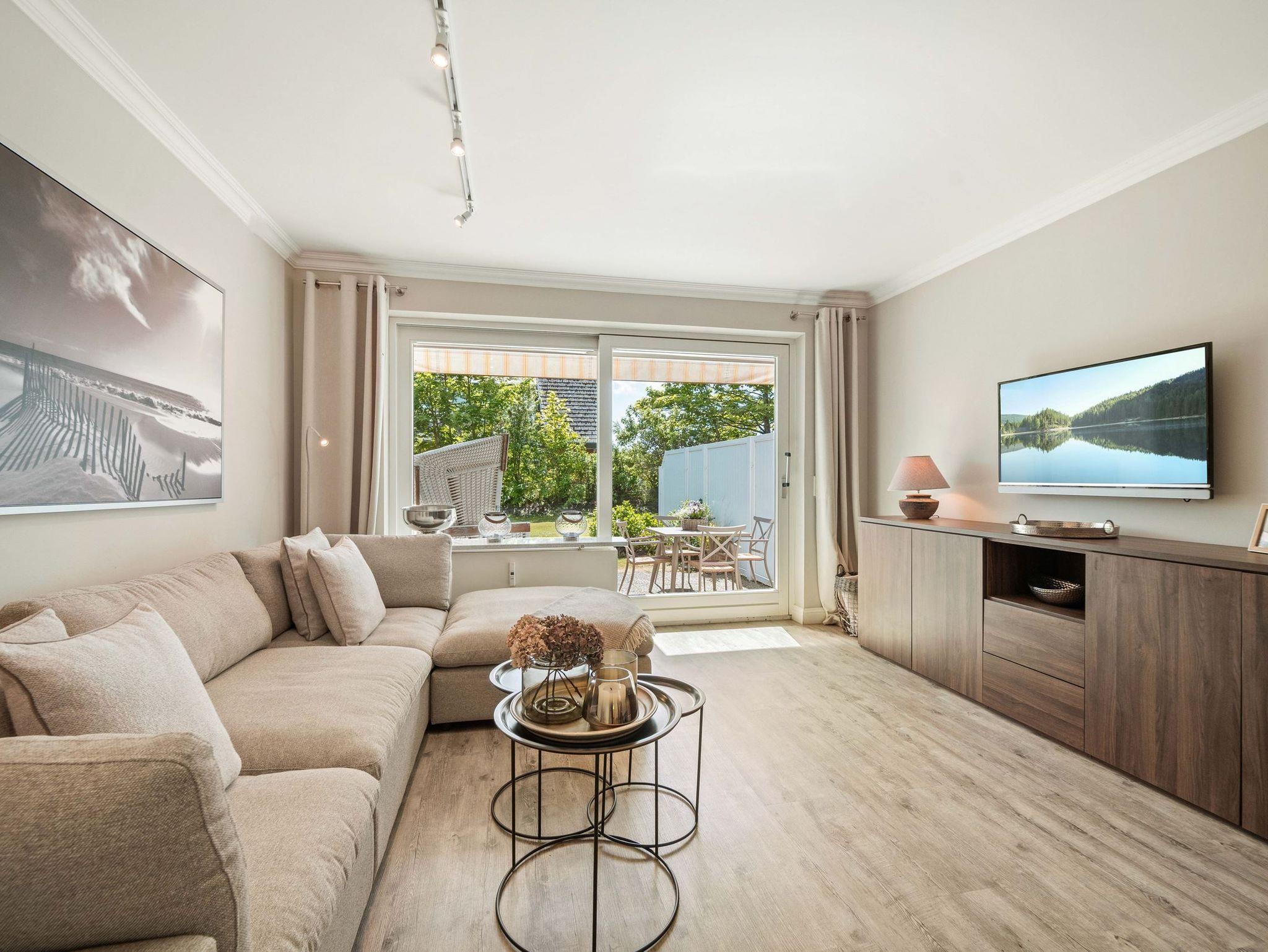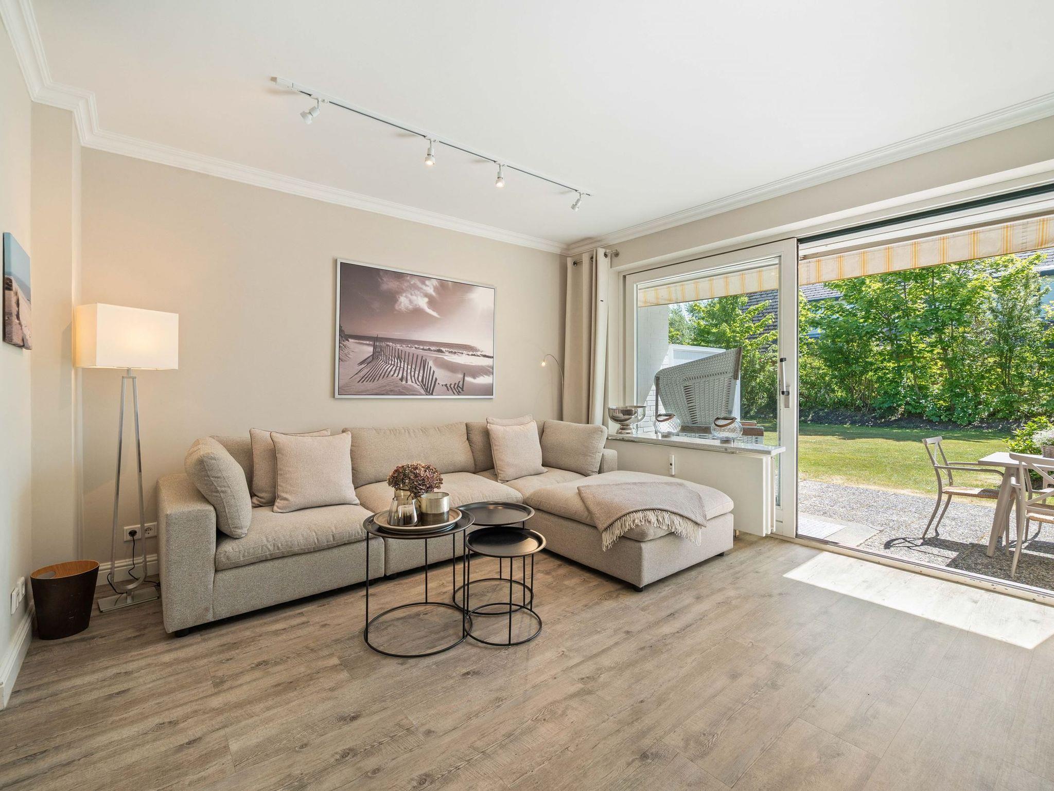 Die nach Süden ausgerichtete Terrasse mit dem sich anschließenden großen Garten lädt mit Strandkorb und Gartenmöbeln zum Verweilen ein.