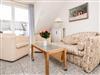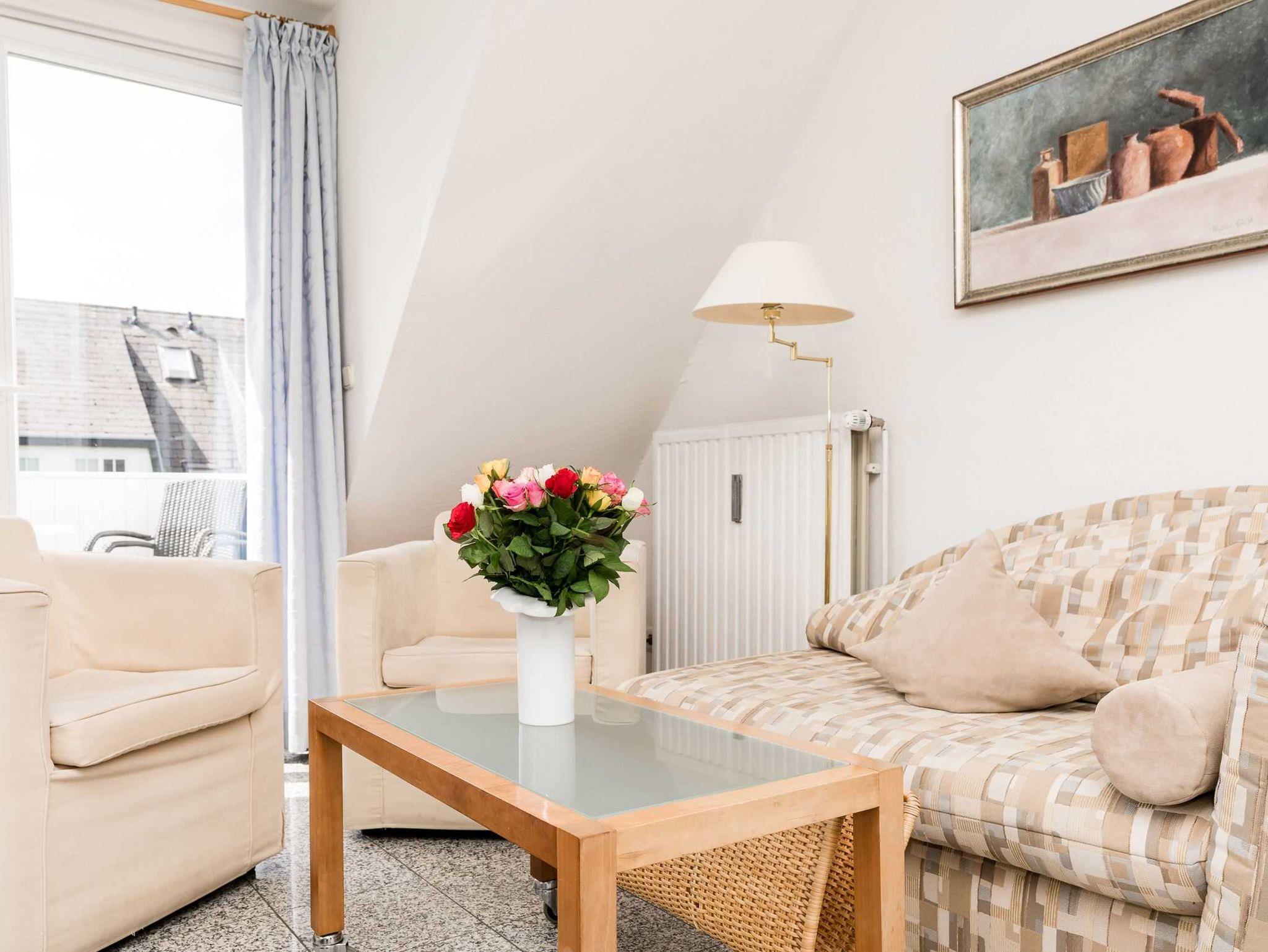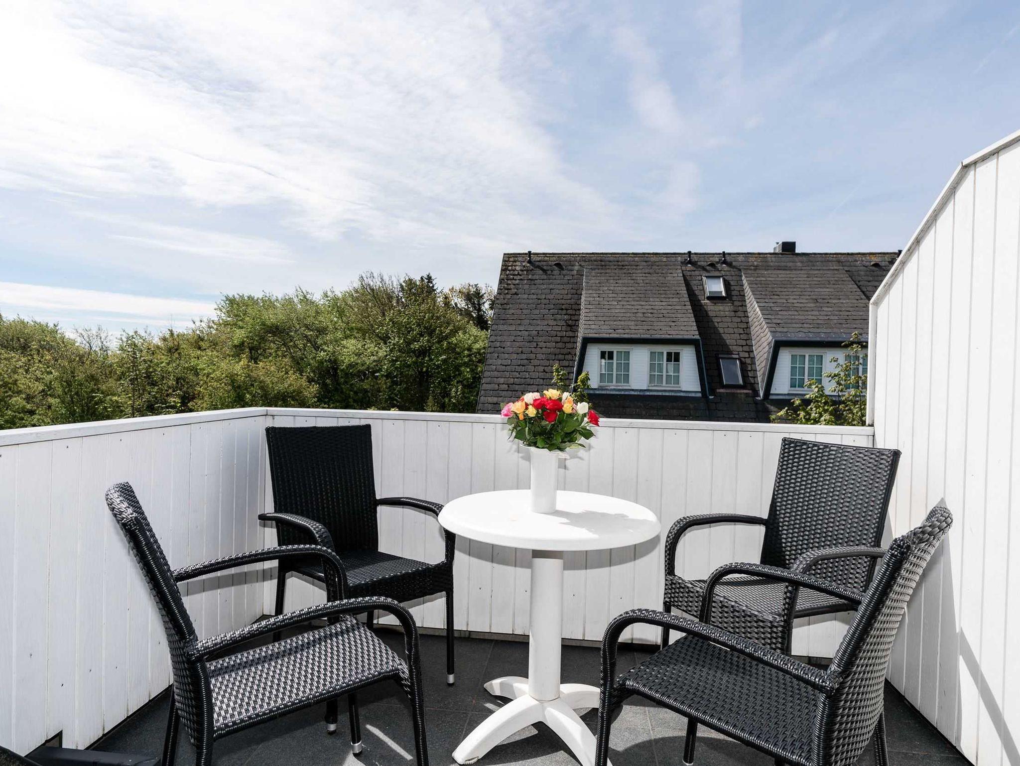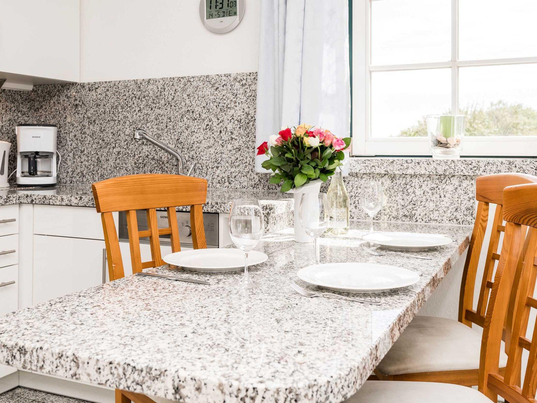 Das Wohnzimmer mit Küchenzeile ist ebenfalls mit Natursteinboden und sonstigen Natursteinbelegen (Tisch und Küchenarbeitsplatte)) versehen. Die Einrichtung im Friesenstil bietet ein behagliches Ambiente, eine kleine Bibliothek sorgt für Abwechslung an Regentagen. Der Balkon mit Sichtschutz zur Nachbarwohnung ist nach Süden ausgerichtet.