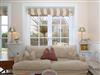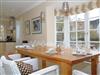 Ein helles Wohnzimmer mit großer Fensterfront zur möblierten Terrasse, Kaminofen. TV SAT/Kabel, Stereoanlage, Sofa.großer Eßtisch mit Bank und gemütlichen Stühlen, Ofen, CD-Player, Bücher, Blu-ray-Player