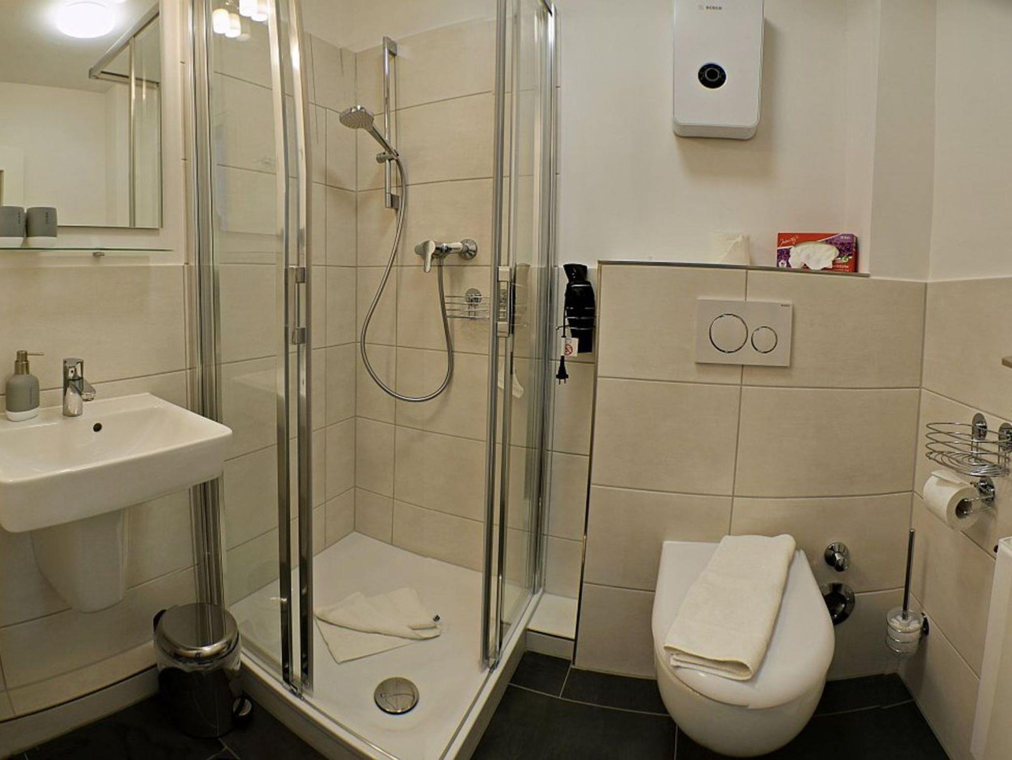 Ein innenliegendes Bad mit Waschbecken, Dusche, WC, Haartrockner