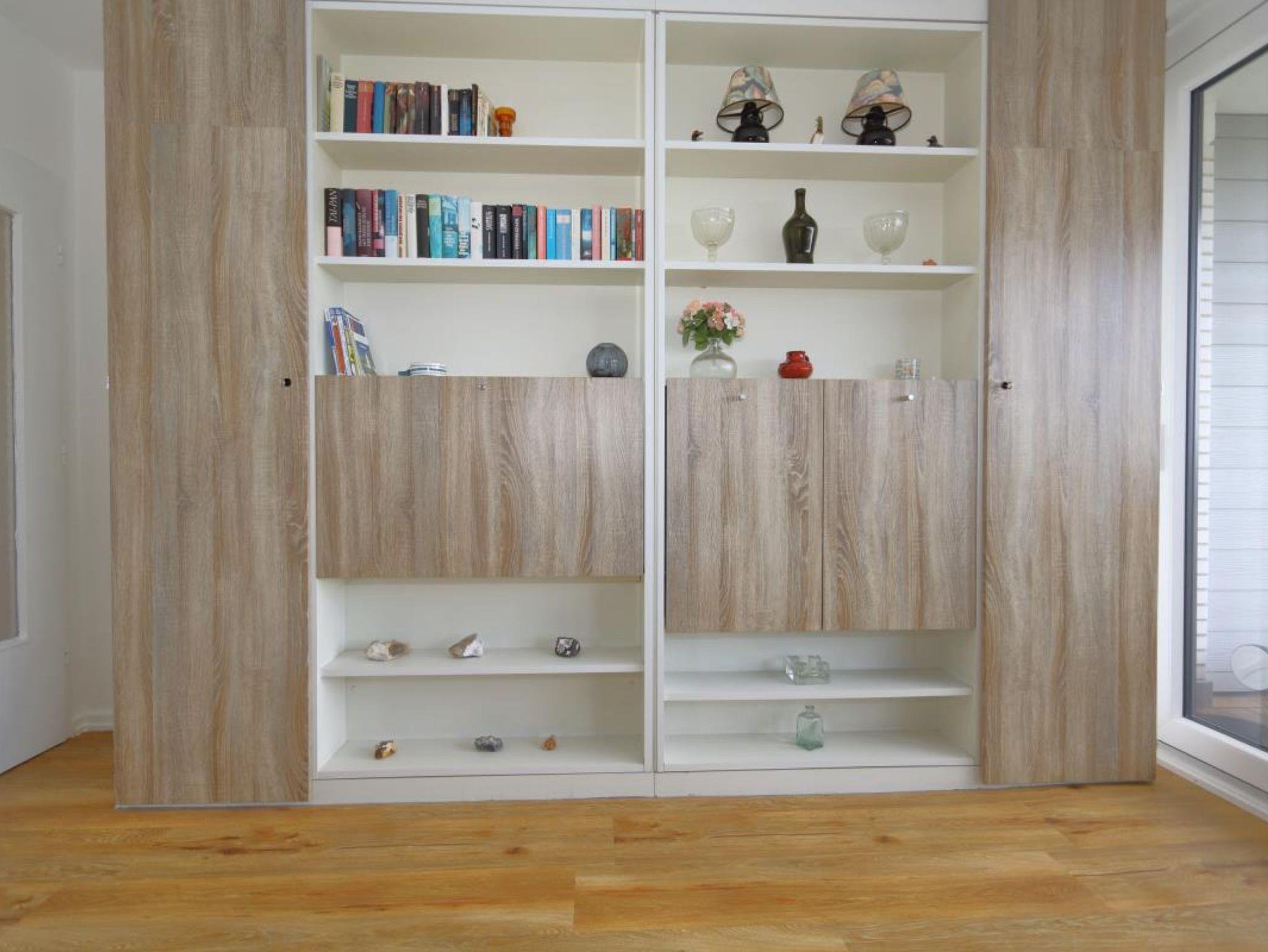 Ein helles Wohnzimmer mit Couch, Flachbild-TV und Essecke (ausziehbar aus dem Einbauschrank) ist der Mittelpunkt der Wohnung.