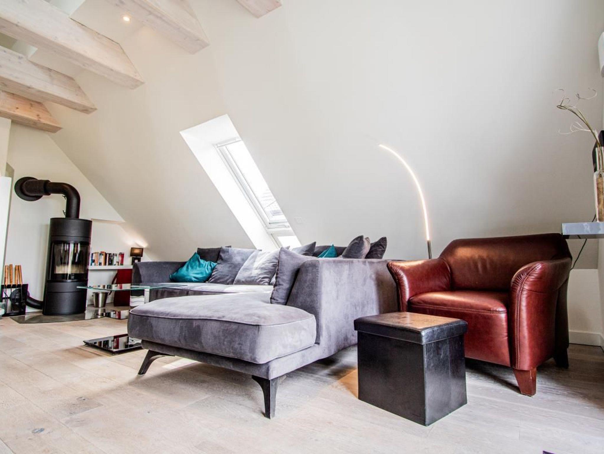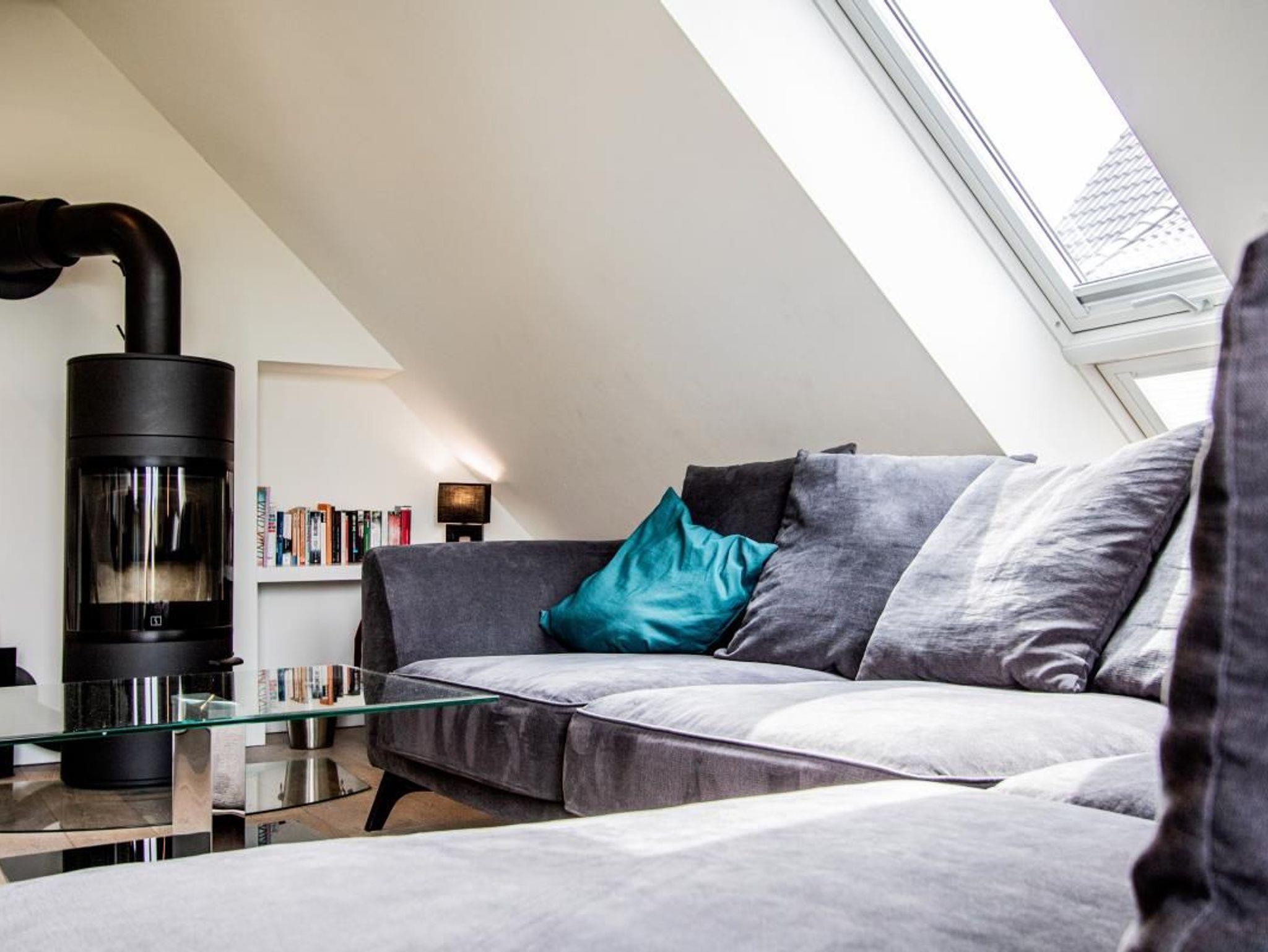 Ein helles Wohnzimmer mit großer Fensterfront zum möblierten Balkon, Kaminofen. TV SAT/Kabel, Radio, Sofa.