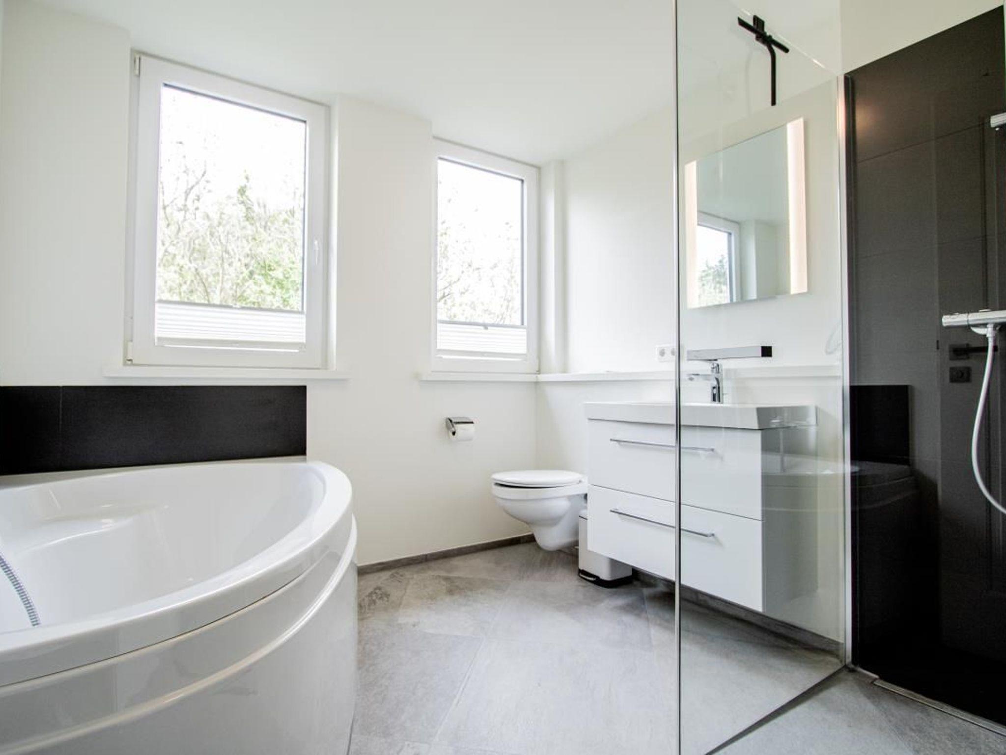 WC, Badewanne, Waschbecken, Fußbodenheizung, Dusche (bodengleich) Ausreichend Handtücher und Vorleger.
