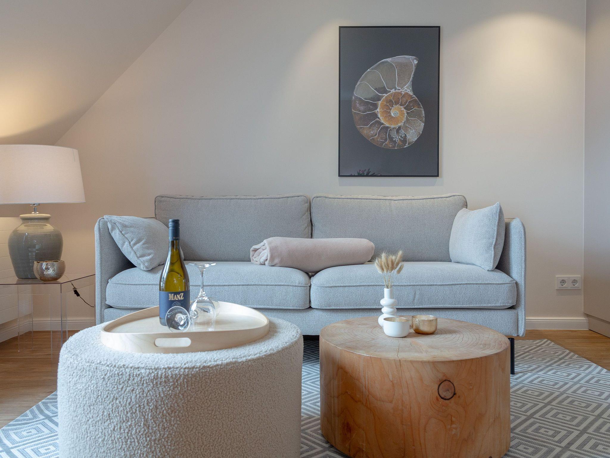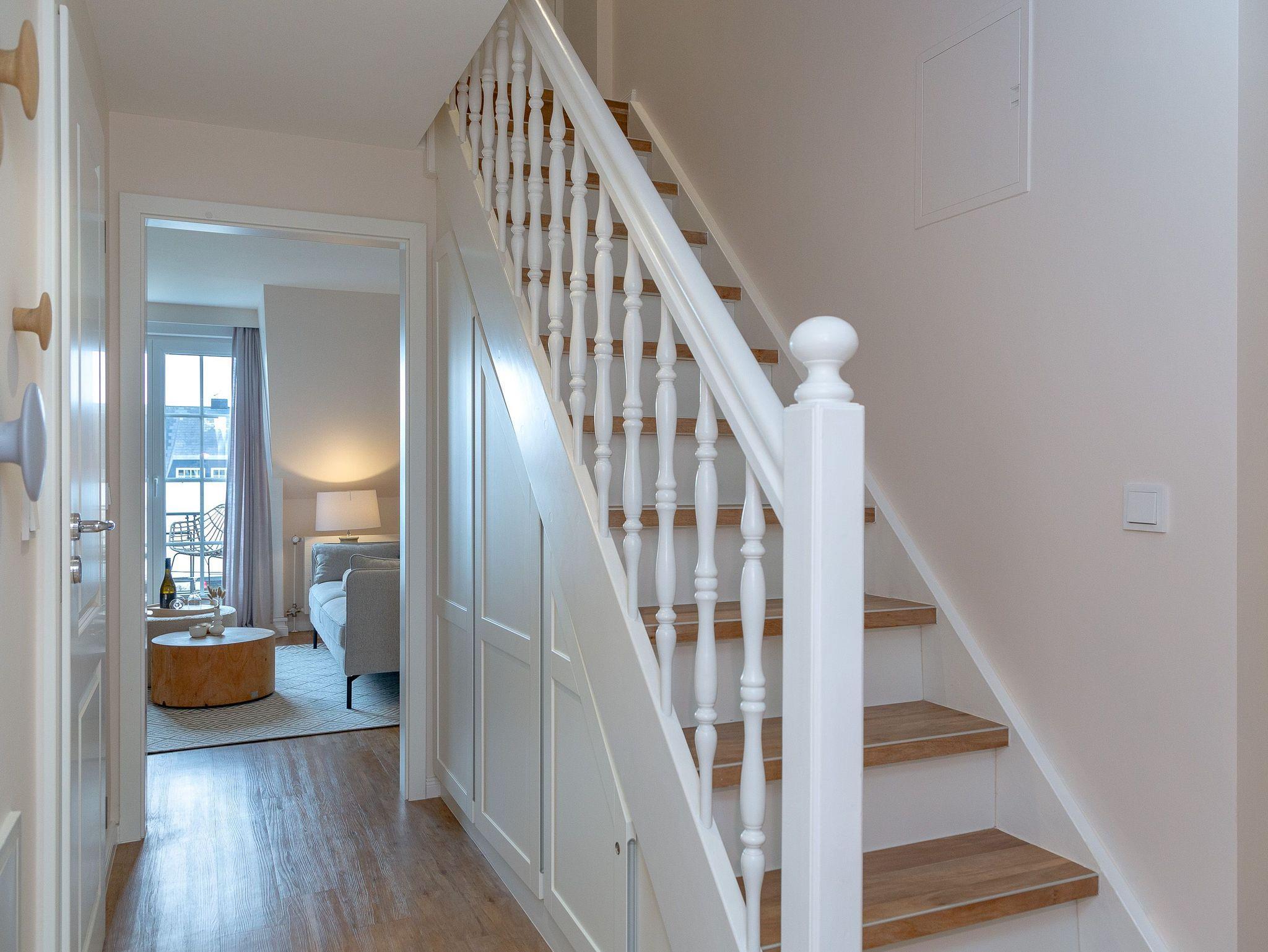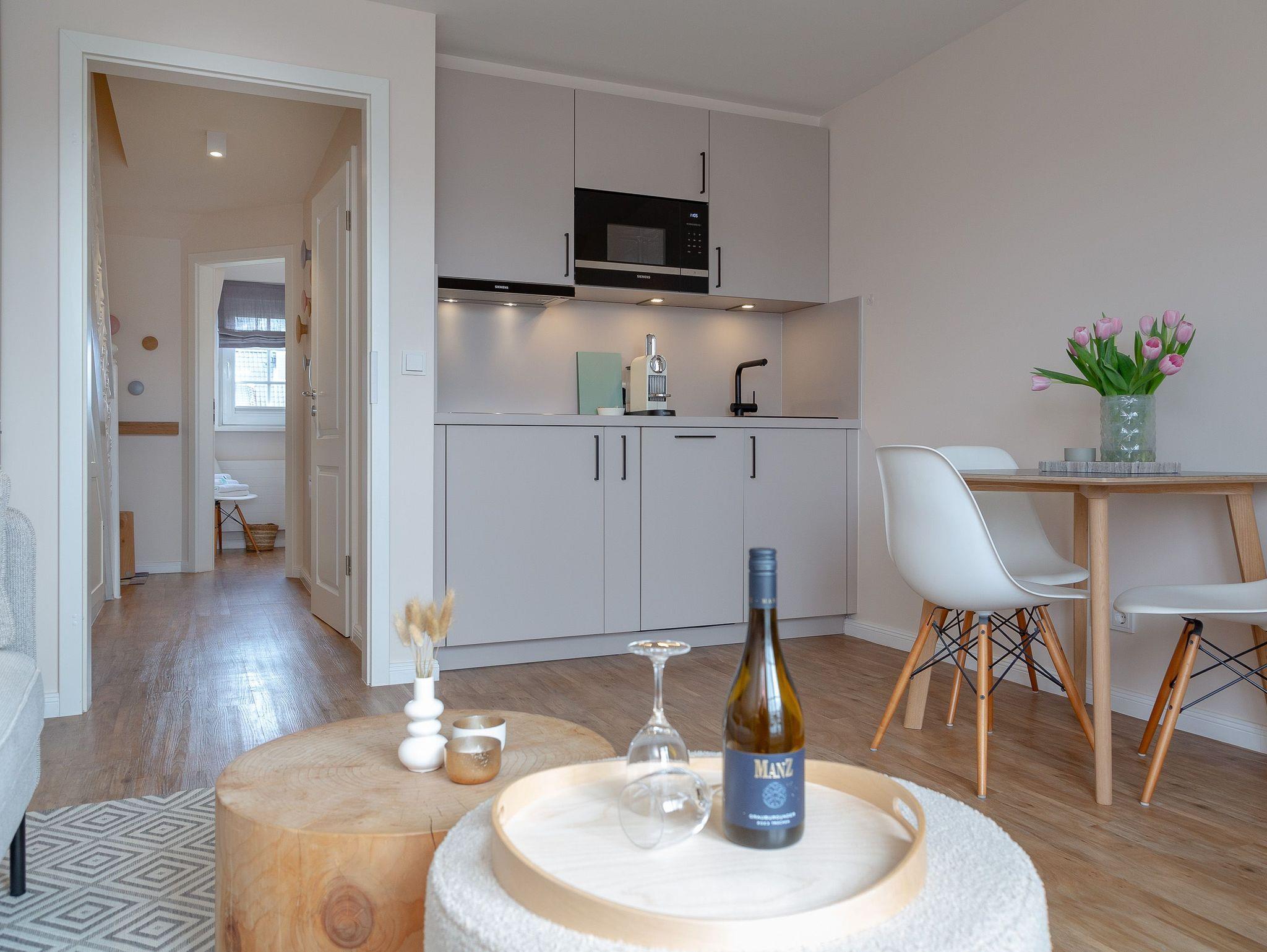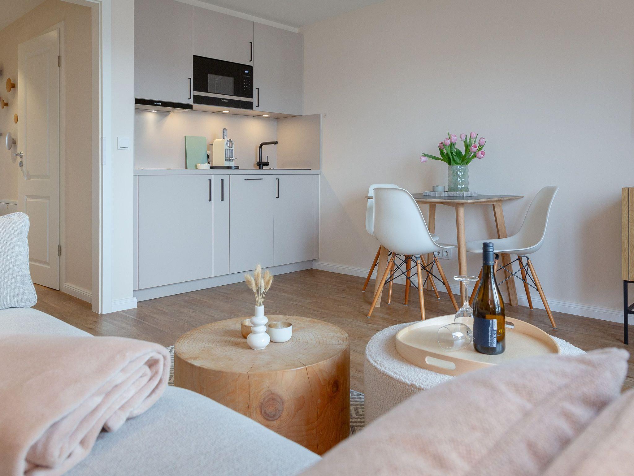OG: Wohnbereich mit Flat-TV und WLAN, integrierte, vollausgestattete Küchenzeile mit Spülmaschine, Cerankochfeld, Mikrowelle mit Grill, Nespressomaschine, Kühlschrank mit Gefrierfach, Toaster und Wasserkocher, Schlafzimmer mit Einzelbett, Safe, Bad mit Dusche und WC, sonniger Südbalkon, eigener Strandkorb in der Sonnenkuhle