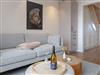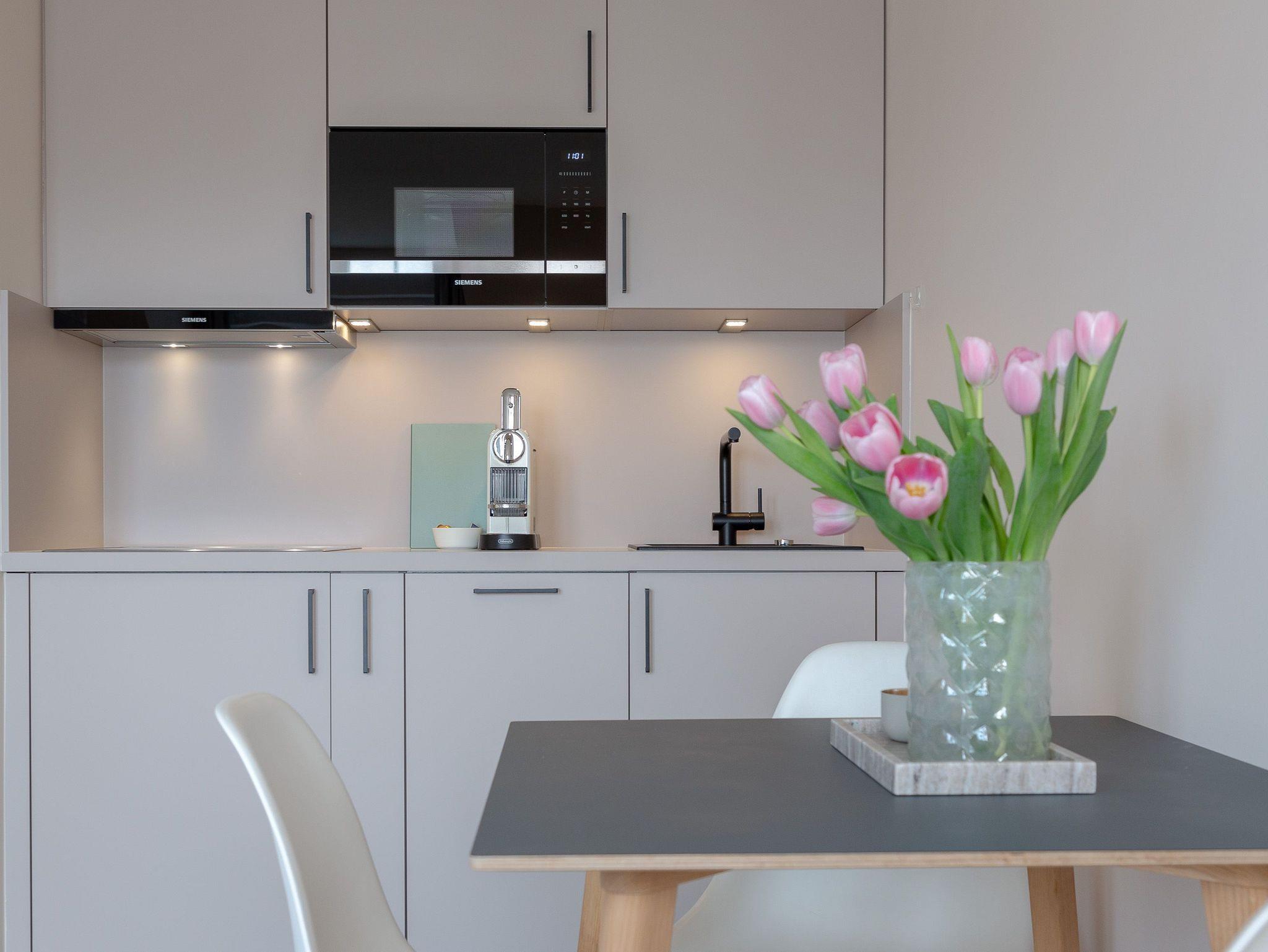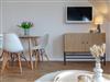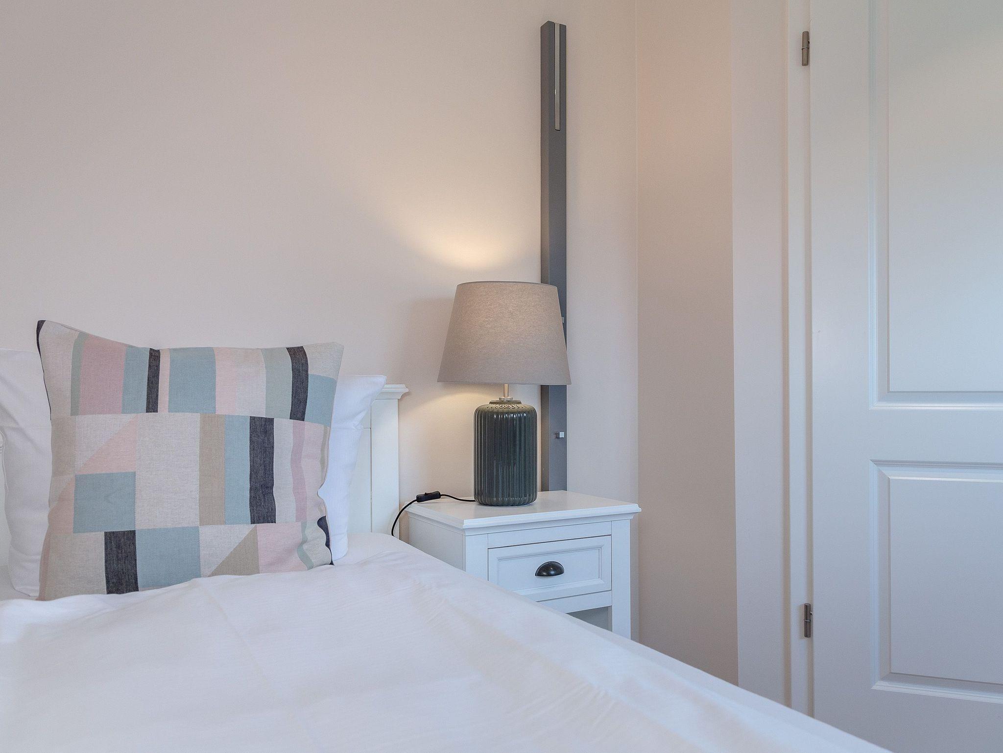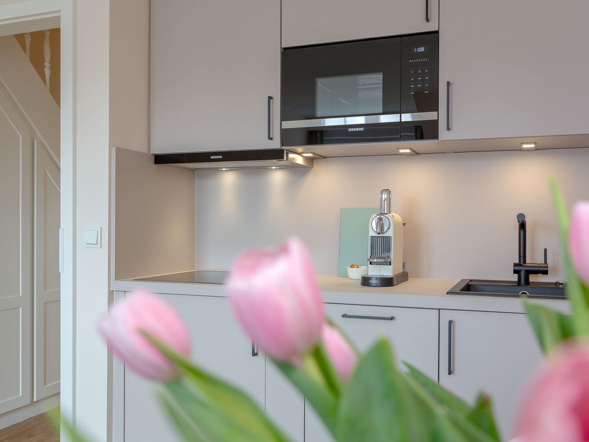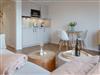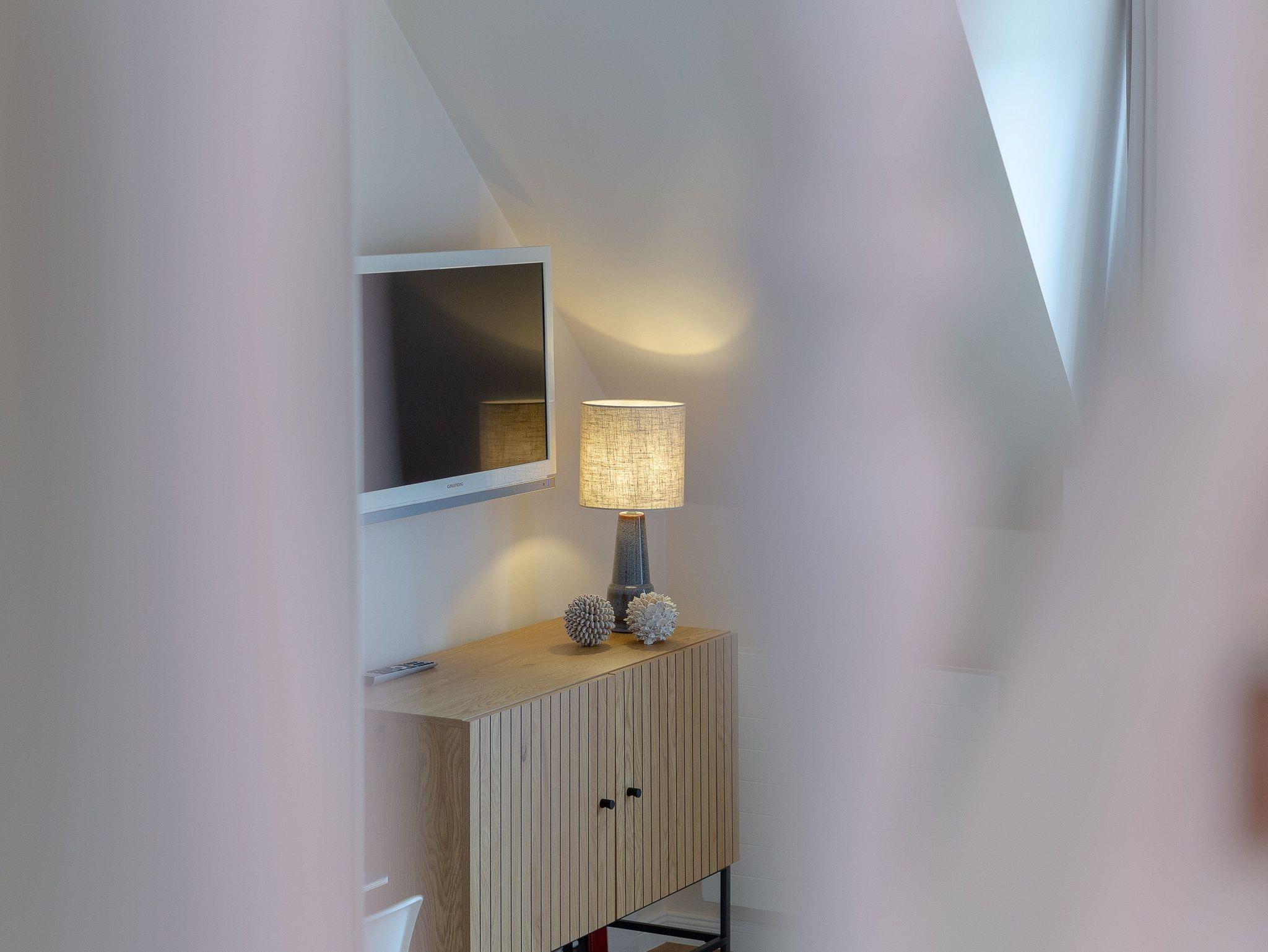 OG: Wohnbereich mit Flat-TV und WLAN, integrierte, vollausgestattete Küchenzeile mit Spülmaschine, Cerankochfeld, Mikrowelle mit Grill, Nespressomaschine, Kühlschrank mit Gefrierfach, Toaster und Wasserkocher, Schlafzimmer mit Einzelbett, Safe, Bad mit Dusche und WC, sonniger Südbalkon, eigener Strandkorb in der Sonnenkuhle