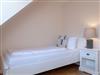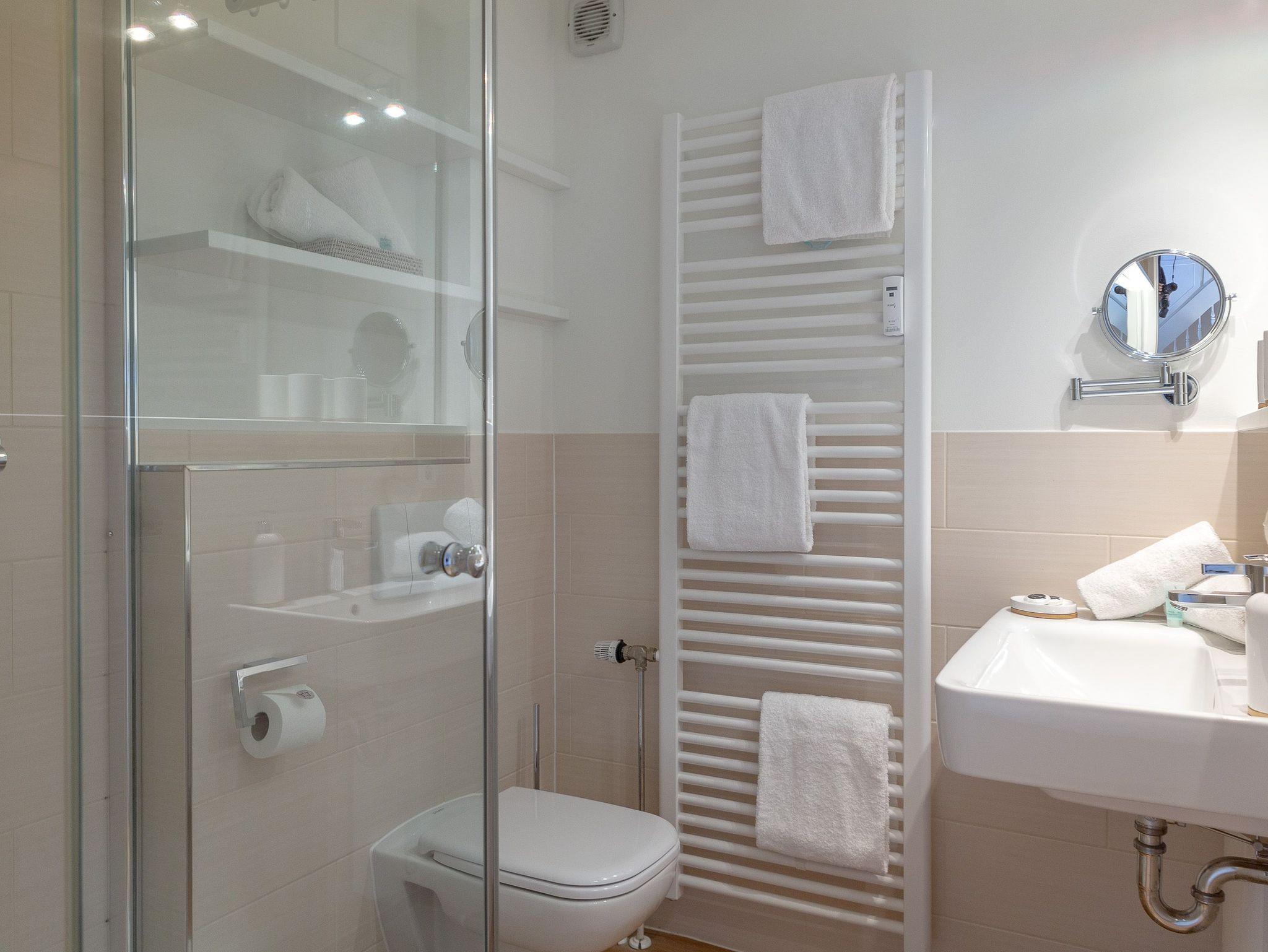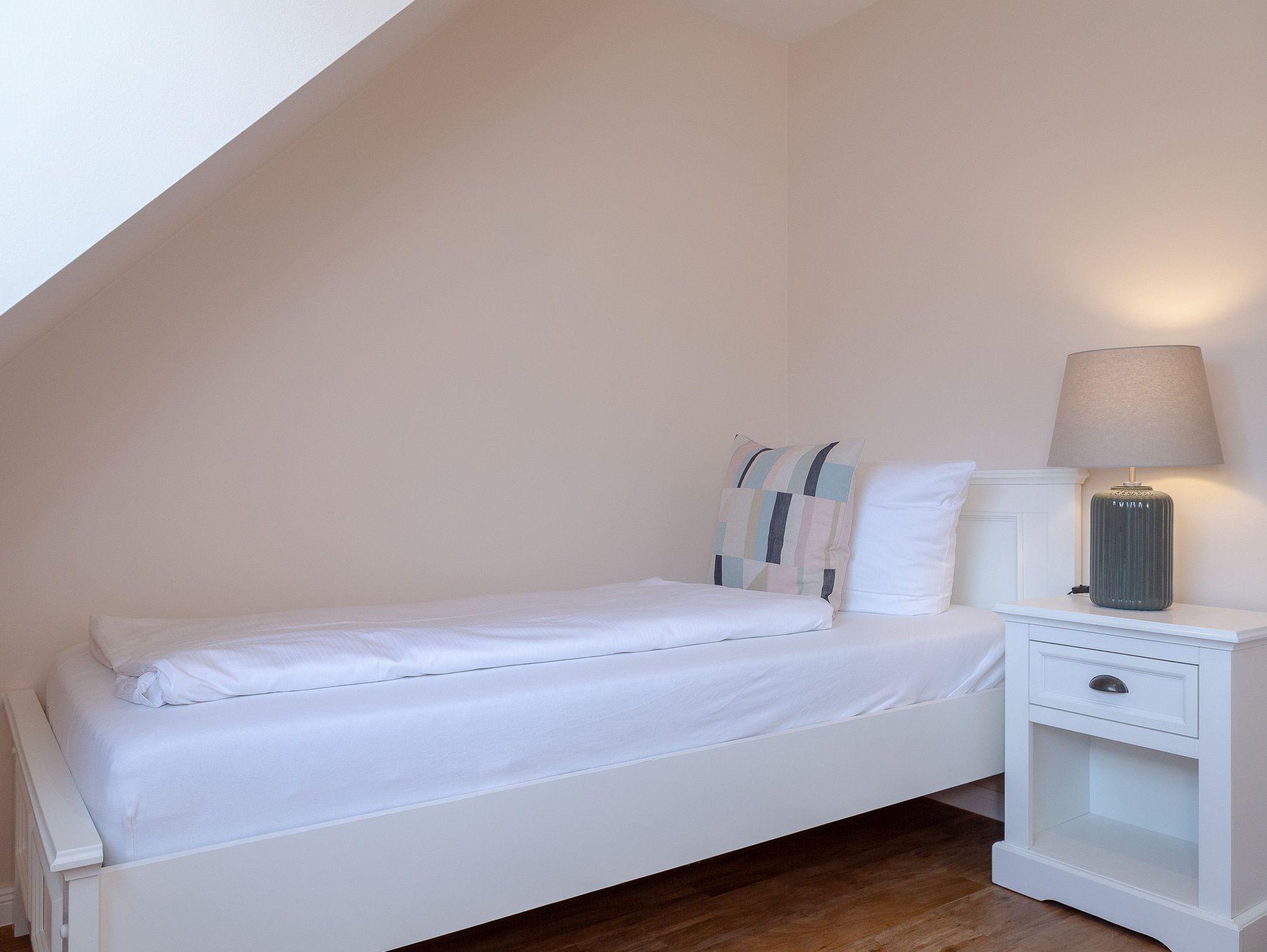 Auf gleicher Ebene zum Wohnbereich bietet Ihnen die Wohnung ein Schlafzimmer mit einem Einzelbett und ein Badezimmer mit Dusche und WC sowie noch ein separates Gäste WC. Einen weiteren Raum mit Doppelbett und Flatscreen-TV finden Sie im Dachgeschoss.