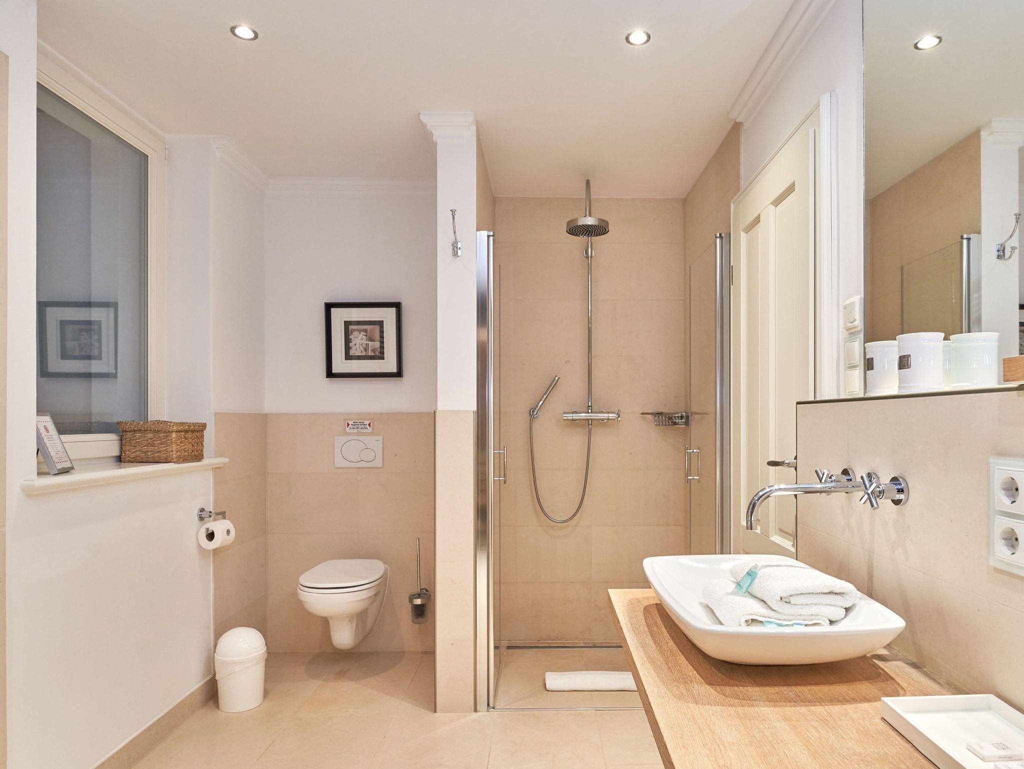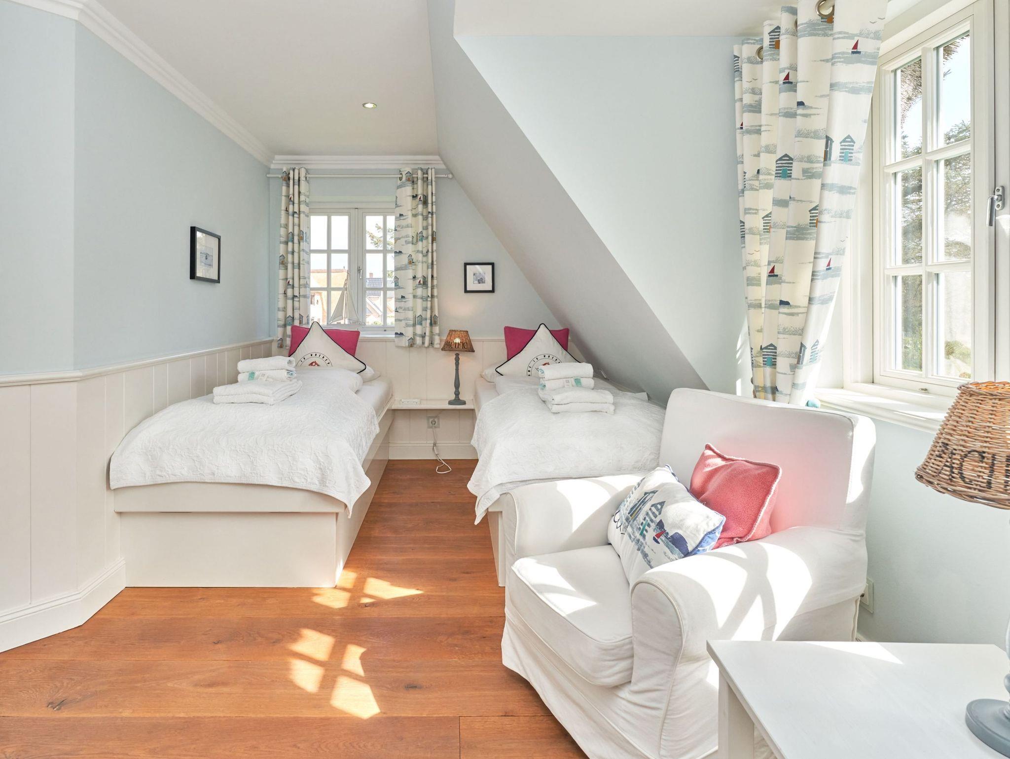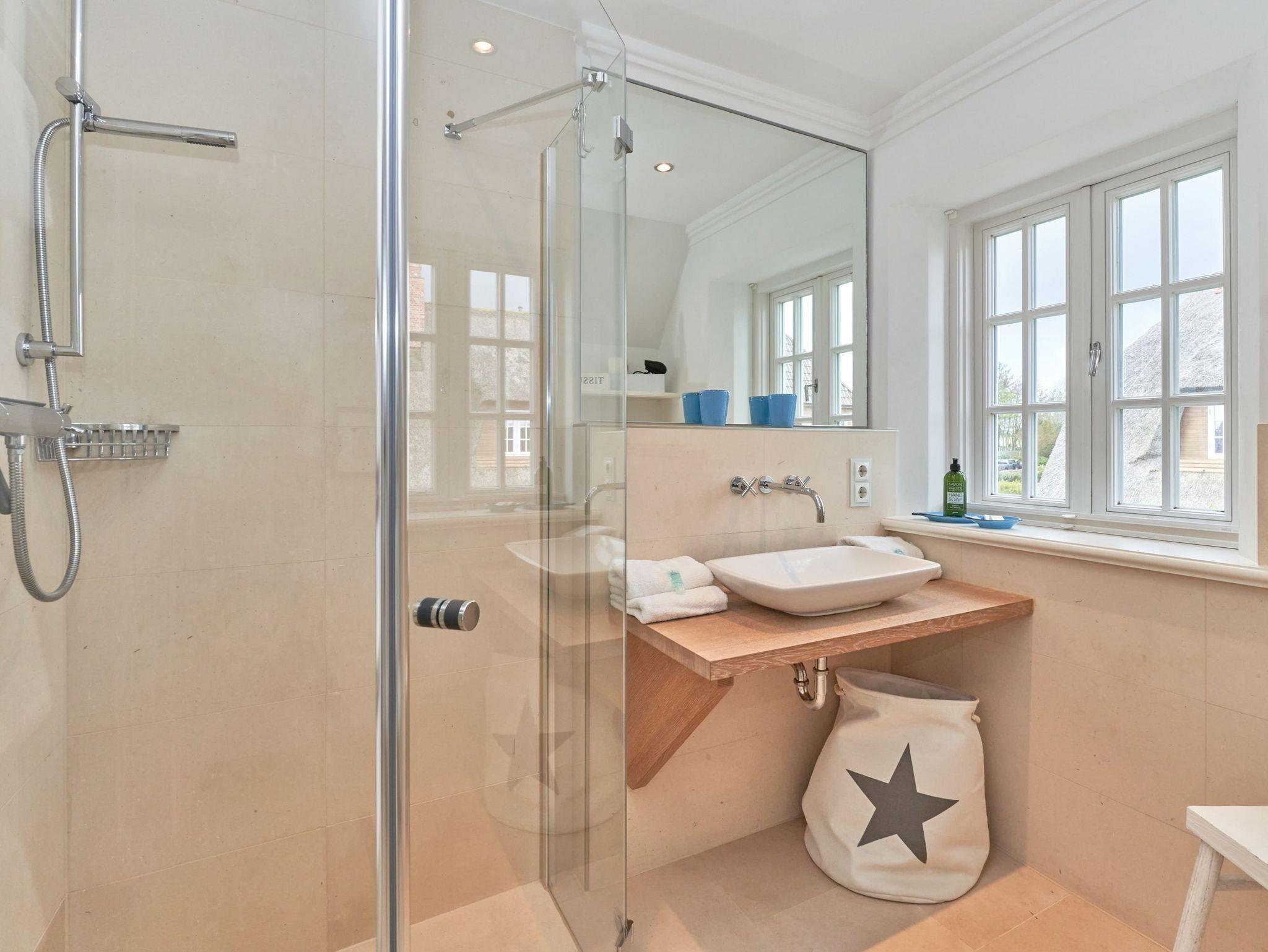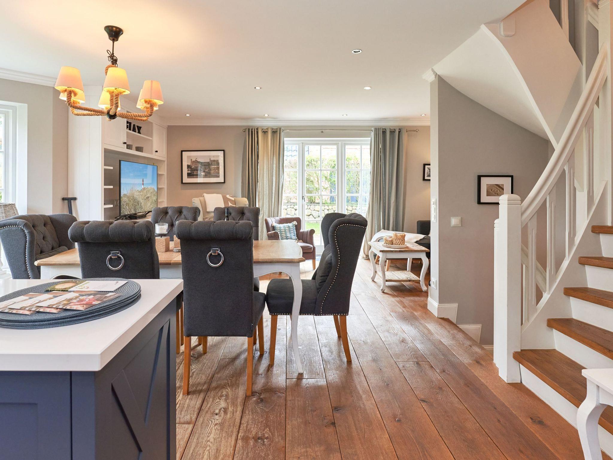 Exklusive Doppelhaushälfte unter Reet im Hampton Style für bis zu 8 Personen. Außen Sylt , innen Hamptons. Über einen kleinen Vorflur mit Garderobe gelangt man in das großzügige Wohnzimmer mit seiner offenen Küche mit den angrenzenden Essplatz für gemütliche Abende. Auffällig und besonders neben der hochwertigen Ausstattung ist das Beleuchtungskonzept sowie die Holzeinbauten mit IPhone - Ladestationen. Im Obergeschoss verfügt über zwei Schlafzimmer und ein Badezimmer mit bodengleicher Dusche. Der ausgebaute Spitzboden verfügt über zwei weitere Einzelbetten. Im Untergeschoss befindet ein Schlafzimmer mit Doppelbett und Schrankeinbauten sowie ein weiteres Wohn und Schlafzimmer. Eine Sauna mit großzügigen Bad ist ebenfalls vorhanden. Der Technik und Hauswirtschafsraum verfügt über eine Waschmaschine und Trockner.