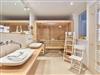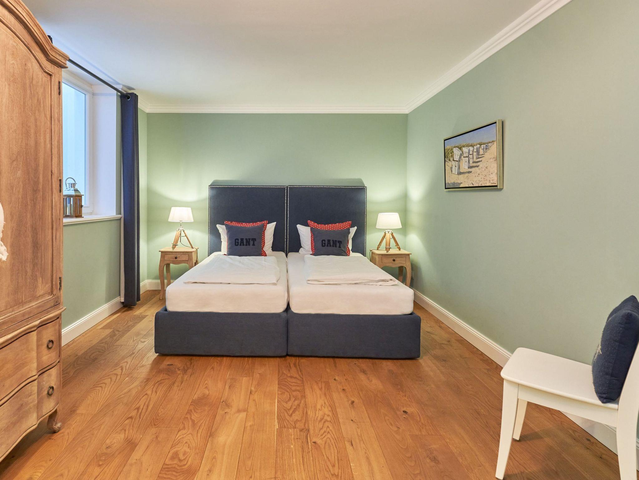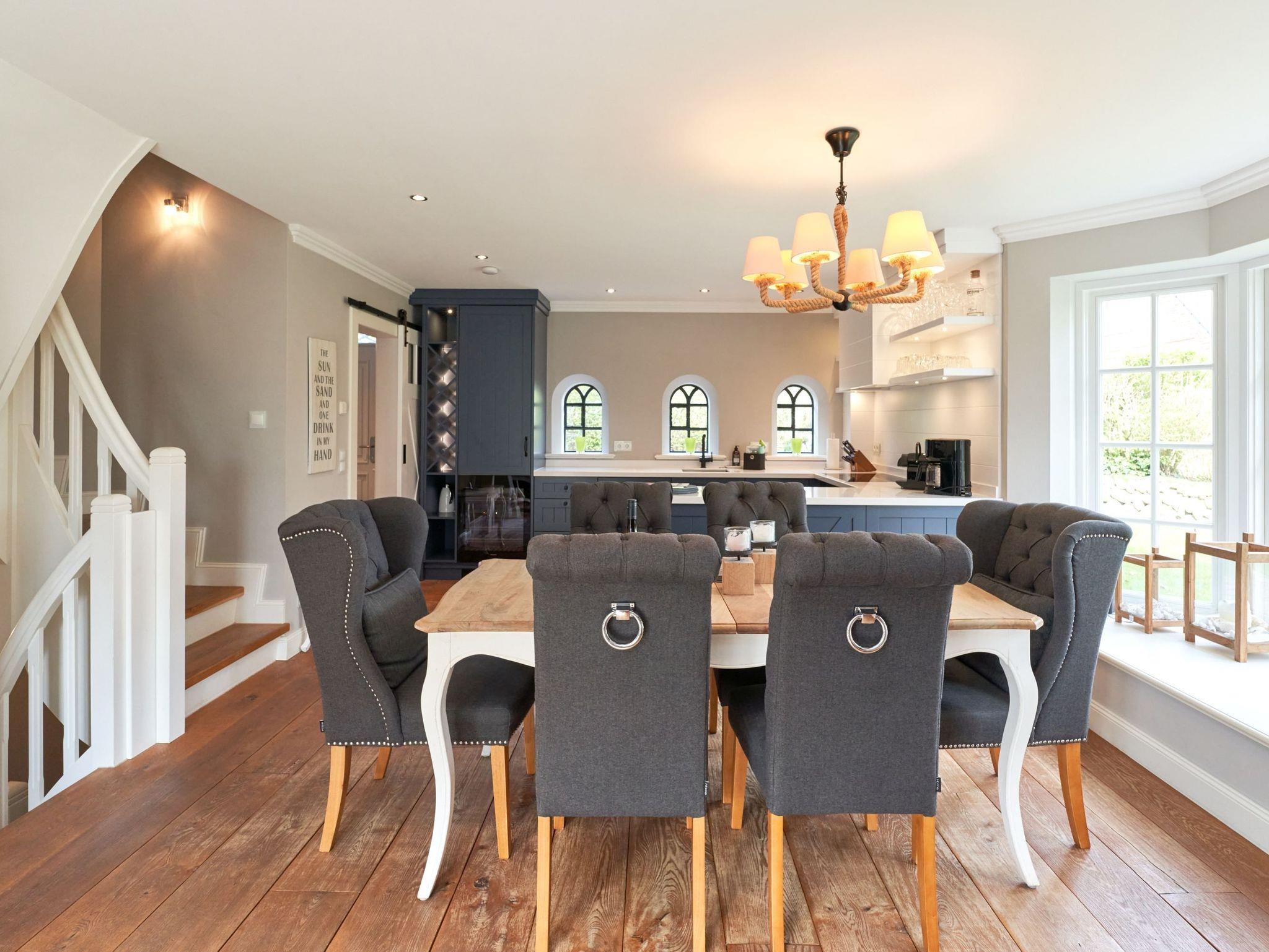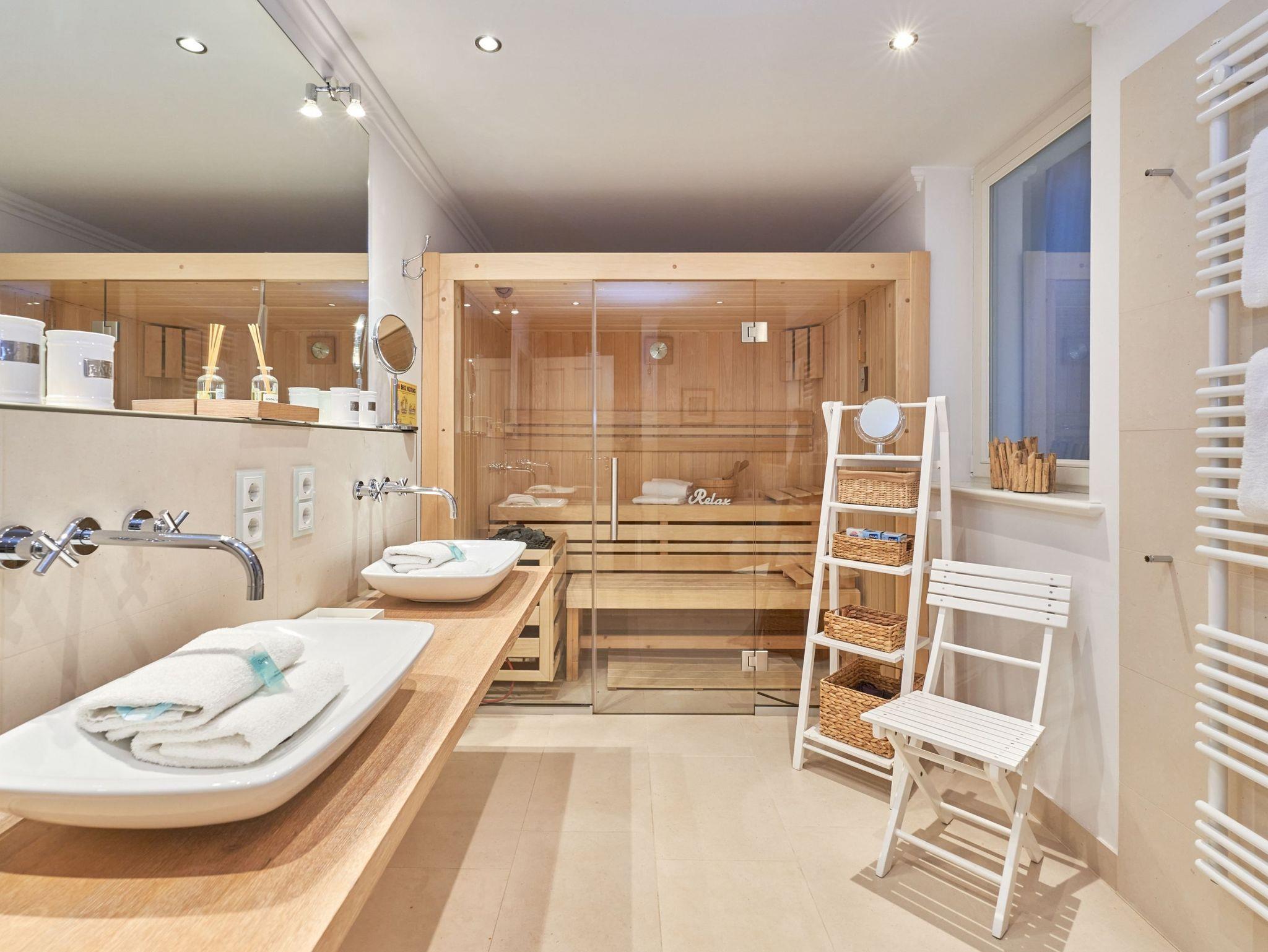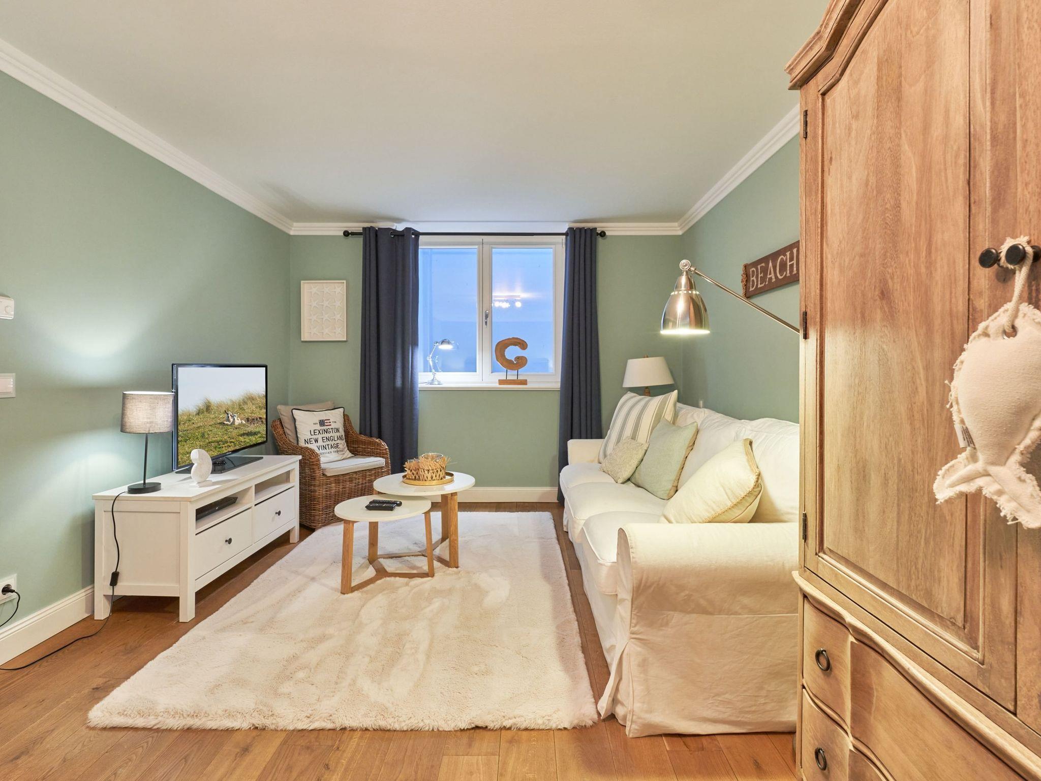 Exklusive Doppelhaushälfte unter Reet im Hampton Style für bis zu 8 Personen. Außen Sylt , innen Hamptons. Über einen kleinen Vorflur mit Garderobe gelangt man in das großzügige Wohnzimmer mit seiner offenen Küche mit den angrenzenden Essplatz für gemütliche Abende. Auffällig und besonders neben der hochwertigen Ausstattung ist das Beleuchtungskonzept sowie die Holzeinbauten mit IPhone - Ladestationen. Im Obergeschoss verfügt über zwei Schlafzimmer und ein Badezimmer mit bodengleicher Dusche. Der ausgebaute Spitzboden verfügt über zwei weitere Einzelbetten. Im Untergeschoss befindet ein Schlafzimmer mit Doppelbett und Schrankeinbauten sowie ein weiteres Wohn und Schlafzimmer. Eine Sauna mit großzügigen Bad ist ebenfalls vorhanden. Der Technik und Hauswirtschafsraum verfügt über eine Waschmaschine und Trockner.