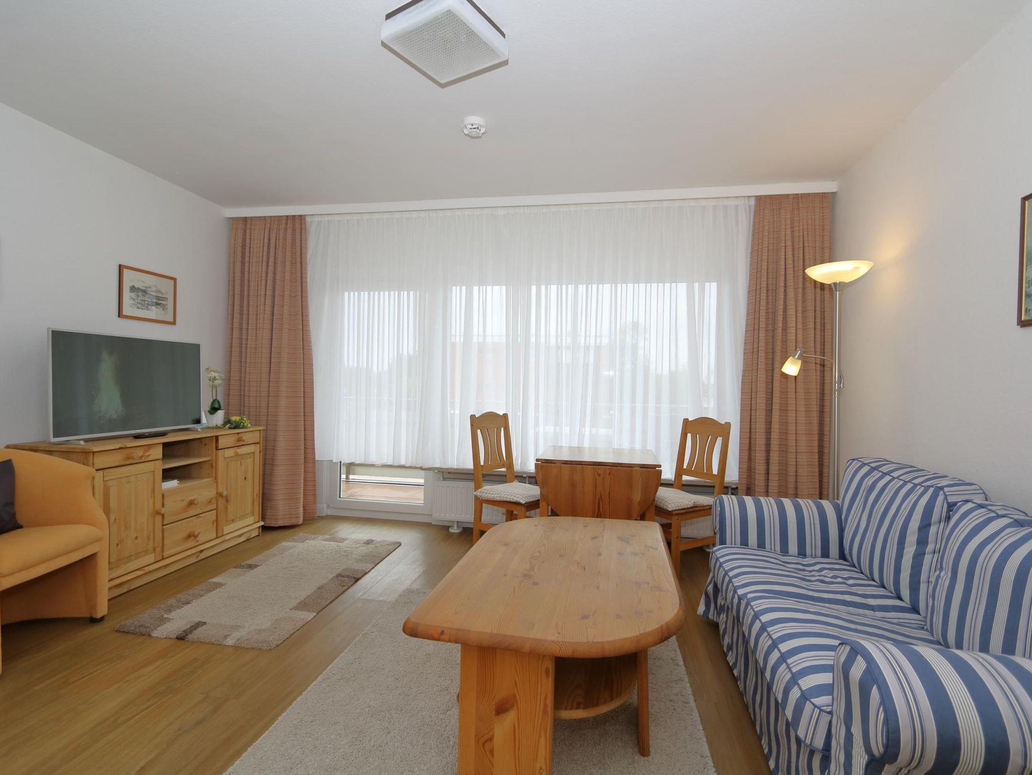 Ein helles Wohnzimmer mit großer Fensterfront und Zugang zum Balkon.TV SAT/Kabel, Kleiderschrank, Esstisch, Schrankbett (160x200 cm), Sofa, Sessel