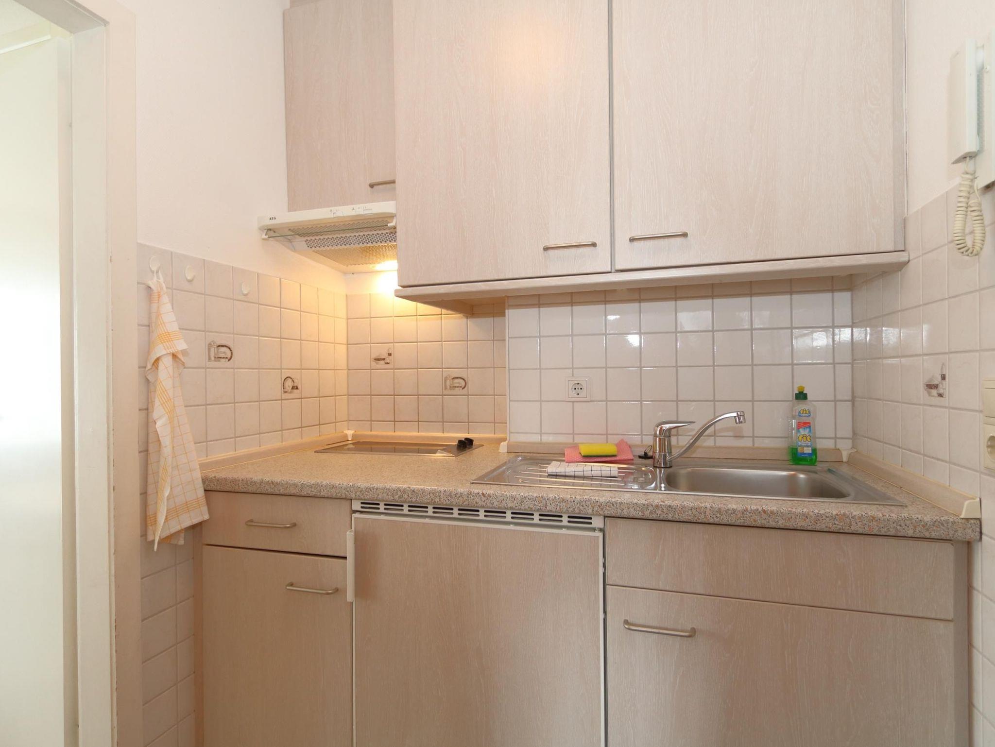 Kühlschrank, Wasserkocher, Kaffeemaschine, Toaster, 2-Plattenherd, Ceran-Kochfeld, Geschirr